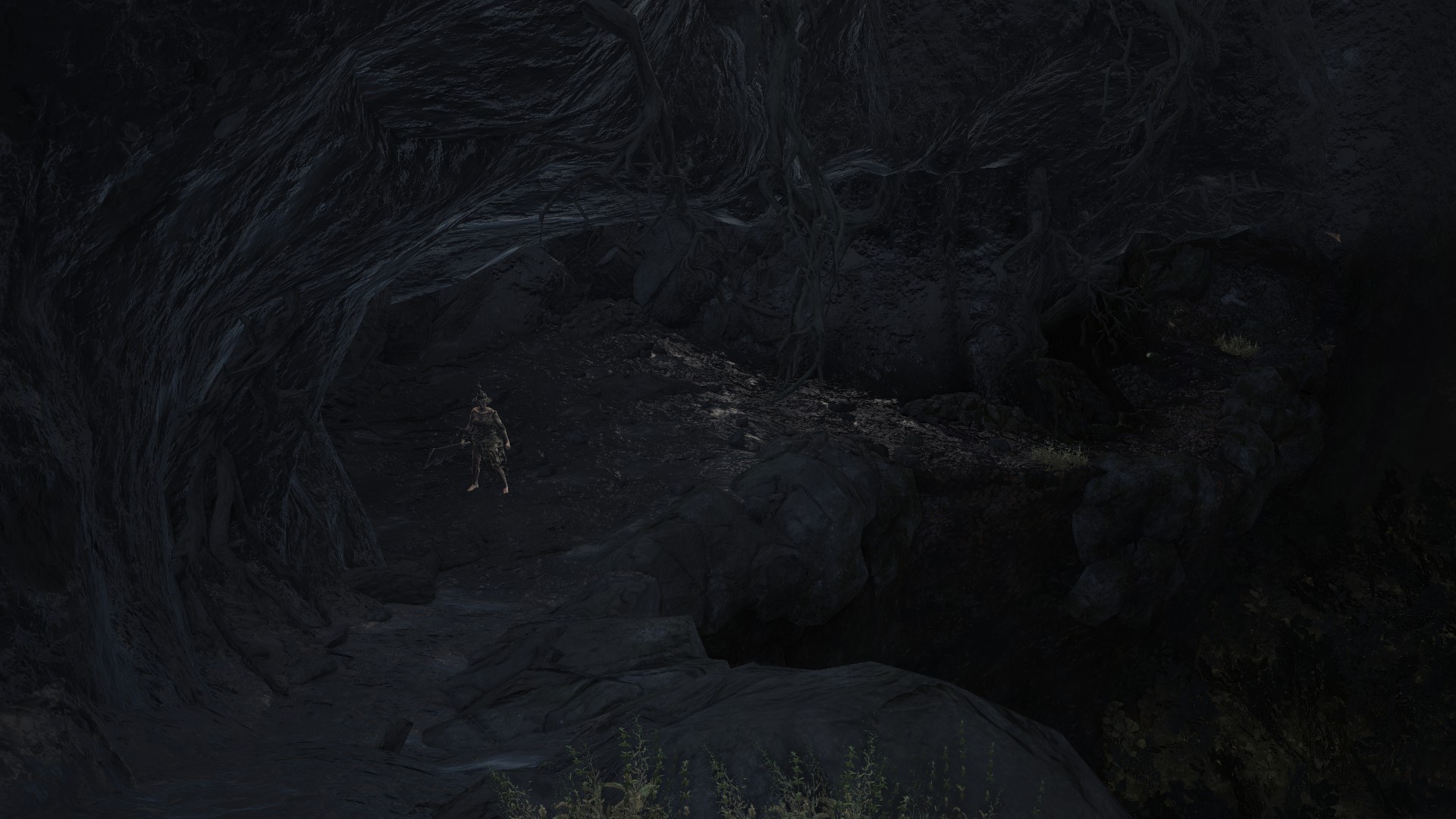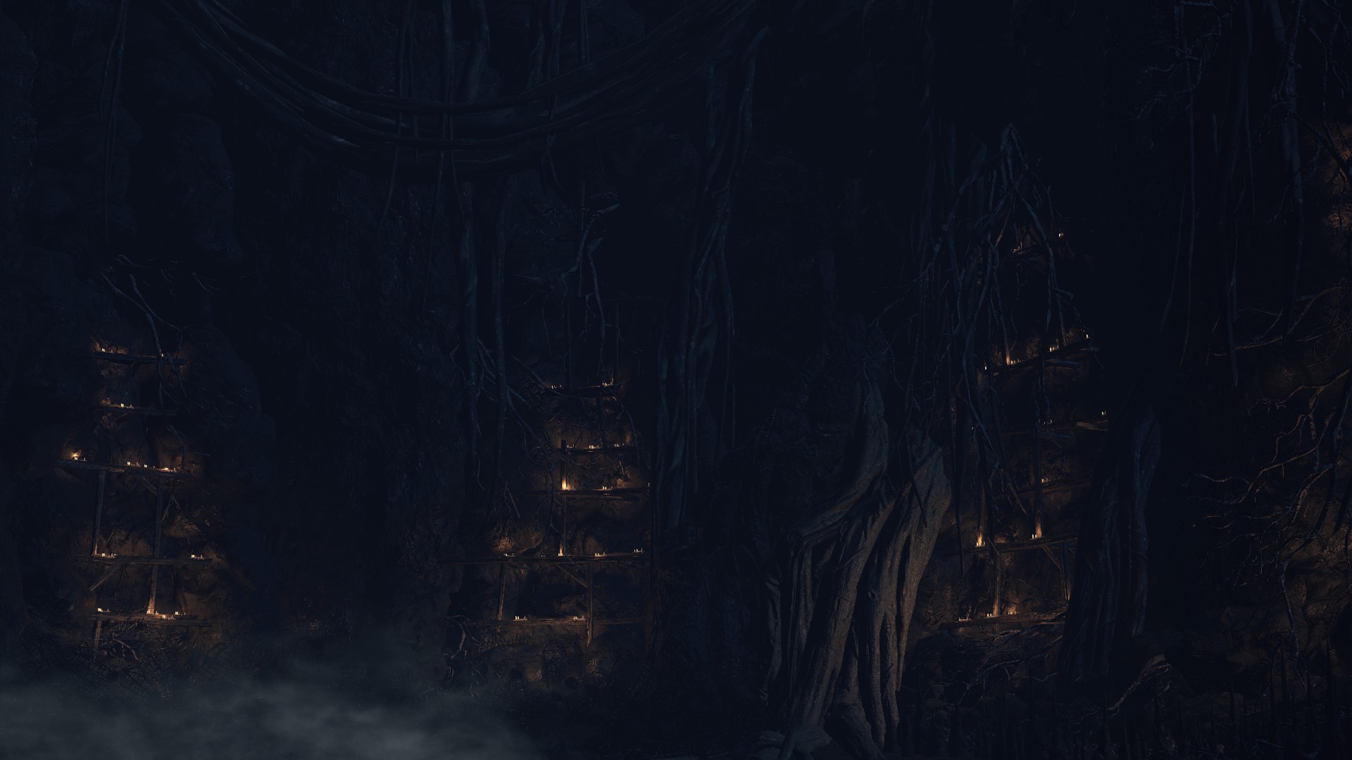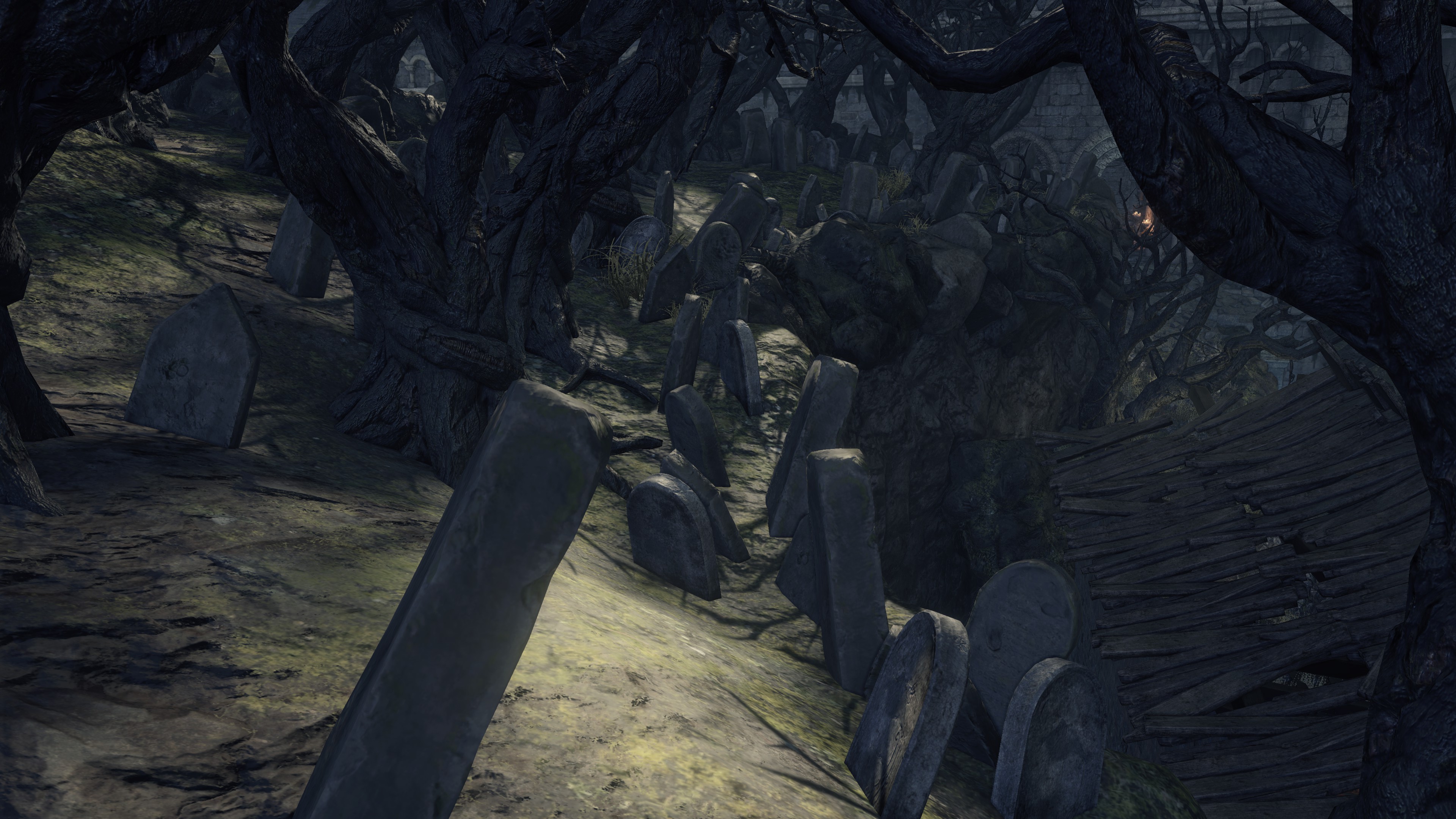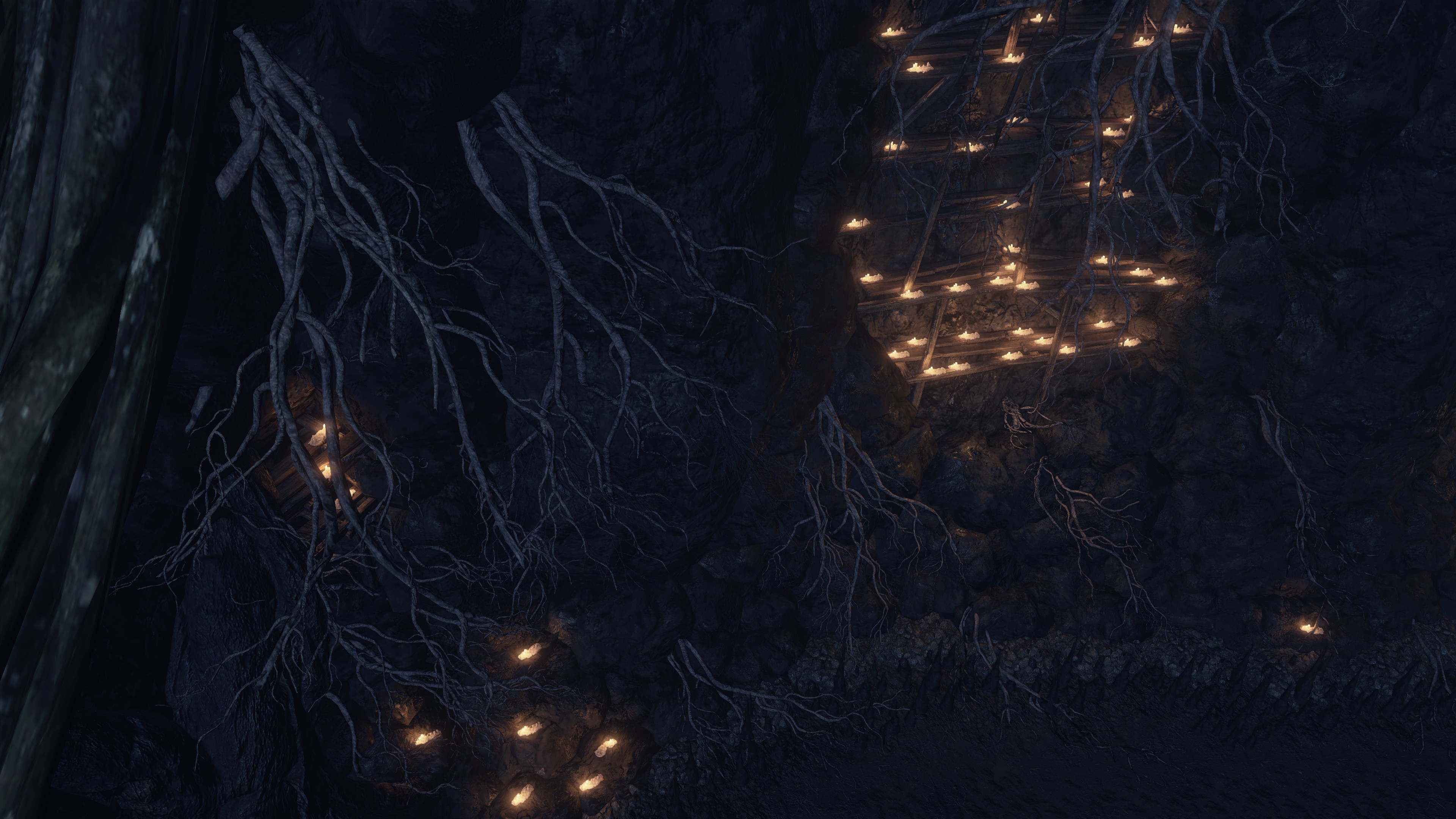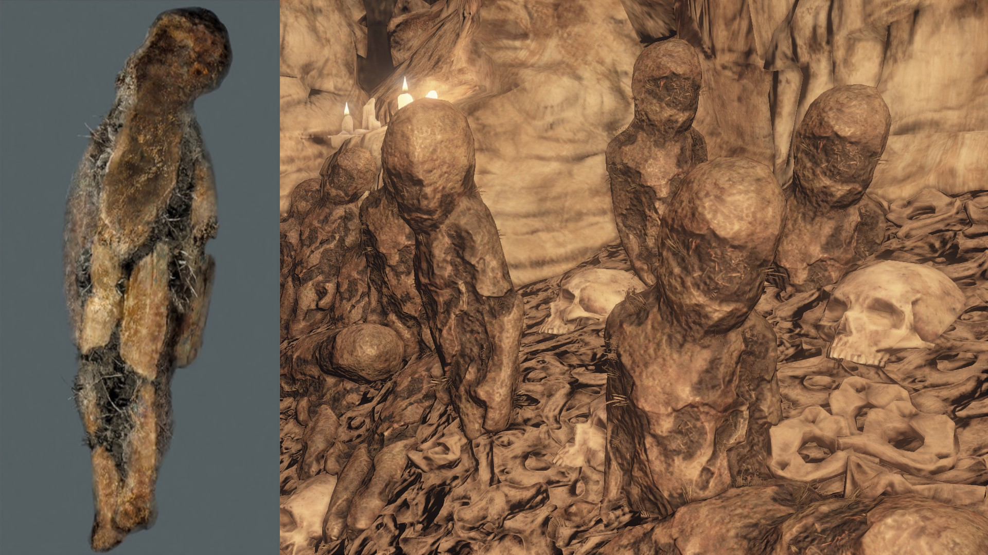 Beneath the shrine hides the Pit of Hollows, various wooden platforms and support beams installed to help citizens safely scale down it. The pile of bagged corpses and cages at the back are dumped by manservants, one of whom can transport us to the pit prior to the Greatwood boss battle. This plus the headstones dotting in the courtyard overhead suggest that this pit is a burial ground; to that point, the shrine does adjoin the town cemetery proper. And among the Mound-makers’ altar up front is what appears to be more corpses, plants sprouting between earthy breaks in their stone skin. Townsfolk have already been suffering from the metaphysical petrification and dendrification — apparently lazing around town awaiting the world’s stagnation to take them — as have the local skeletons buried in the old crypt. But based on the depth of the pit and the statuesque bodies’ current condition, these are the earliest residents, buried before the town developed its current burial practices. Because they weren’t properly dissected, their rotting flesh had ample opportunity to completely petrify and dendrify.