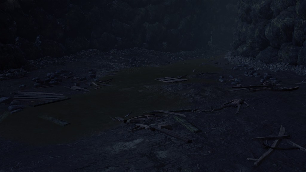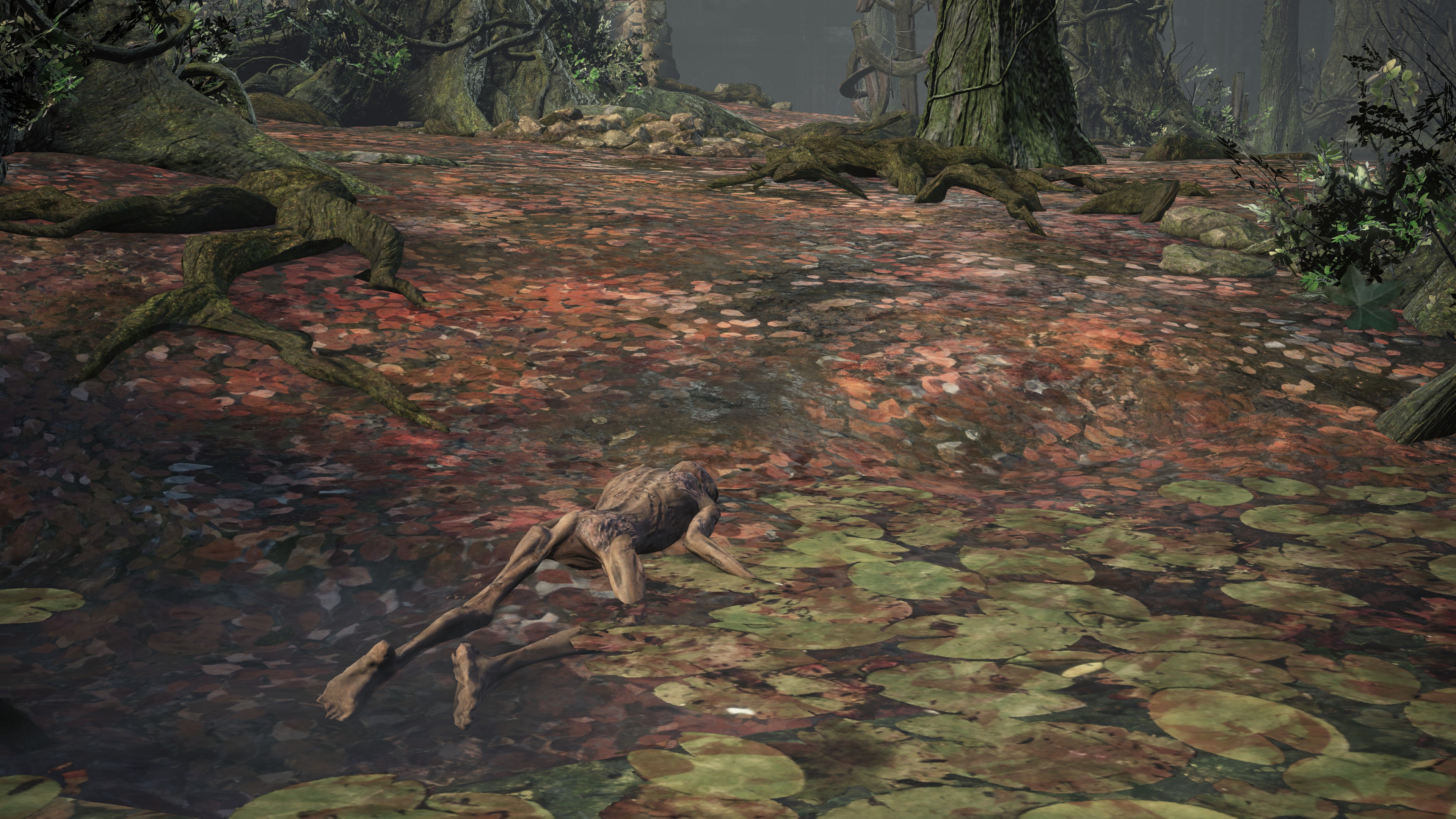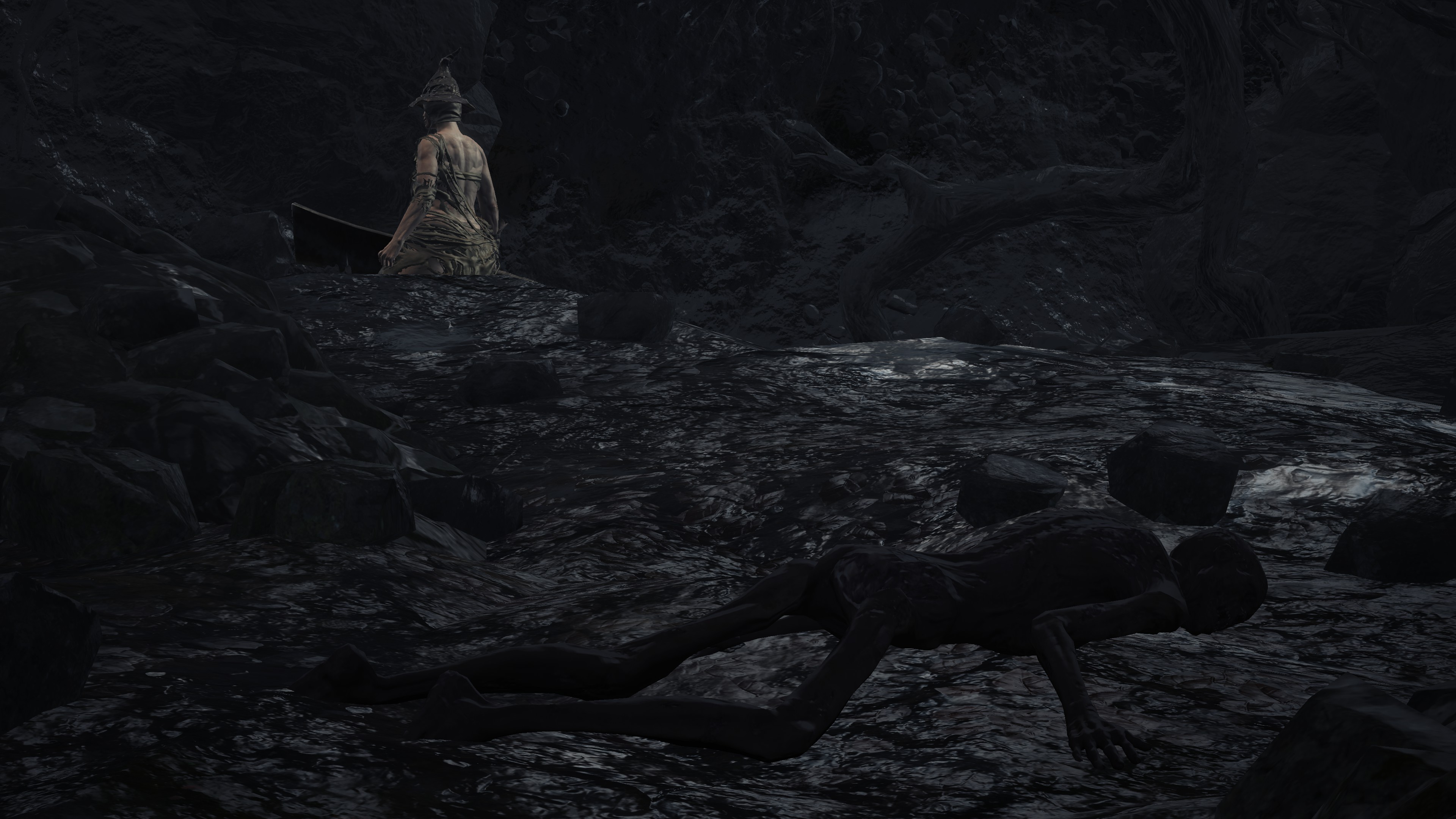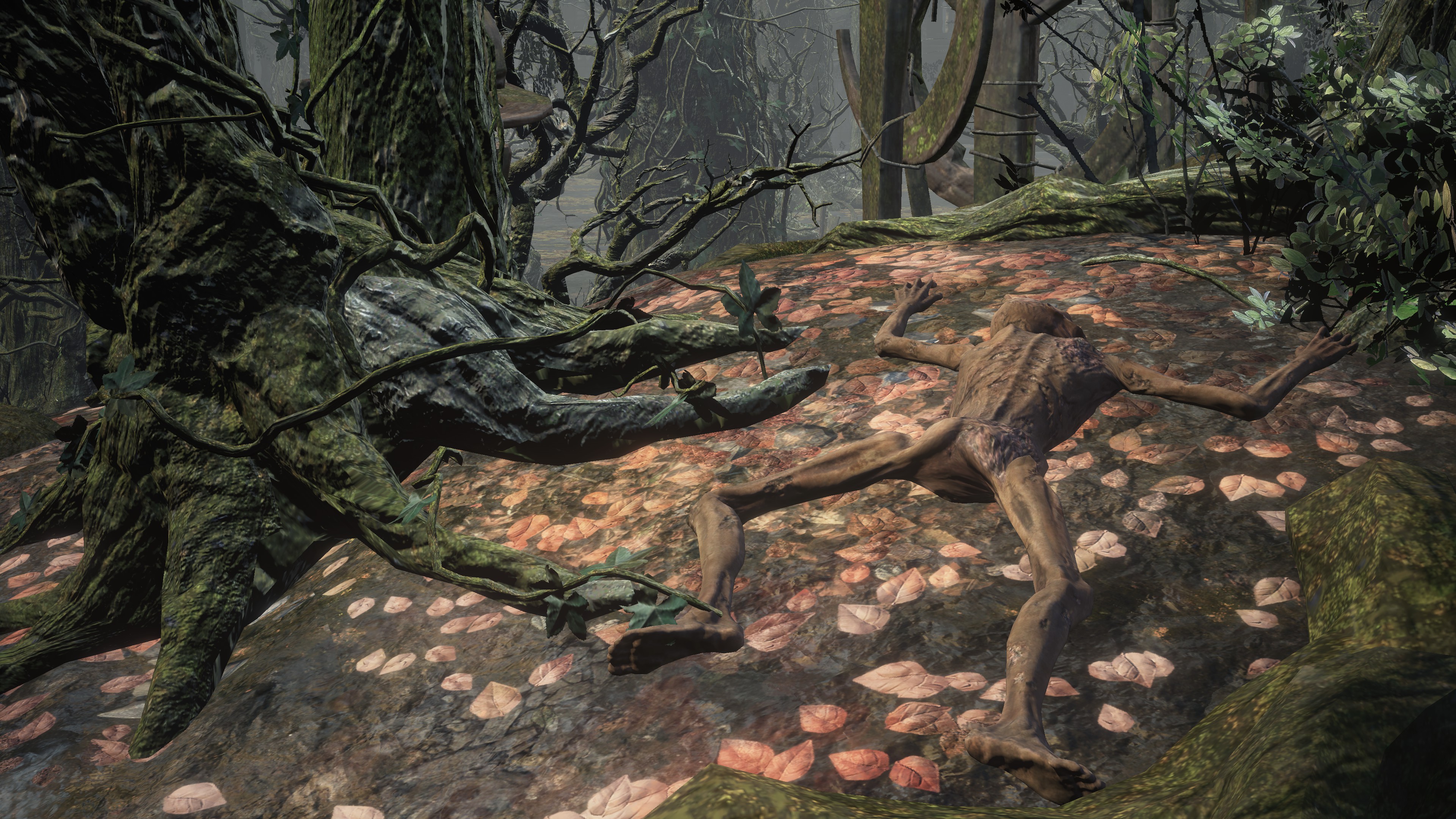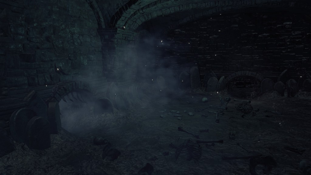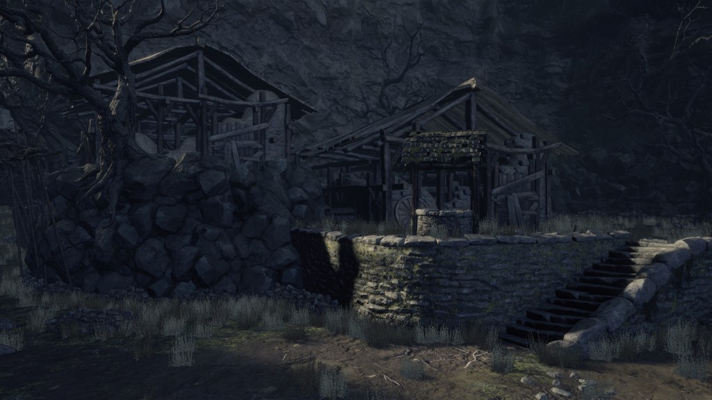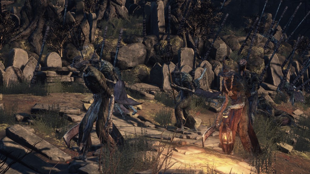 Beneath the shrine hides the Pit of Hollows, various wooden platforms and support beams installed to help citizens safely scale down it. The pile of bagged corpses and cages at the back are dumped by manservants, one of whom can transport us to the pit prior to the Greatwood boss battle. This plus the headstones dotting in the courtyard overhead suggest that this pit is a burial ground; to that point, the shrine does adjoin the town cemetery proper. And among the Mound-makers’ altar up front is what appears to be more corpses, plants sprouting between earthy breaks in their stone skin. Townsfolk have already been suffering from the metaphysical petrification and dendrification — apparently lazing around town awaiting the world’s stagnation to take them — as have the local skeletons buried in the old crypt. But based on the depth of the pit and the statuesque bodies’ current condition, these are the earliest residents, buried before the town developed its current burial practices. Because they weren’t properly dissected, their rotting flesh had ample opportunity to completely petrify and dendrify.