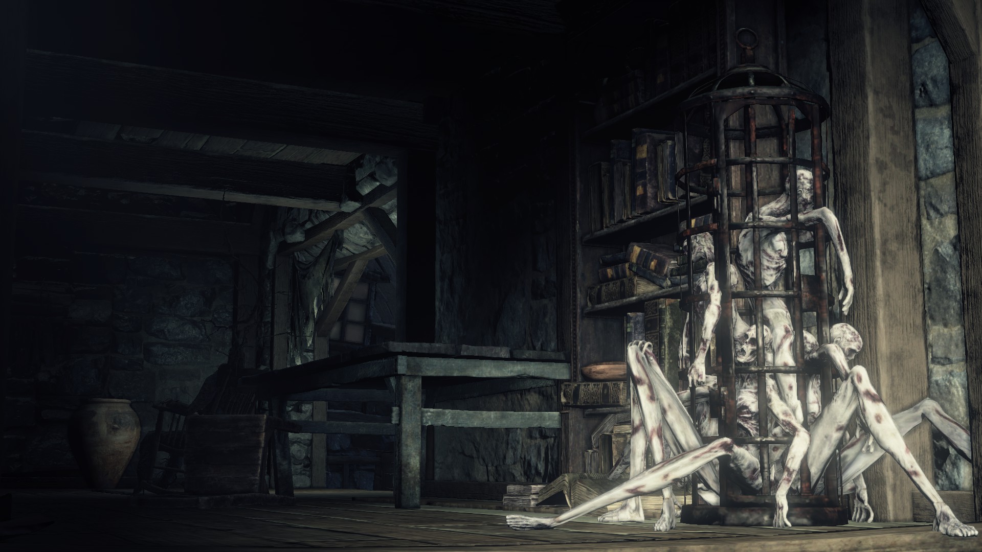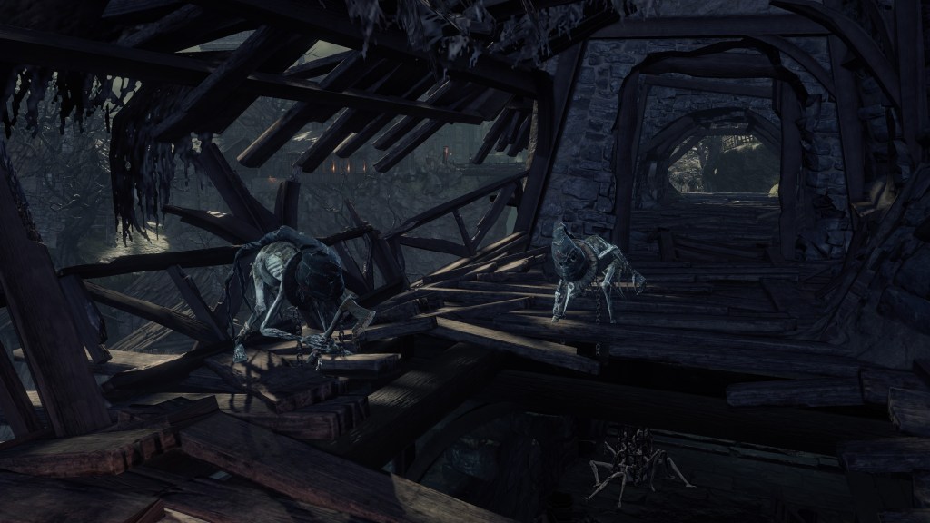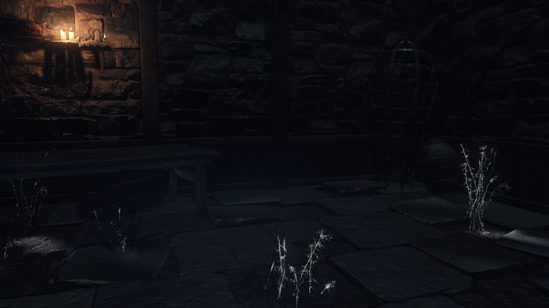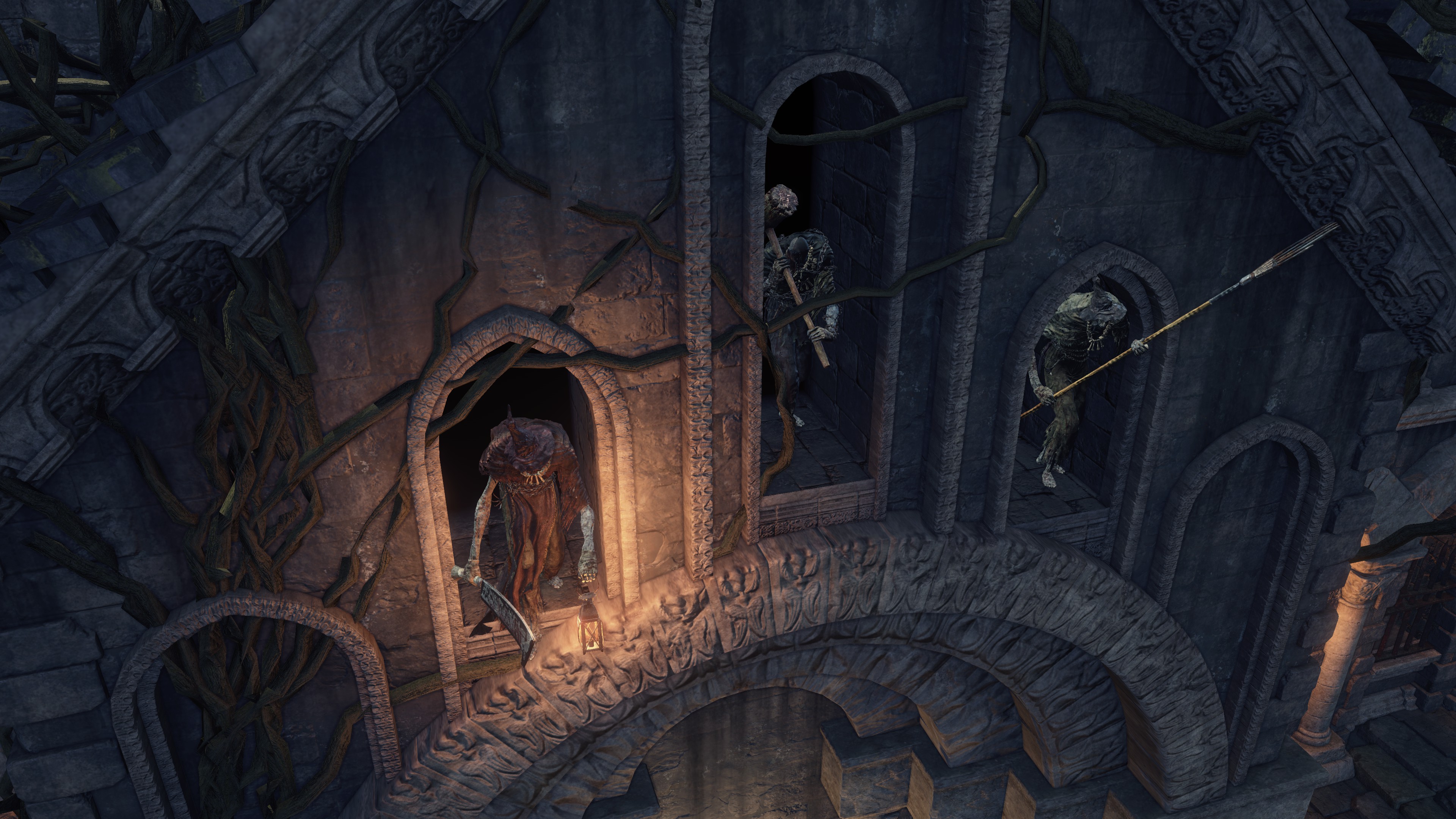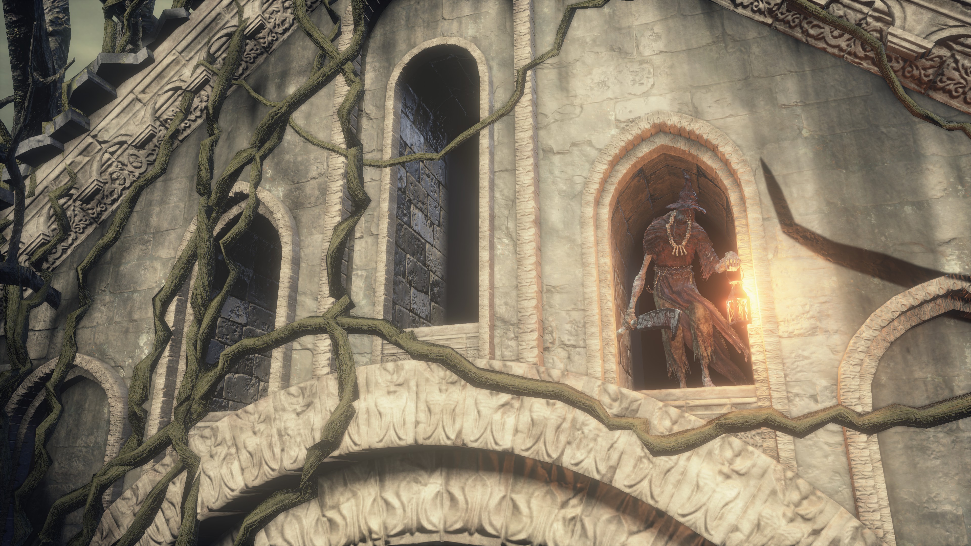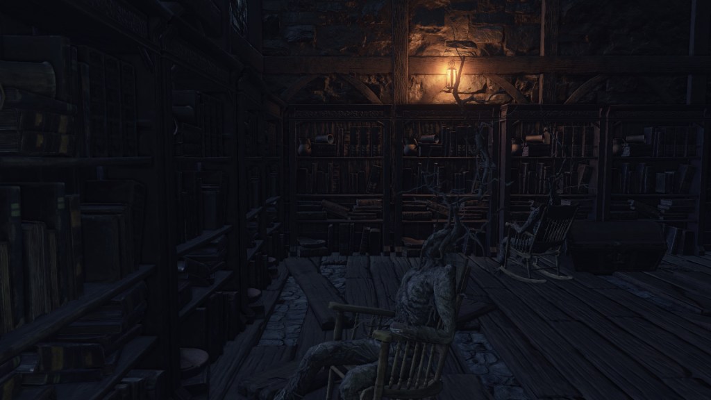 The citizens’ piety is very much intertwined with fear, their entire lives revolving around staving off the curse one way or another until they find salvation. But between the inevitability of hollowing and eternally combating the random rampages of humanity, some might lapse in their moral standards are to be expected. We can find some human pine resin in a chest in what looks to be the town library, right before the books. Combined with the laboratory experiment table from DS2 stuffed in a nearby corner, and it seems like at least some citizens were curious enough to inquire about the unholy substances they combated. Such inquiries may be innocent on their face, but it is almost too common for such curiosities to result in embracing the Dark. Indeed, fallen to the Dark or no, some have definitely taken to the idea of eating life.