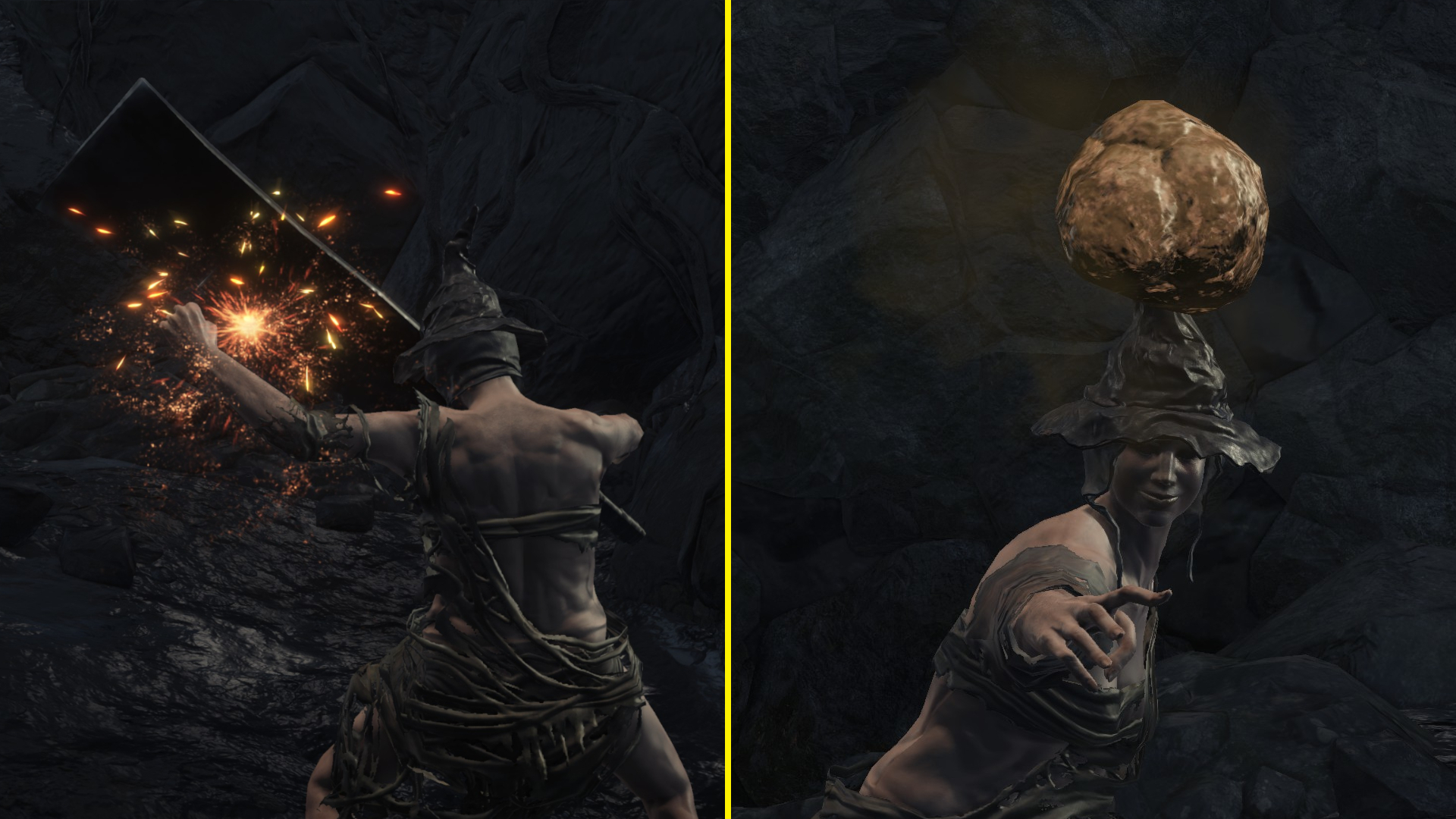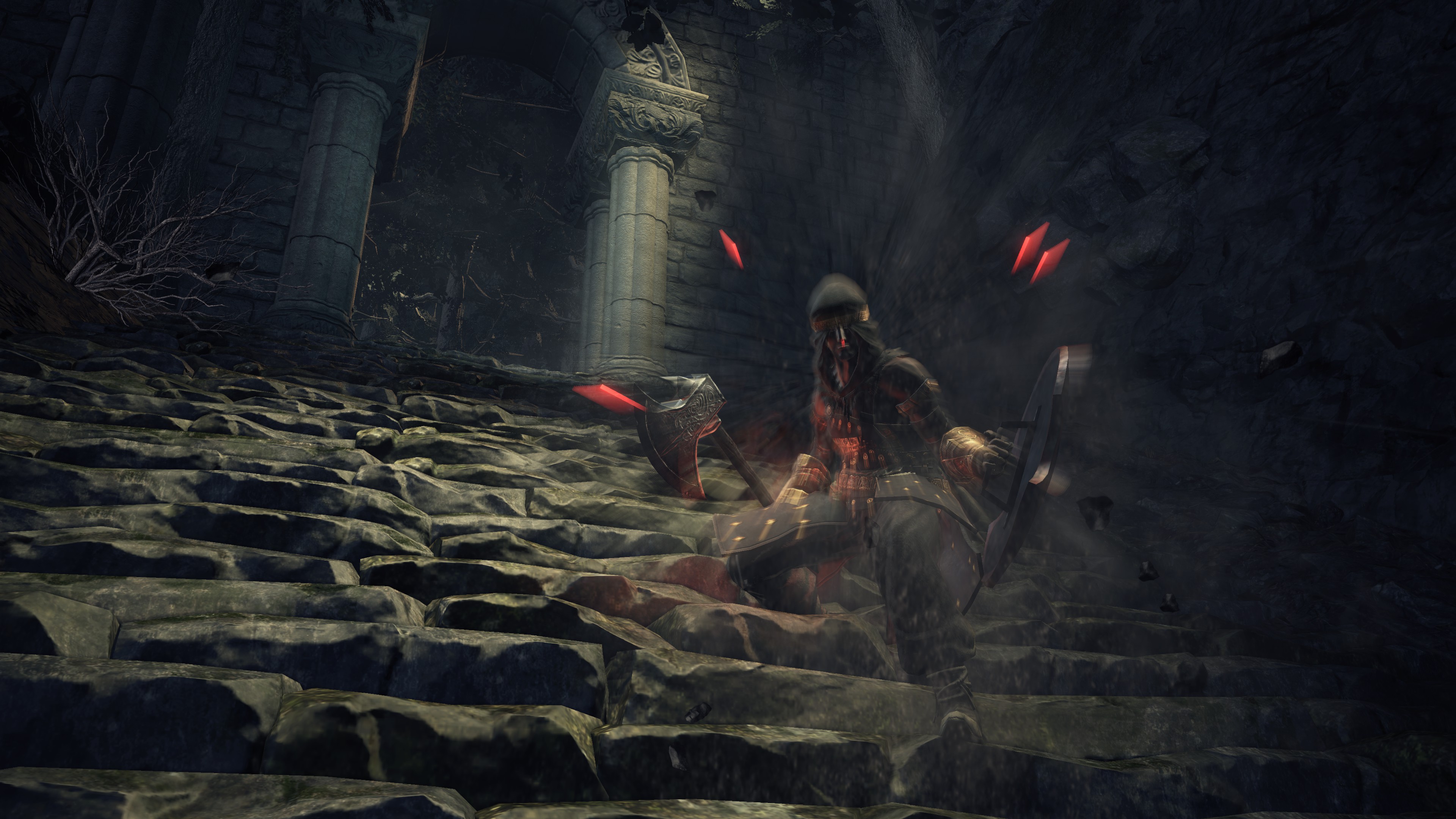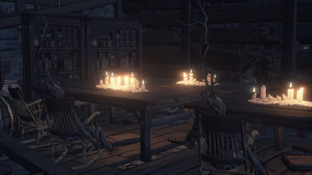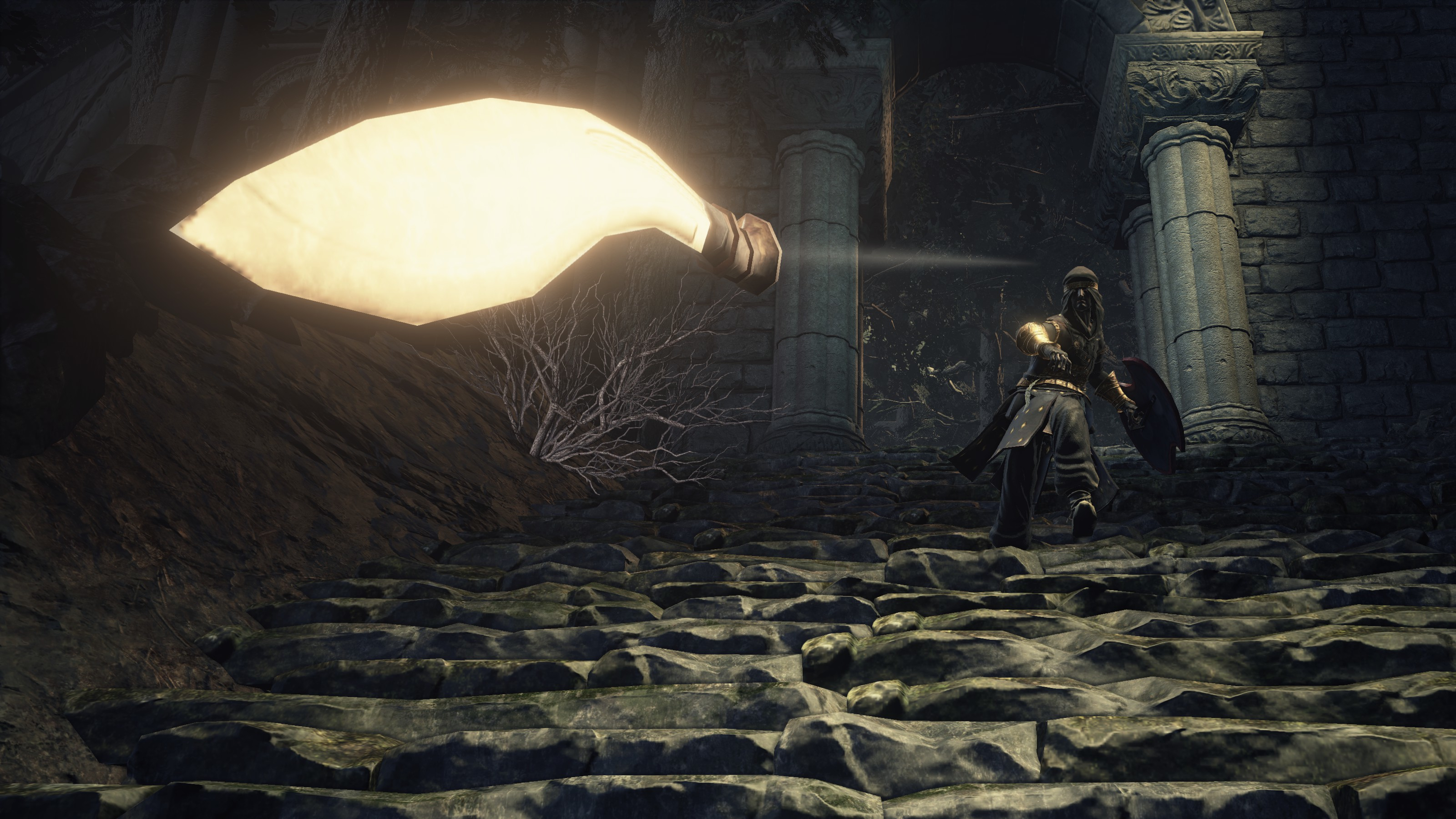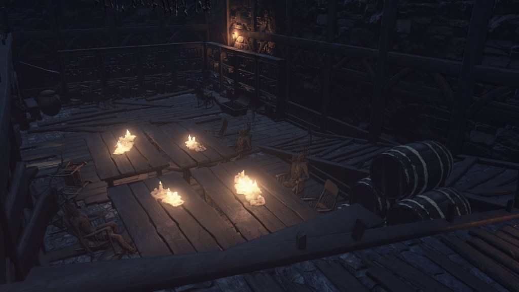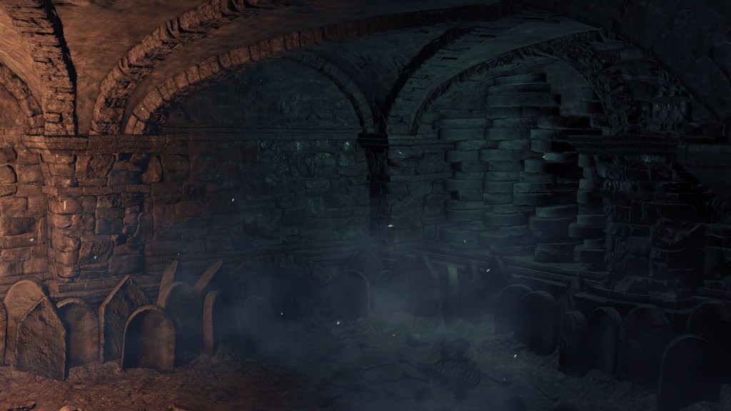 The citizens’ piety is very much intertwined with fear, their entire lives revolving around staving off the curse one way or another until they find salvation. But between the inevitability of hollowing and eternally combating the random rampages of humanity, some might lapse in their moral standards are to be expected. We can find some human pine resin in a chest in what looks to be the town library, right before the books. Combined with the laboratory experiment table from DS2 stuffed in a nearby corner, and it seems like at least some citizens were curious enough to inquire about the unholy substances they combated. Such inquiries may be innocent on their face, but it is almost too common for such curiosities to result in embracing the Dark. Indeed, fallen to the Dark or no, some have definitely taken to the idea of eating life.