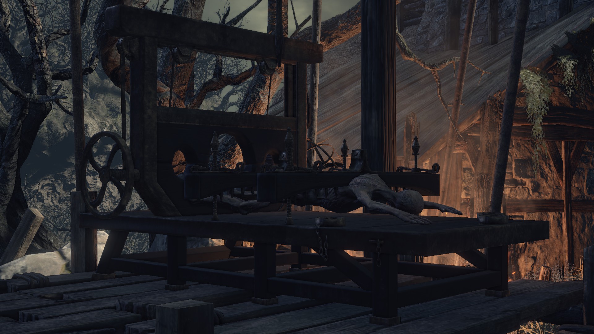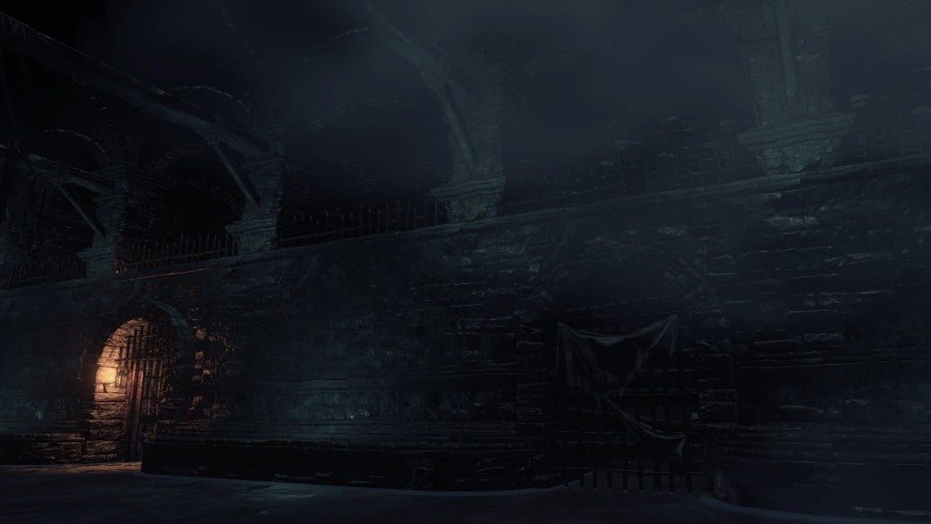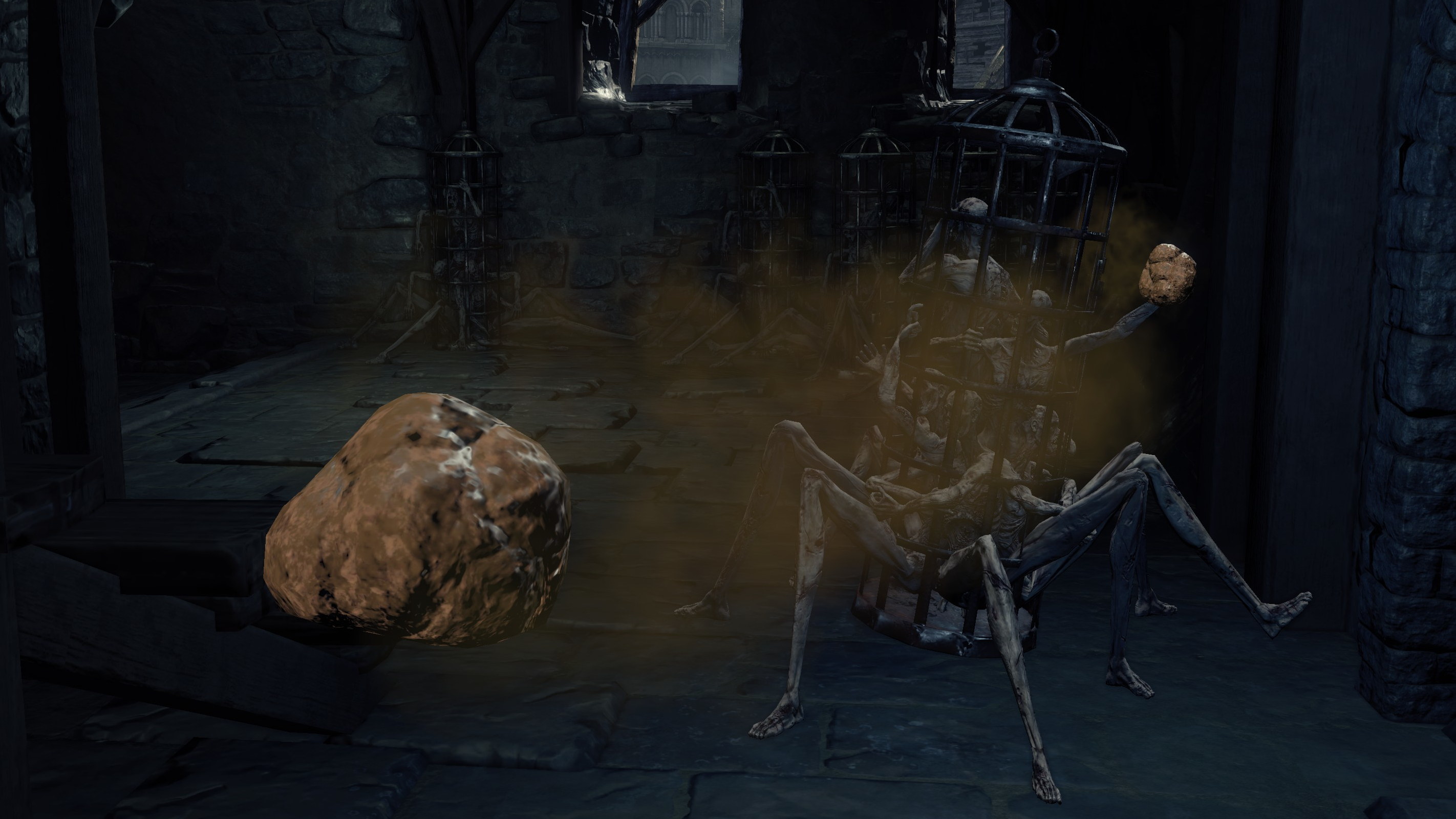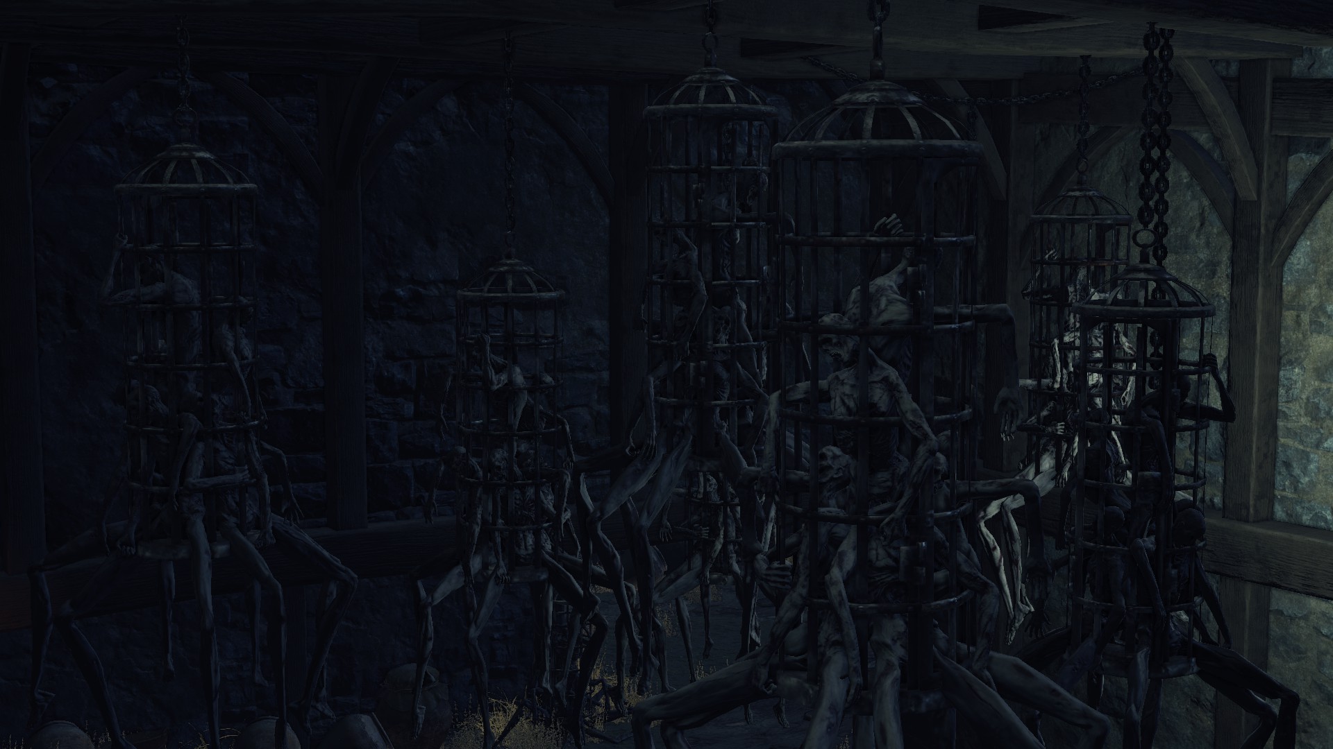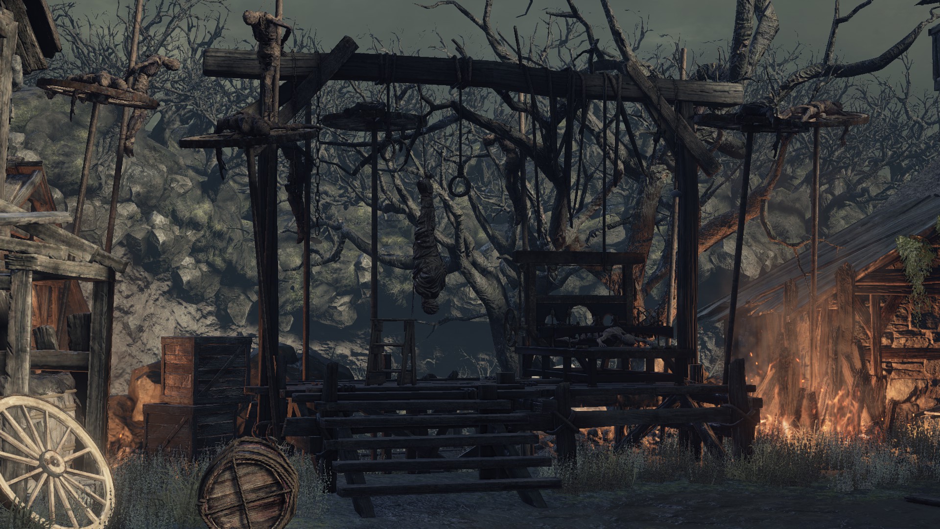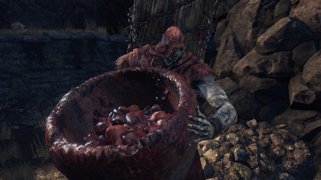 None of these are folk that anyone would care to see gone. But Isabella’s current choice of prey is out of necessity rather than preference, as she is no longer a town resident. She is fending for herself in the wild with nothing but her carving knife; not even an Estus Flask, at least a full one. And seeing the tattered state of her clothes and dung pies she can hurl, it is no easy living out there. Isabella was most likely herself banished from decent society for her crimes, much like Maneater Mildred in DS1. This is peculiar given that the town has a public gallows as well as a small jailhouse in front of the church, repurposing part of the old sewer system. Even assuming the former a recent addition, the community still had the ability to lock up one of their own and punish them with death. Perhaps like curses, deviant behavior was something to seal away rather than tempt fate trying to destroy. Or perhaps it was feasting on just corpse flesh that saved her from the chopping block. Either way, this policy of mercy evidently didn’t last.