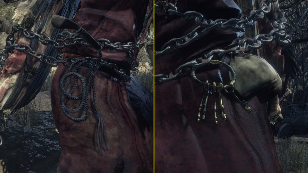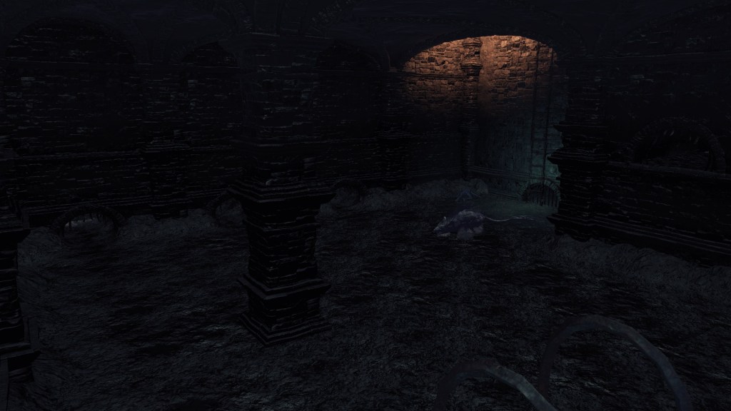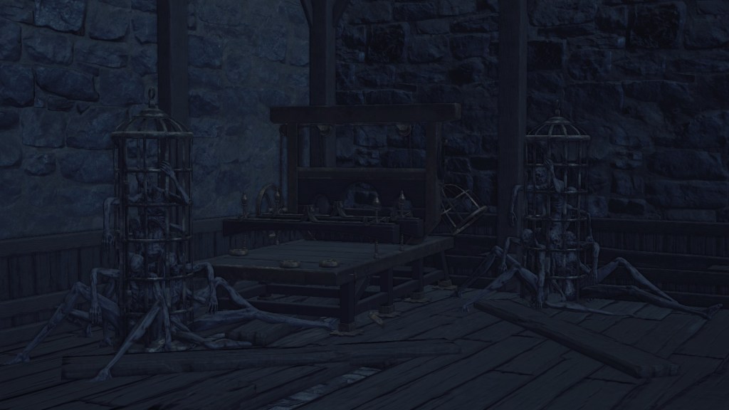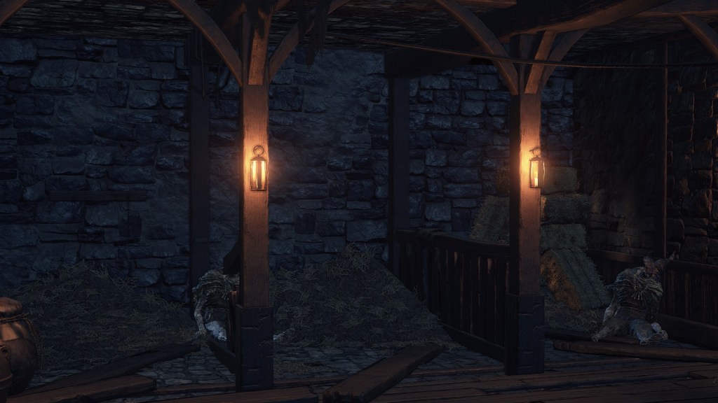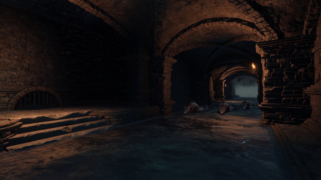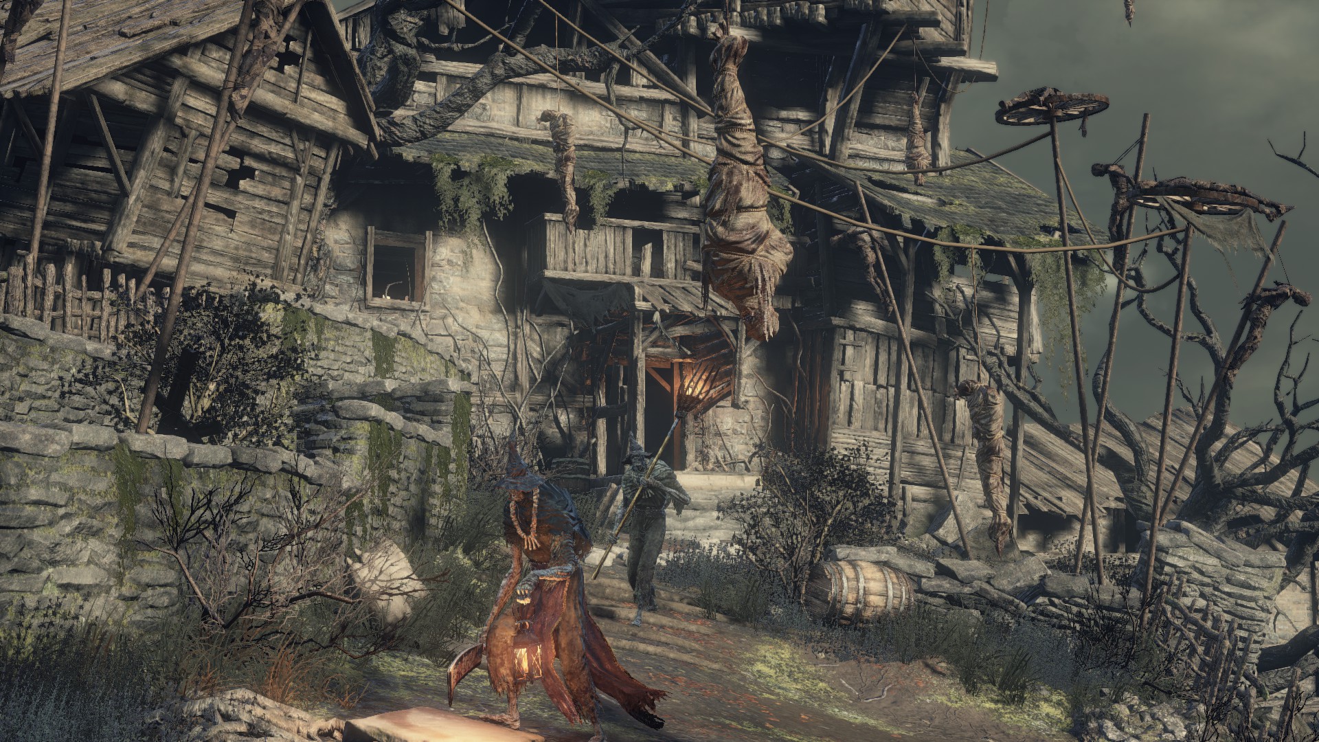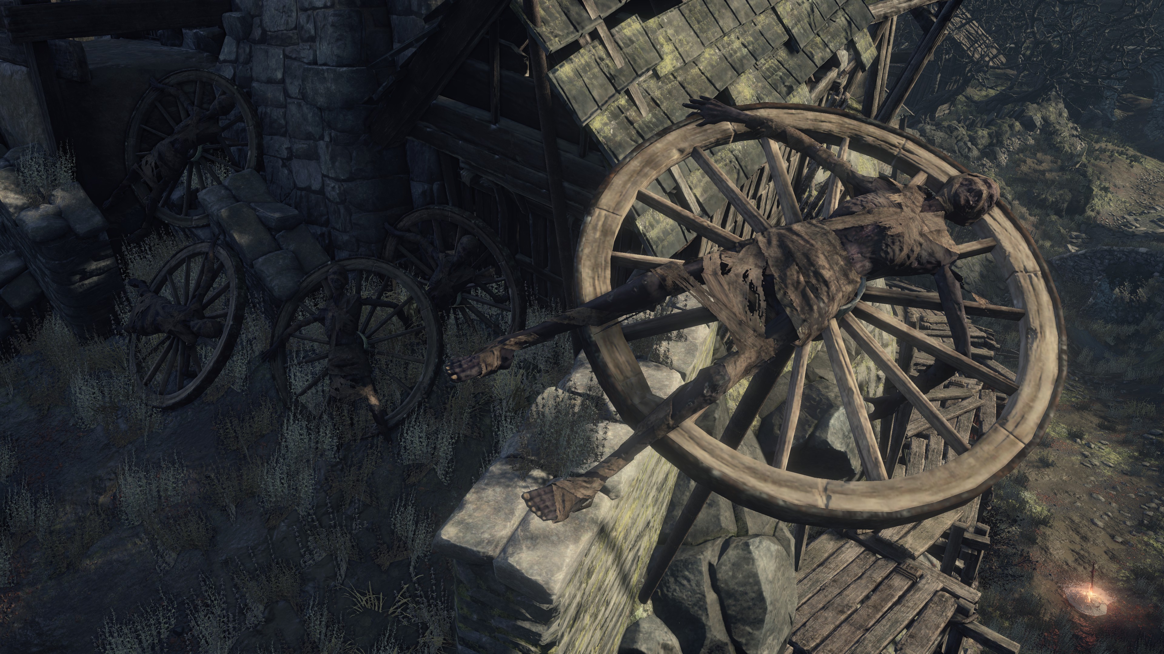 None of these are folk that anyone would care to see gone. But Isabella’s current choice of prey is out of necessity rather than preference, as she is no longer a town resident. She is fending for herself in the wild with nothing but her carving knife; not even an Estus Flask, at least a full one. And seeing the tattered state of her clothes and dung pies she can hurl, it is no easy living out there. Isabella was most likely herself banished from decent society for her crimes, much like Maneater Mildred in DS1. This is peculiar given that the town has a public gallows as well as a small jailhouse in front of the church, repurposing part of the old sewer system. Even assuming the former a recent addition, the community still had the ability to lock up one of their own and punish them with death. Perhaps like curses, deviant behavior was something to seal away rather than tempt fate trying to destroy. Or perhaps it was feasting on just corpse flesh that saved her from the chopping block. Either way, this policy of mercy evidently didn’t last.