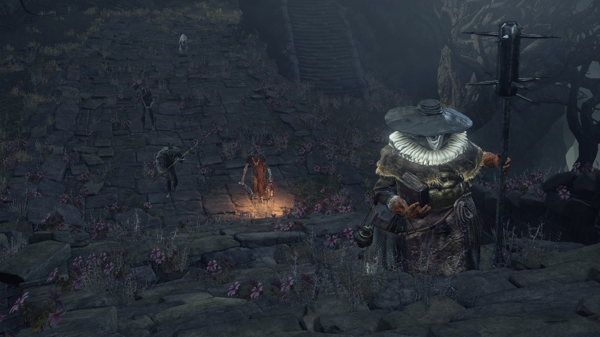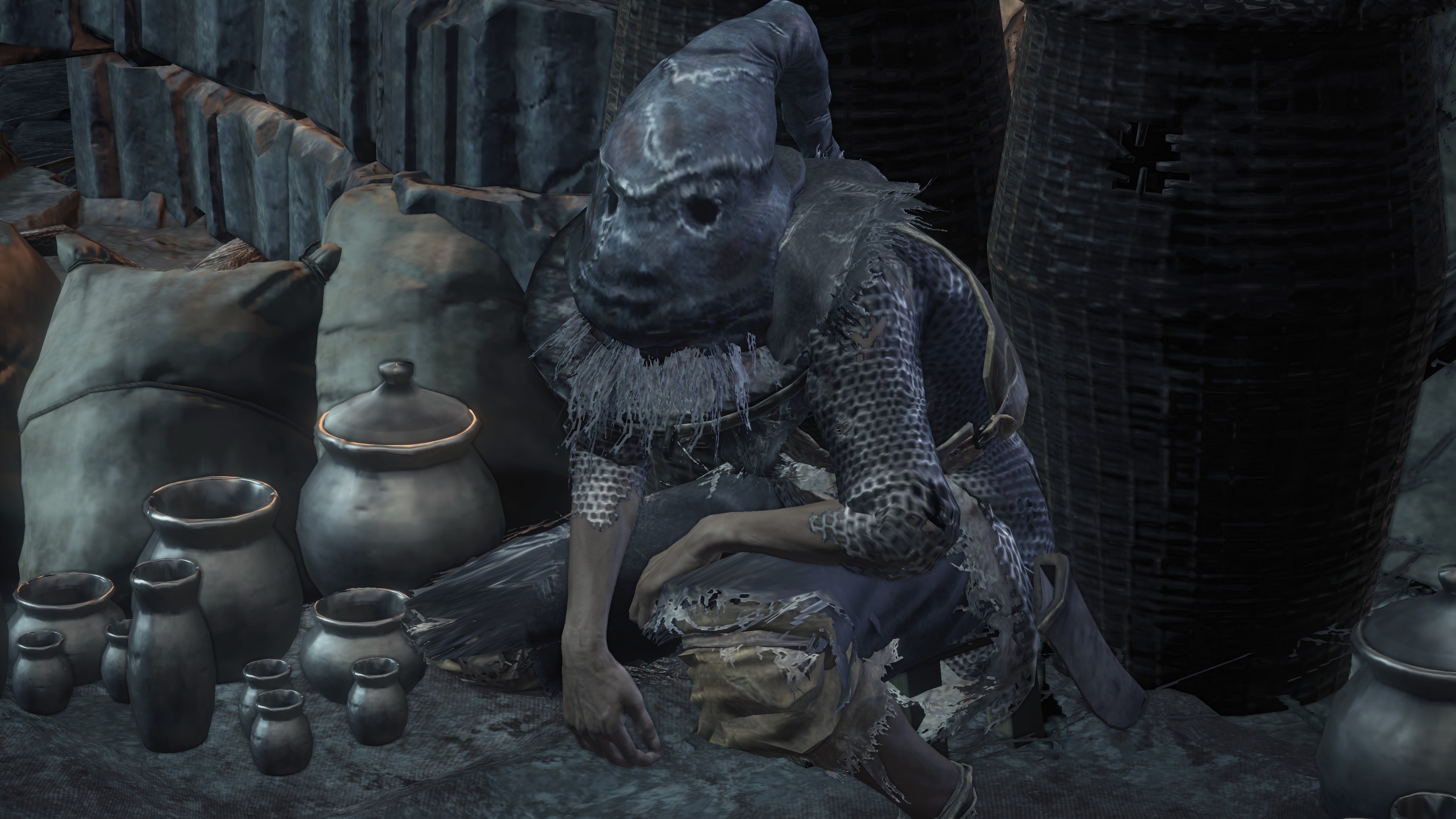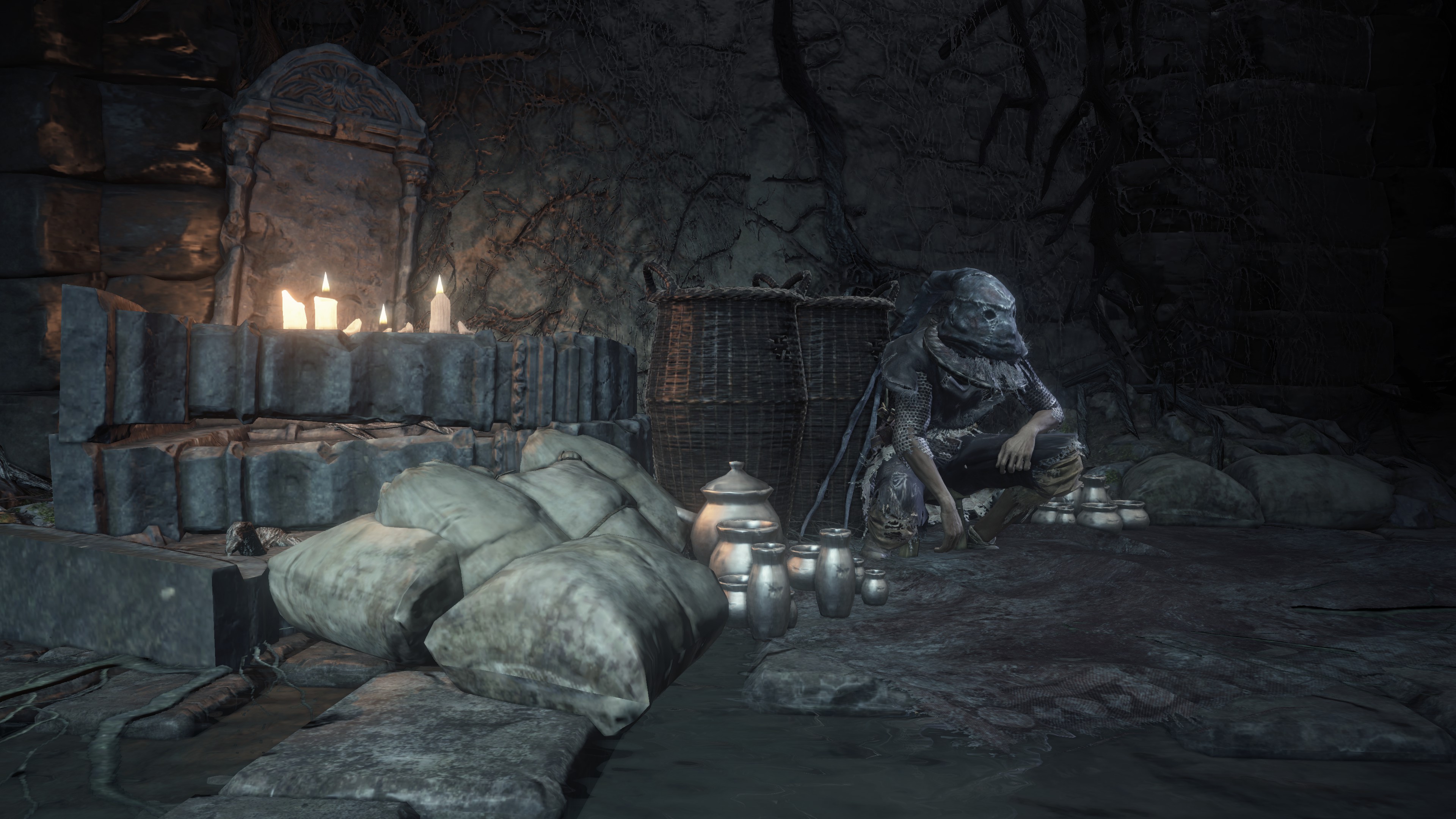 Various items related to Way of White holy men and women dot the settlement or are sold by Greirat, suggesting the church’s outsized presence in town. The blue robes of one such cleric denotes the curse, and he sits on one of the dilapidated homes. That being the case, some clergy most likely decided to stay as local pastors rather than continue onto Lothric as part of the standard Undead mission. There is a church building on the far end of town, so the citizens are undoubtedly god-fearing people looking for spiritual guidance. In fact, their piety seems to have been influenced in part by their work. The clothes they wear is a uniform for said work in ceremonies — a secretive kind of ceremonies if the cut description for the Bloodied Short Sword used by some citizens is to be believed. At the very least, these funerary practices are a tradition that has some absolutely terrifying horrors involved, which has caused all of the current residents to give up their work even if it means their uniform loses its meaning. And we can infer that these horrors relate to the Dark at the core of the townsfolks’ curse.