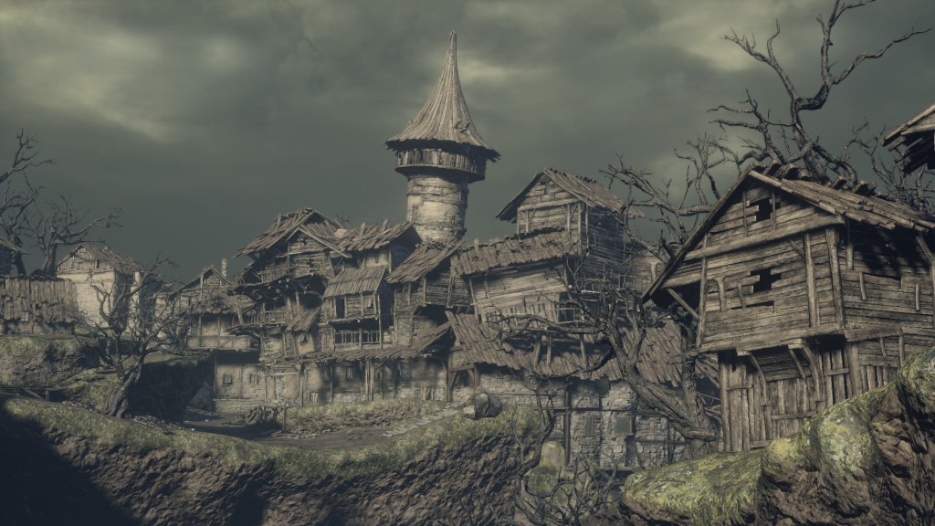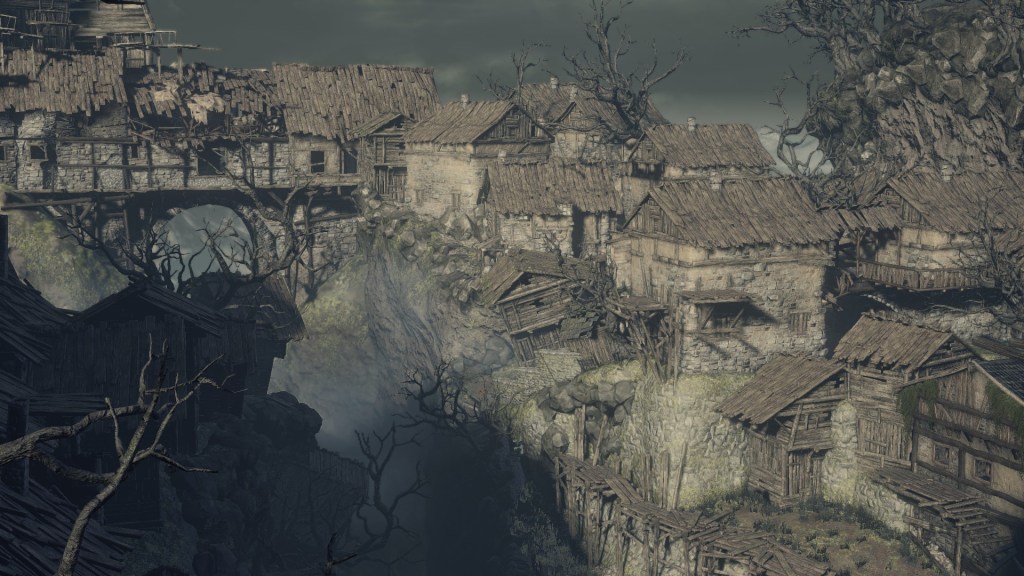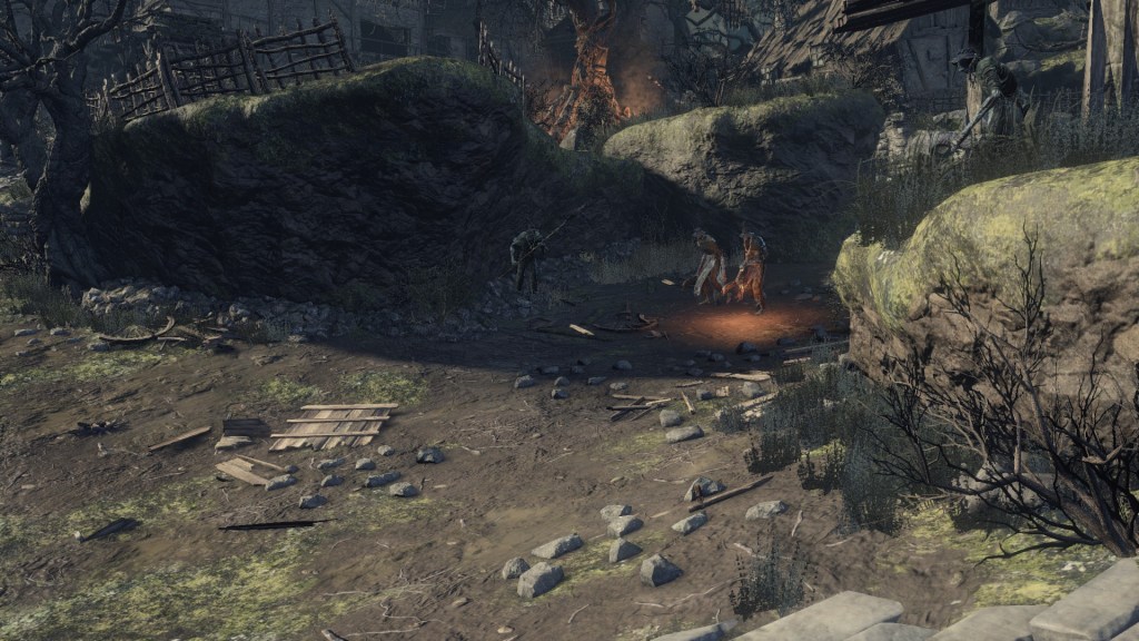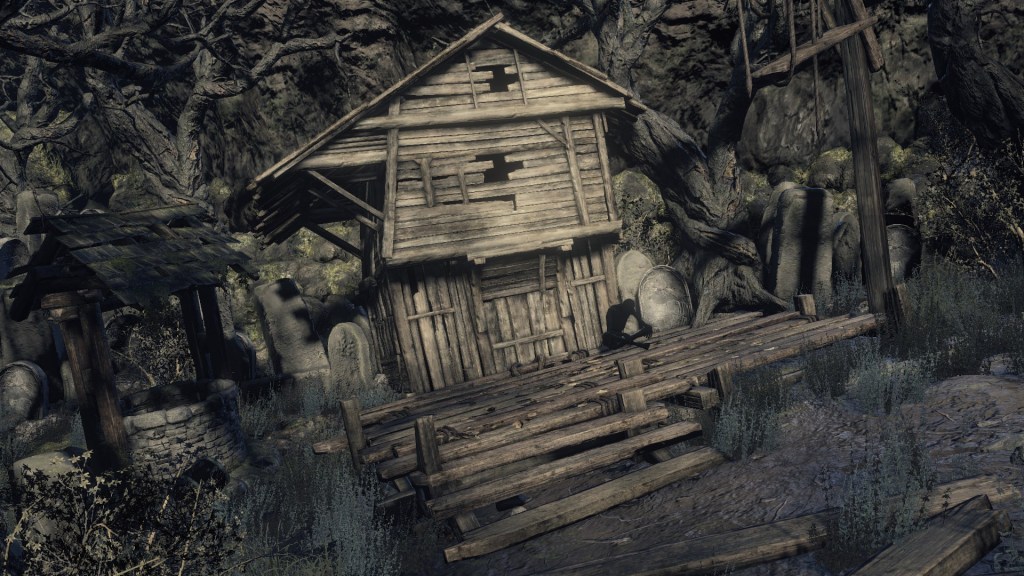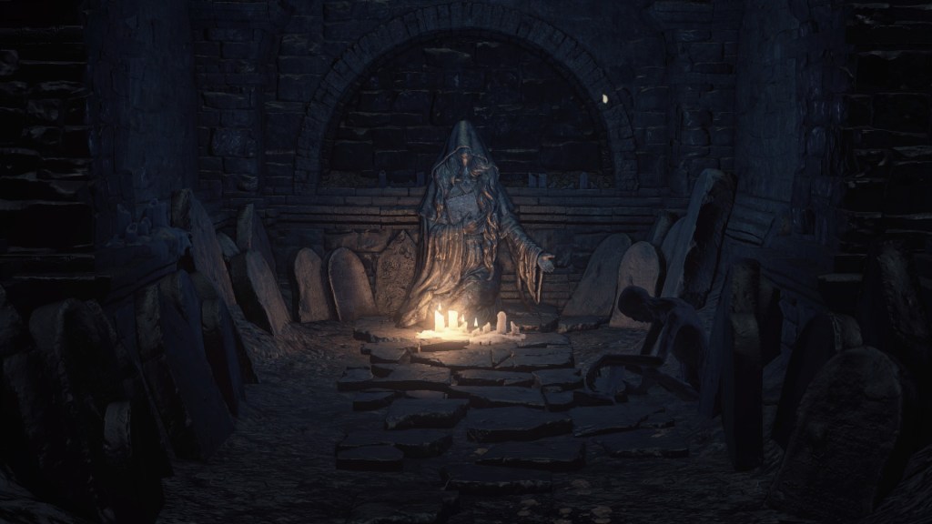Various items related to Way of White holy men and women dot the settlement or are sold by Greirat, suggesting the church’s outsized presence in town. The blue robes of one such cleric denotes the curse, and he sits on one of the dilapidated homes. That being the case, some clergy most likely decided to stay as local pastors rather than continue onto Lothric as part of the standard Undead mission. There is a church building on the far end of town, so the citizens are undoubtedly god-fearing people looking for spiritual guidance. In fact, their piety seems to have been influenced in part by their work. The clothes they wear is a uniform for said work in ceremonies — a secretive kind of ceremonies if the cut description for the Bloodied Short Sword used by some citizens is to be believed. At the very least, these funerary practices are a tradition that has some absolutely terrifying horrors involved, which has caused all of the current residents to give up their work even if it means their uniform loses its meaning. And we can infer that these horrors relate to the Dark at the core of the townsfolks’ curse.