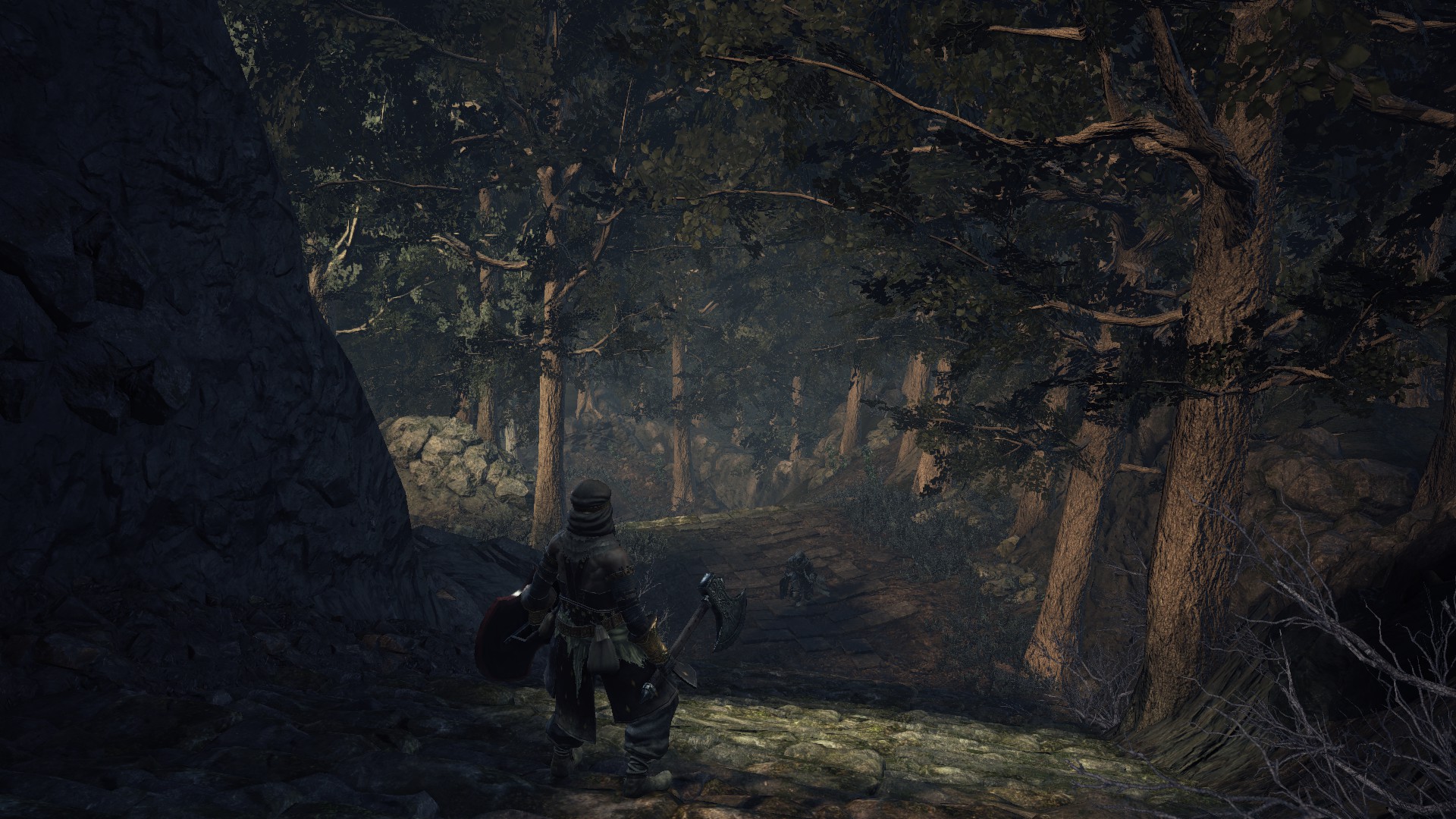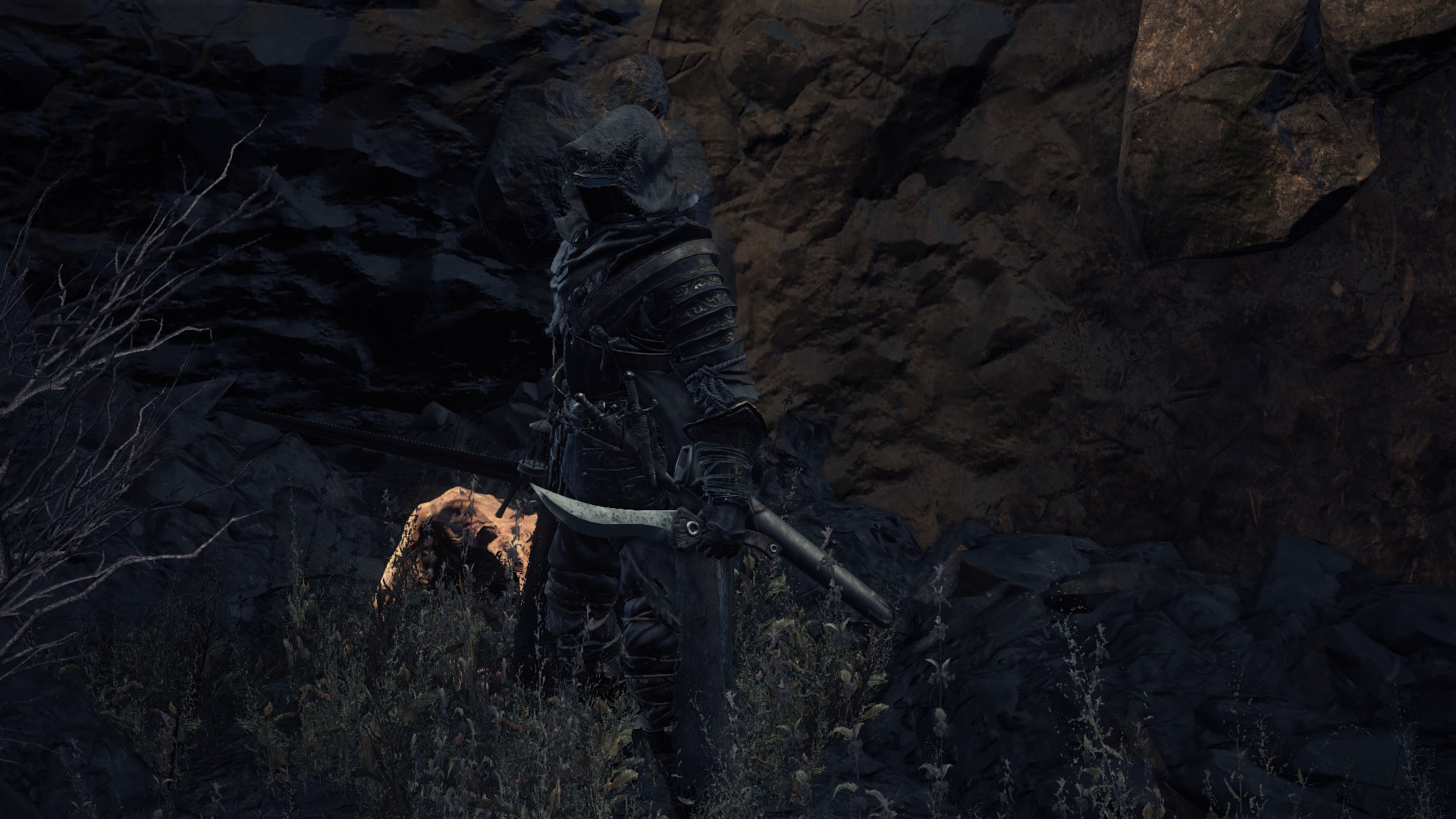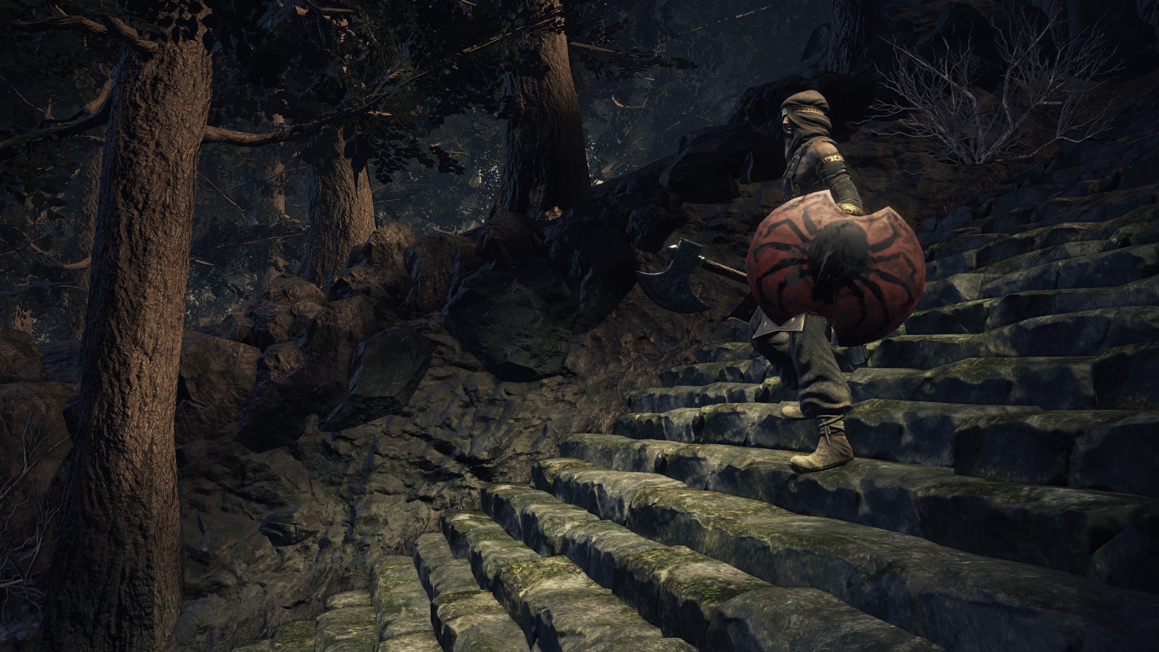 Handling twin daggers and axes, these “mountain bandits” (山賊) aren’t out of place in this rocky forest filled with steeps and slopes. Most are foreigners, apparently exiled from their homelands for their transgressions using the precedent exiling Undead. The forest has always attracted drifters according to the exile set’s description, likely because it lets such convicts prey on traffic to a major kingdom like Lothric whilst evading justice. This is a despite the risks to themselves, a corpse with the Twin Dragon Greatshield — chiefly associated with the thief Patches — proving the miscreants’ willingness to head so deep into the forest regardless. From the “safety” of fraught terrain, this mix of cutthroats might team up or backstab one another. Either way, one brigand showcases the fruits of these interactions, utilizing an Old World bandit’s attire and Spider Shield with a New World bandit’s axe. At the crossroads of so many areas, including the settlement, the forest of Farron has become the perfect hub for criminality.