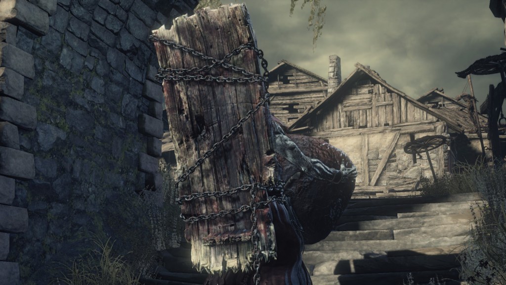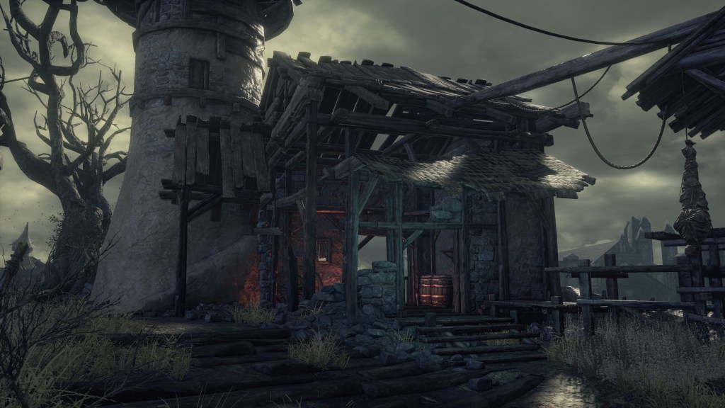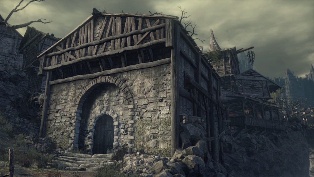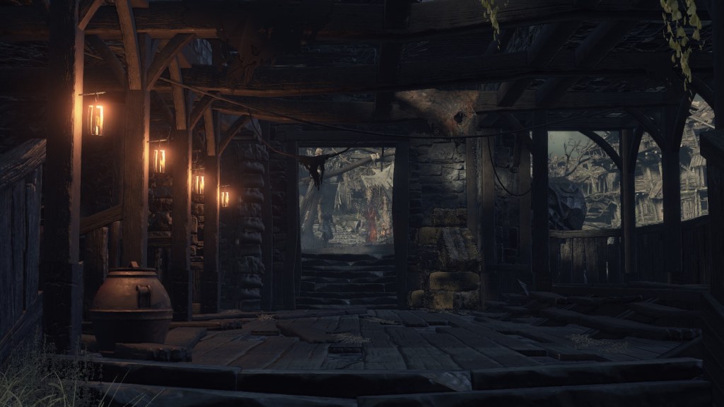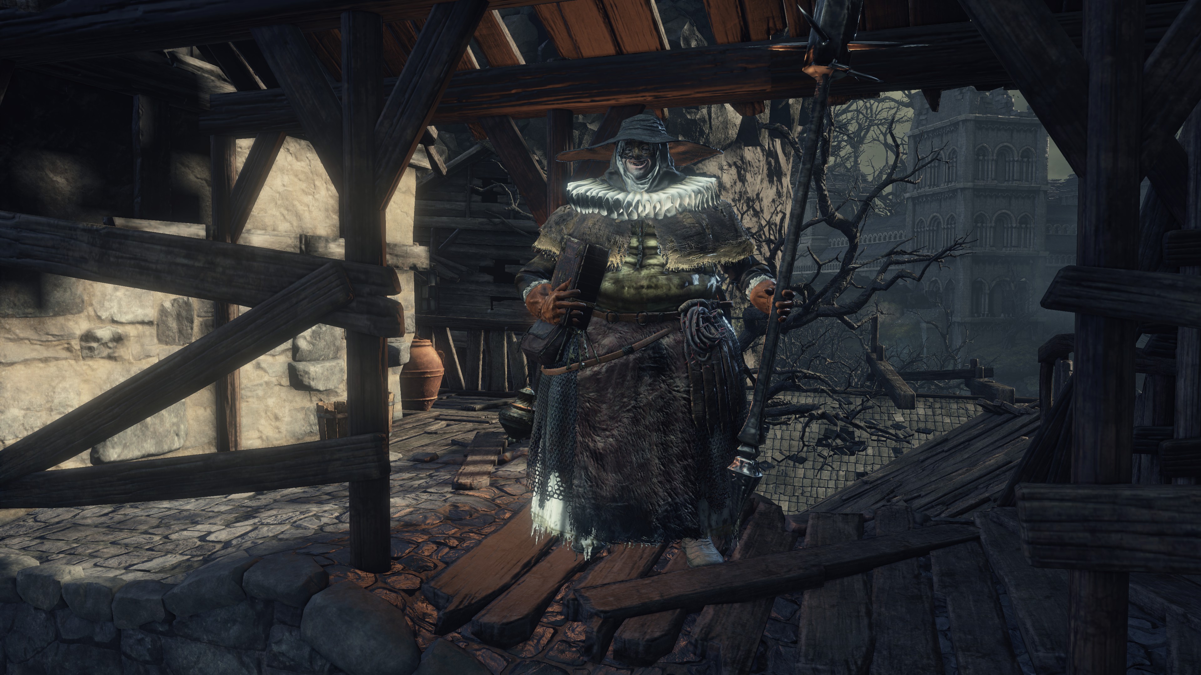 This community lives in abject poverty, from the ramshackle hovels they call homes to the meager shirts on their backs. The grounds are commonly littered with scraps of planks, wheels, and other woodworks, with the townsfolk all commonly carrying rubbish on their person. This suggests that the “poor Hollows” (貧民亡者) there make do with whatever trash they come by — convenient for when Lothric needs to dump all its refuse. But unlike Blighttown or the Gutter in past games, there is no sign of these Undead being particularly rejected by larger society. Rather, the reason they are forced to salvage everyone’s leftovers must be because they are Undead. Despite visitors such as foreign dignitaries assuredly passing through town on their way to the capital, none would do business with the cursed, so the population endlessly grows without an economy to sustain it.