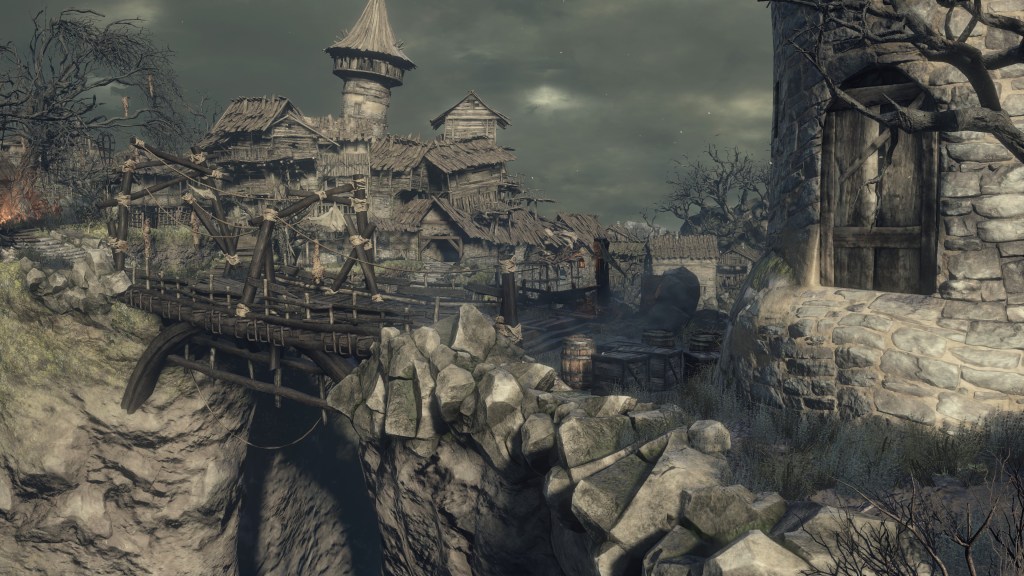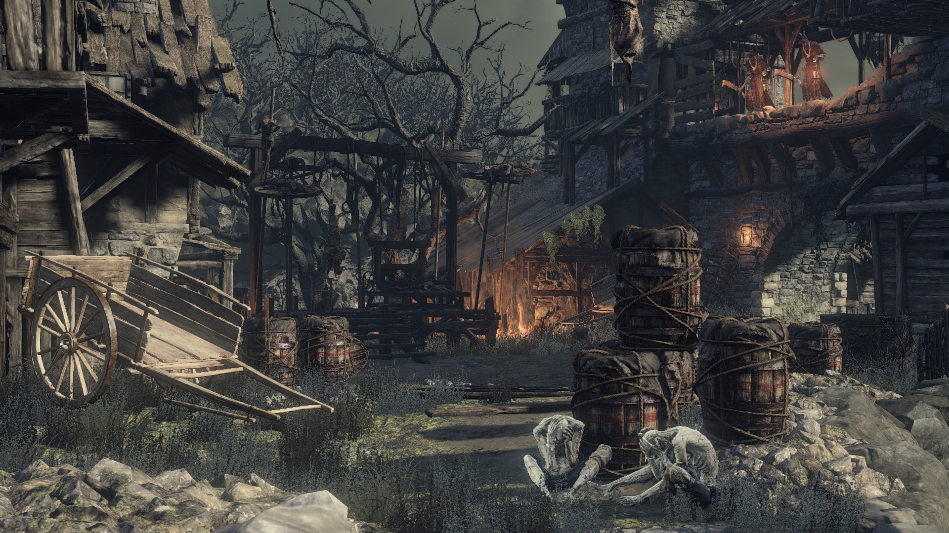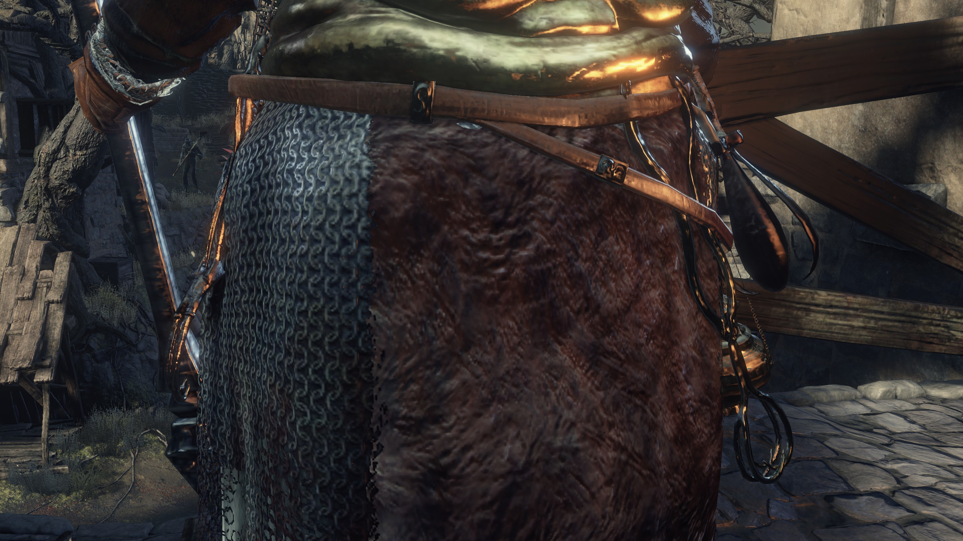 This community lives in abject poverty, from the ramshackle hovels they call homes to the meager shirts on their backs. The grounds are commonly littered with scraps of planks, wheels, and other woodworks, with the townsfolk all commonly carrying rubbish on their person. This suggests that the “poor Hollows” (貧民亡者) there make do with whatever trash they come by — convenient for when Lothric needs to dump all its refuse. But unlike Blighttown or the Gutter in past games, there is no sign of these Undead being particularly rejected by larger society. Rather, the reason they are forced to salvage everyone’s leftovers must be because they are Undead. Despite visitors such as foreign dignitaries assuredly passing through town on their way to the capital, none would do business with the cursed, so the population endlessly grows without an economy to sustain it.