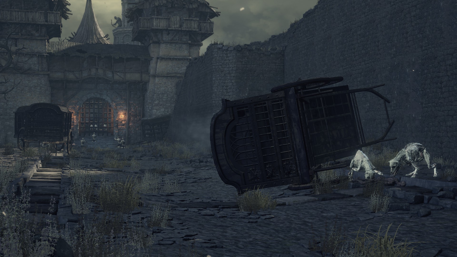 Greirat describes the Undead Settlement where he lived as a “dirty” town that isn’t the homeland of a Lord of Cinder we seek, existing there since long ago. This implies that it predates such lands stagnating around Lothric, and its exact origins can be inferred from its location at the mouth of the kingdom’s main bridge. Various carriages carrying Undead from Lothric to the town seem to have been derailed by the High Wall wrecking the causeway, causing Hollows to escape their confines and beg for entrance. We can thus presume that the Undead Settlement has been around for almost as long as Lothric, ever since the country had Undead to exile. But rather than be banished to some other land as is the case in foreign nations, Lothric is apparently content with their cursed immortals setting up a community just outside.