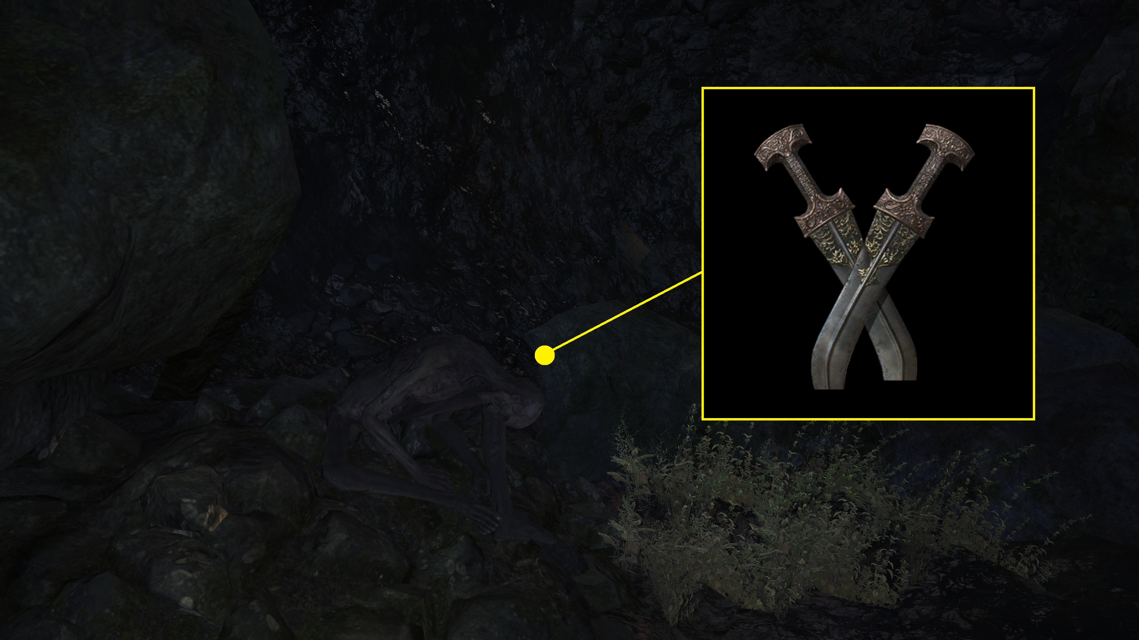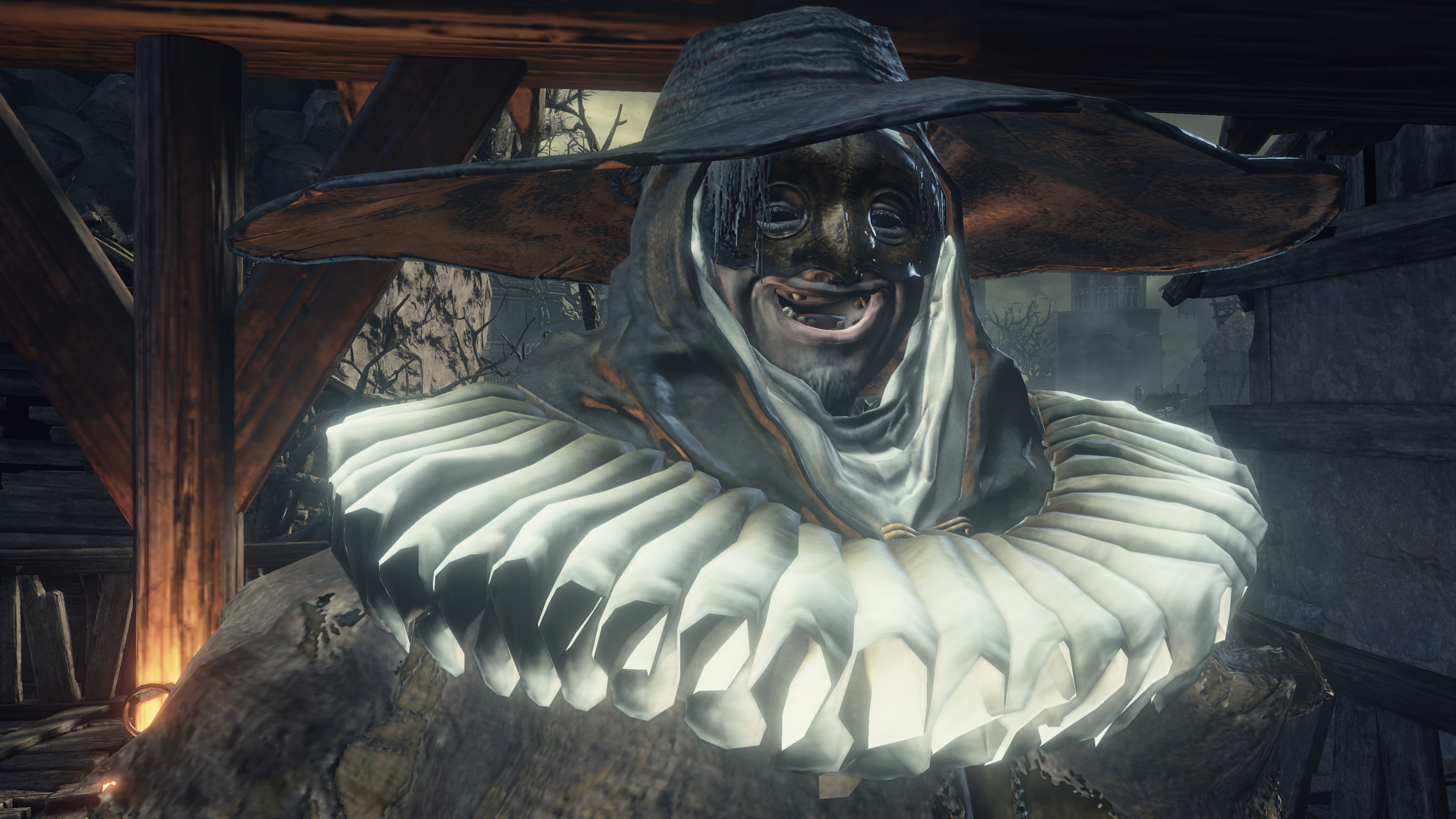 The so-called madwoman “haunting” a cave along the Road of Sacrifices — named Isabella (イザベラ) in Japanese guides — has more literally made it her den to dine in, reason being that she is a cannibal. She was once a citizen of the Undead Settlement, specifically a mortician given her worker’s hat, which leaves grisly implications for where she first sampled human flesh. Regardless, once Isabella had a taste, she couldn’t stop enjoying her taboo meals, hence her Butcher’s Knife restoring HP with each cut of flesh — the sharper the blade, the more savoring the meal revitalizes the soul; no wonder she has a constant smile plastered across her face. To fellow residents, madness must be the only explanation for her committing such terrible acts. But based on corpses in her lair, she has been mainly hunting the “pitiful” brigands she comes across there.