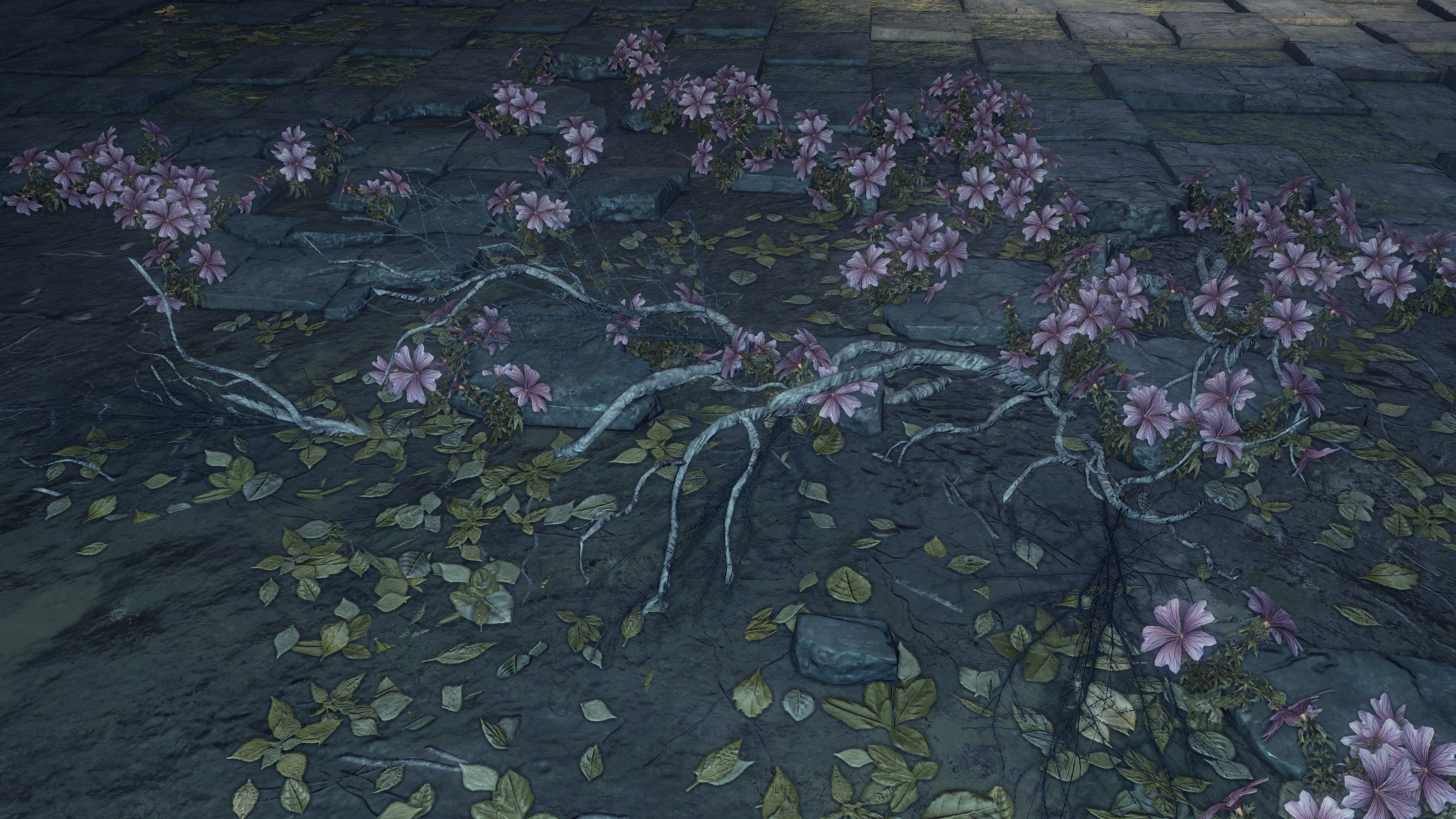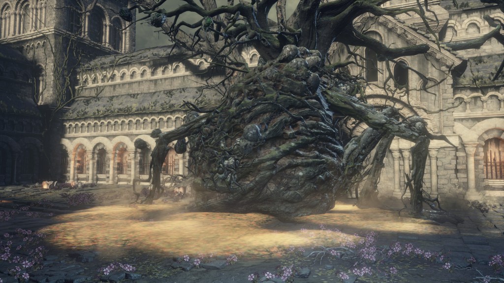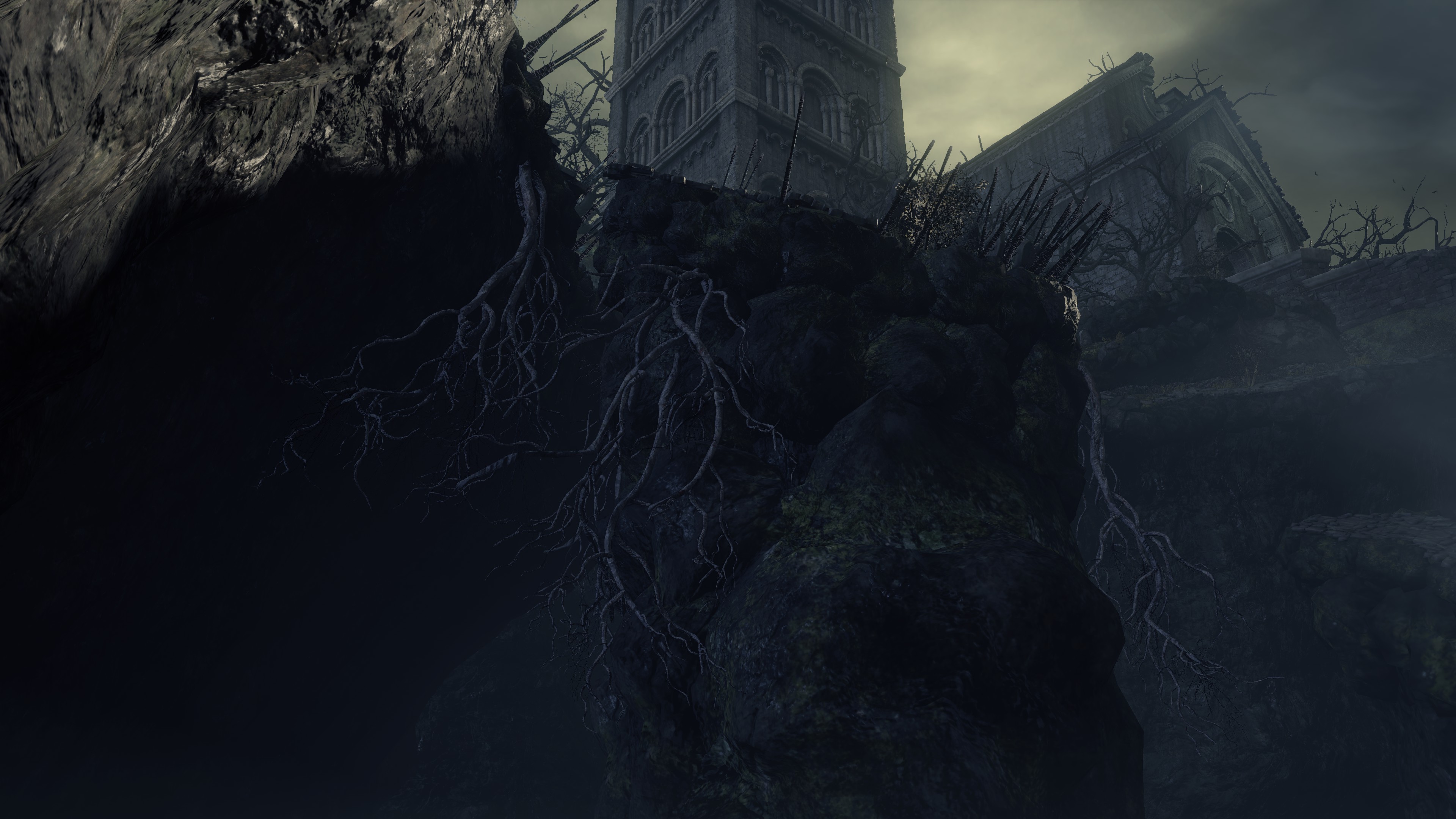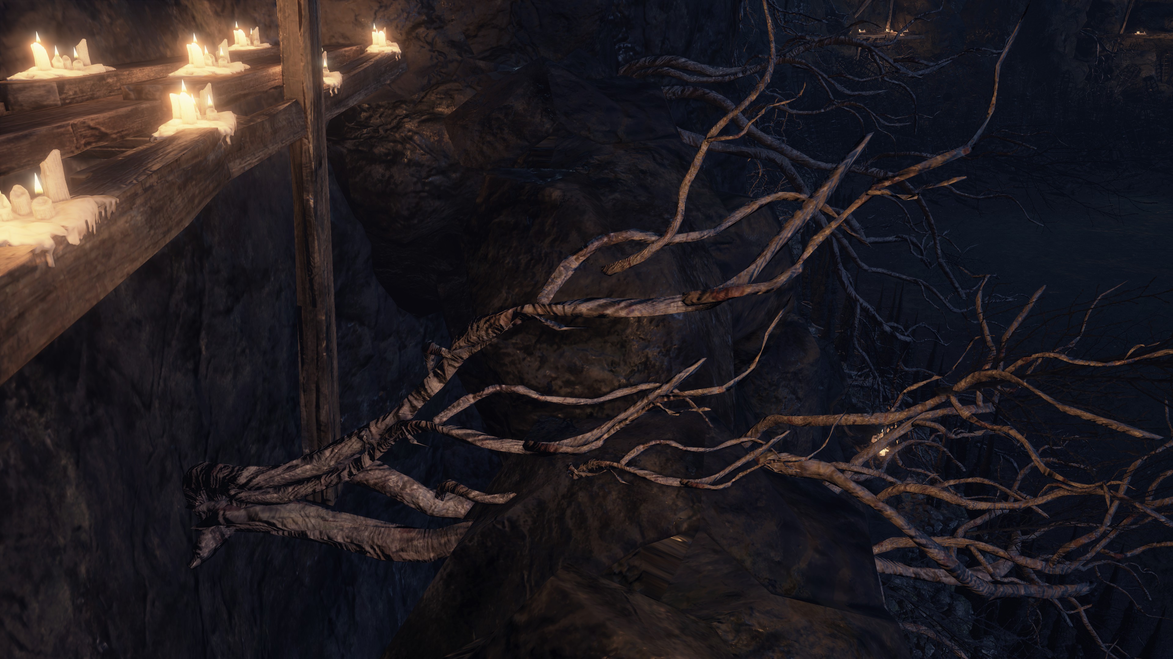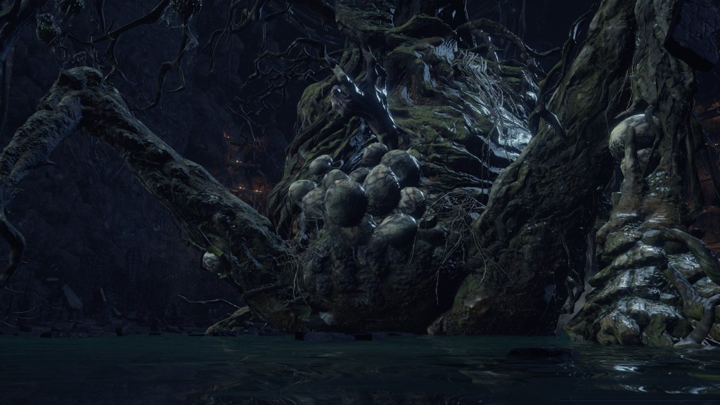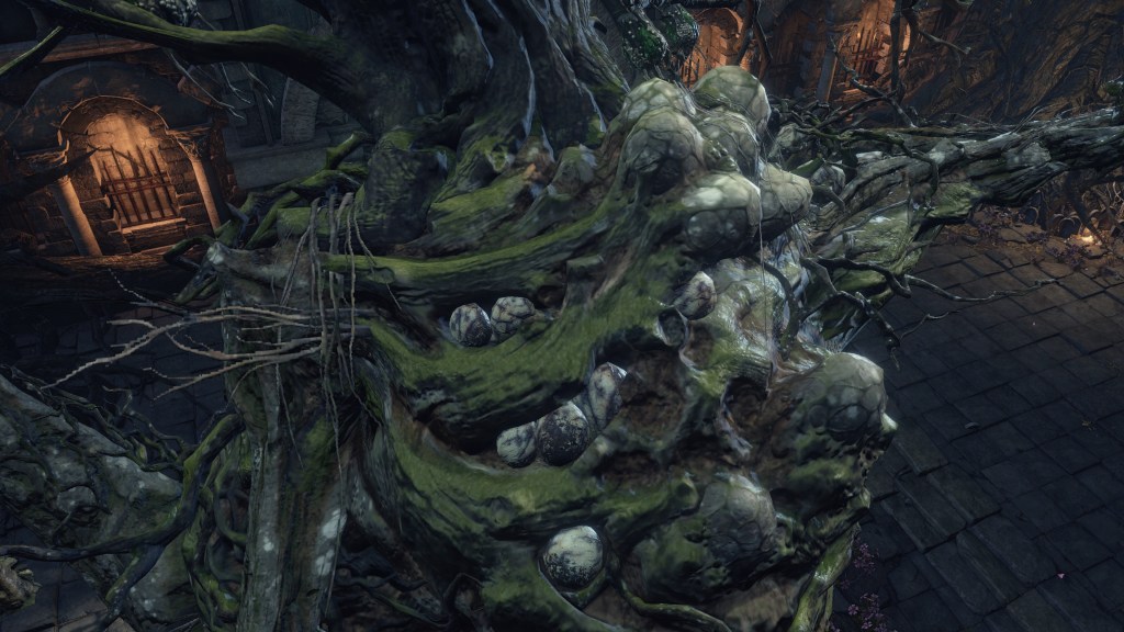 If the location is the town’s older burial ground, then it is only natural for a shrine to have been built over it and the modern graveyard beside it. The entire goal of the settlement’s ritual burials has been to purify Undead so as to prevent them from manifesting these unusual symptoms. Statues of a crying man desperately attempting to contain the pus of man reaffirms the purpose of the shrine to suppress the outgrowths of undeath, which is entirely justified. The grass signifying human stagnation can be found in sparse amounts throughout town, but it grows in abundance around the shrine. And on the actual shrine grounds grow peculiar roots with black streaks, which extends all the way down to the Pit below. The townsfolk are desperate to keep the Dark of their Darksigns at bay, and are willing to believe that they can by simply stuffing any cursed thing they come across into a tree on holy ground. Unfortunately for them, these curses have gradually transformed their sacred tree into its own accursed entity.