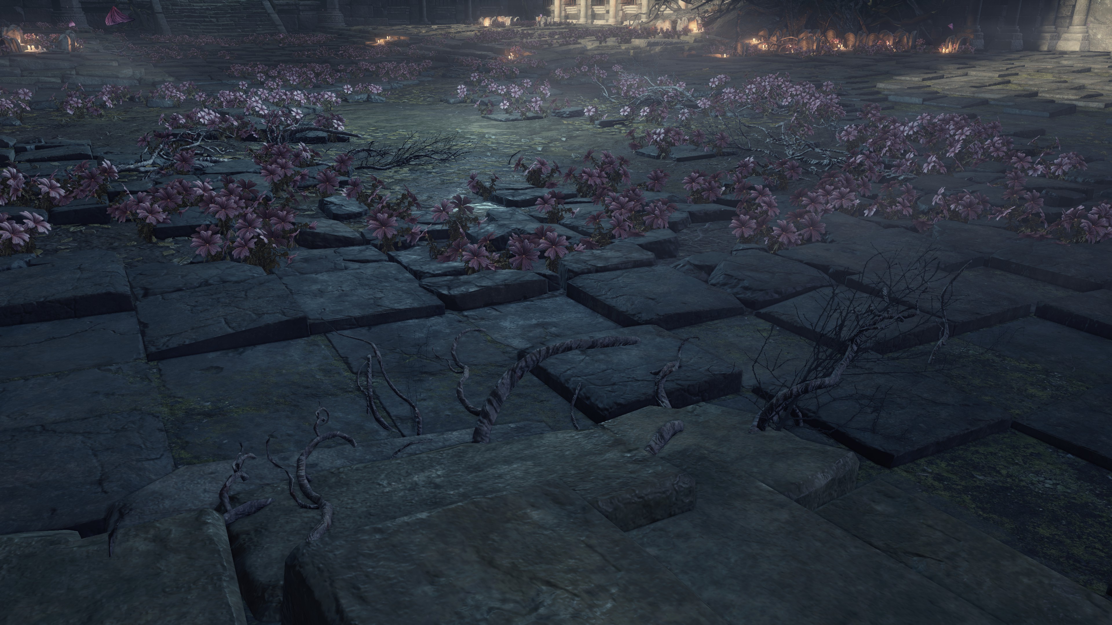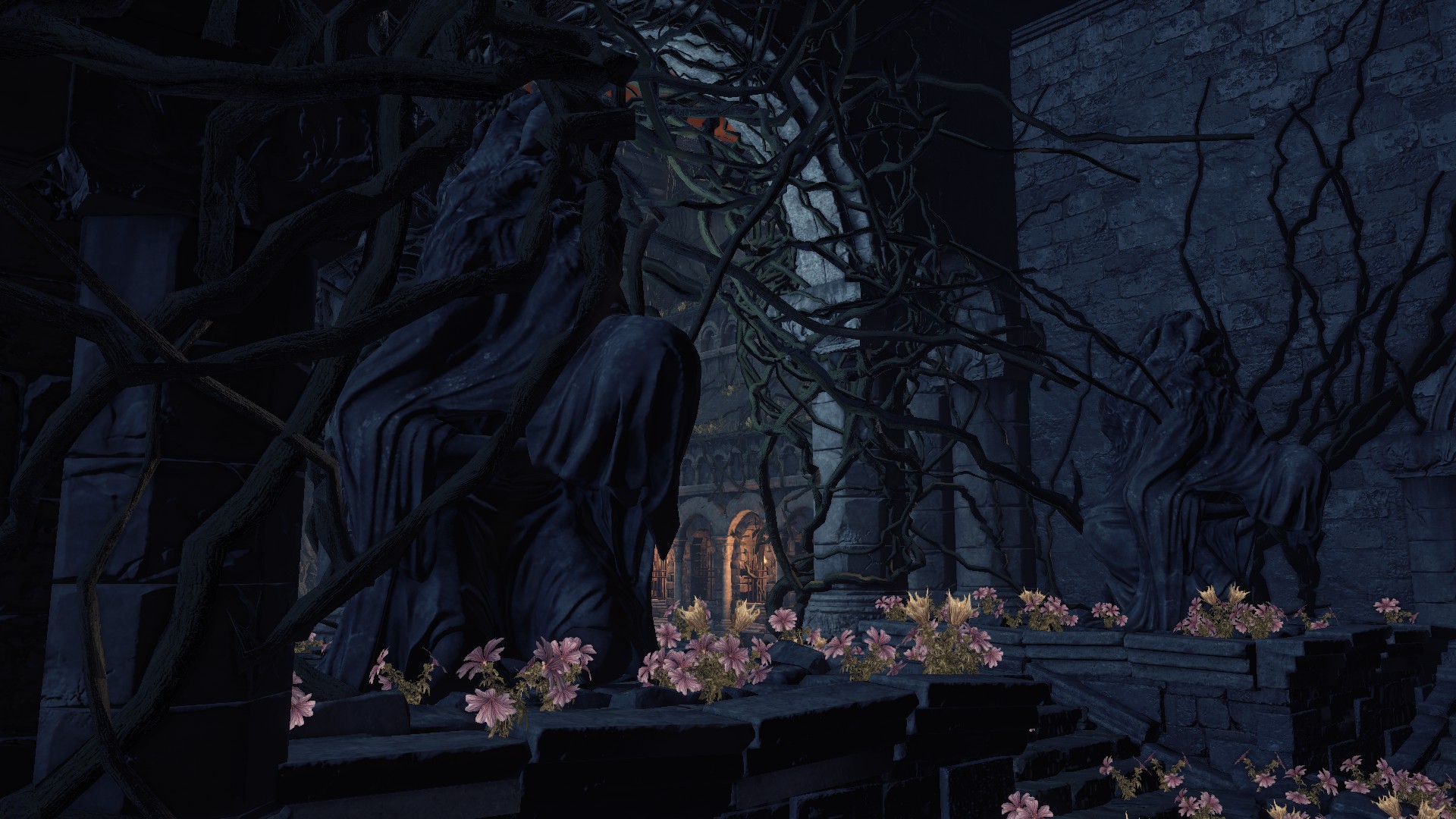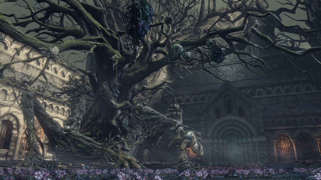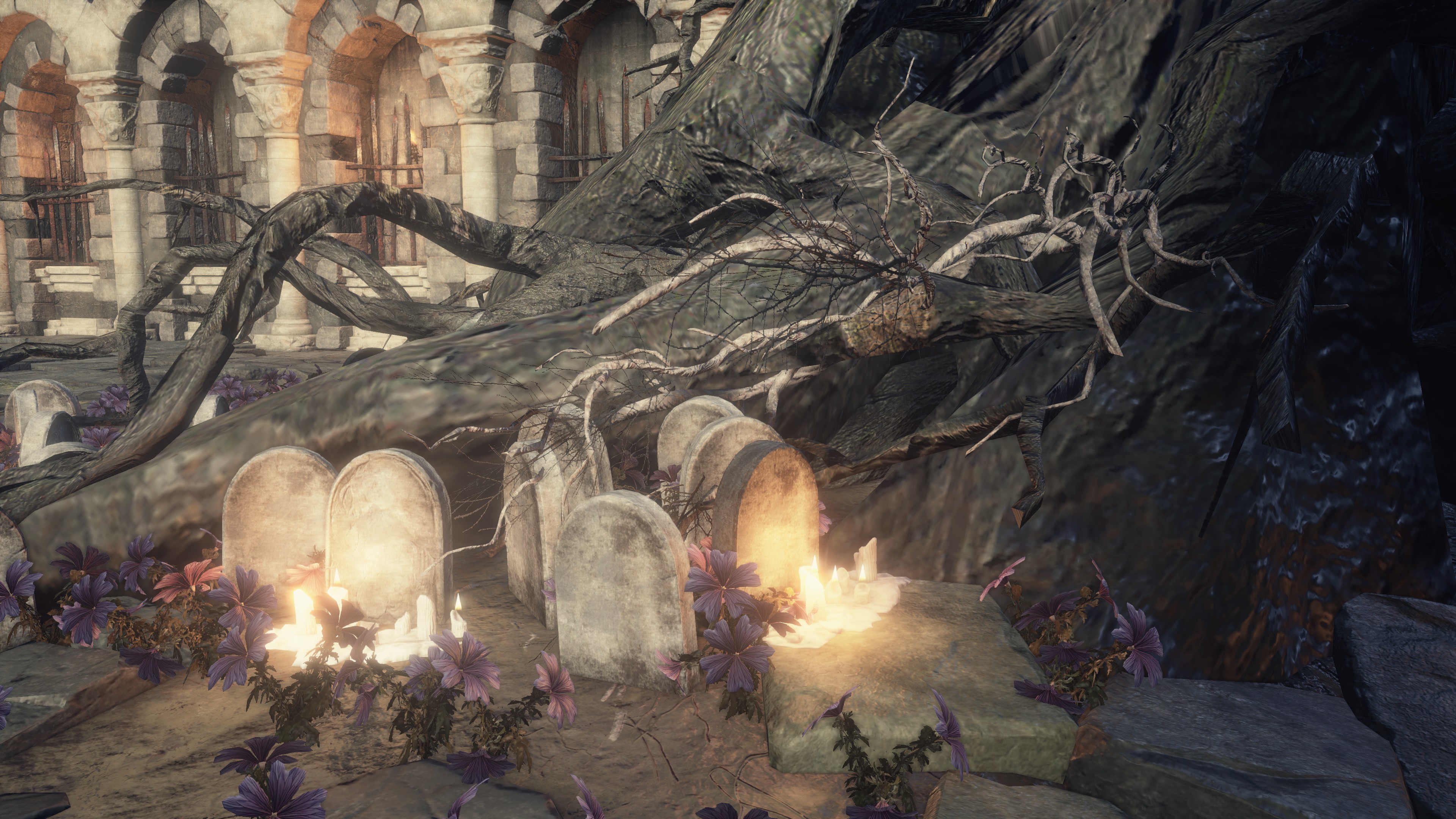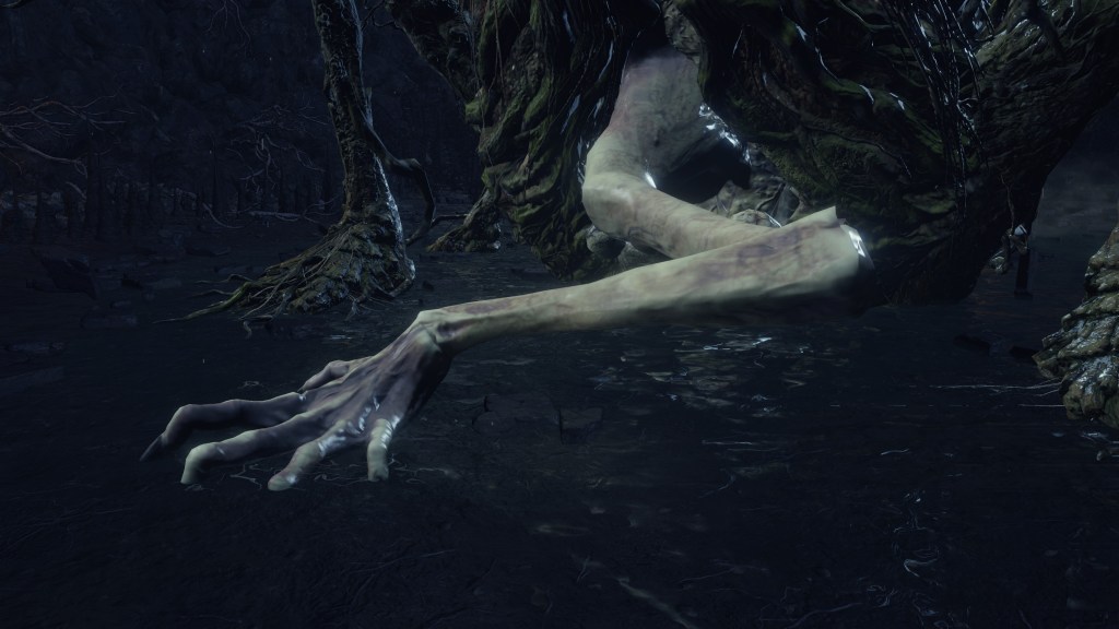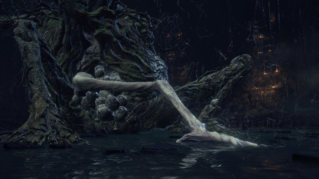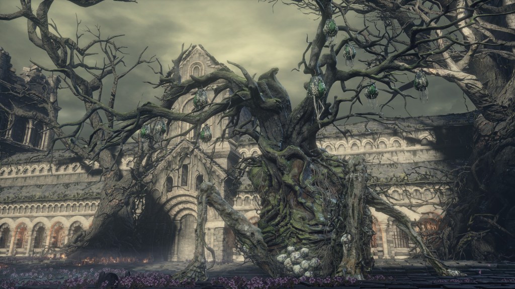 If the location is the town’s older burial ground, then it is only natural for a shrine to have been built over it and the modern graveyard beside it. The entire goal of the settlement’s ritual burials has been to purify Undead so as to prevent them from manifesting these unusual symptoms. Statues of a crying man desperately attempting to contain the pus of man reaffirms the purpose of the shrine to suppress the outgrowths of undeath, which is entirely justified. The grass signifying human stagnation can be found in sparse amounts throughout town, but it grows in abundance around the shrine. And on the actual shrine grounds grow peculiar roots with black streaks, which extends all the way down to the Pit below. The townsfolk are desperate to keep the Dark of their Darksigns at bay, and are willing to believe that they can by simply stuffing any cursed thing they come across into a tree on holy ground. Unfortunately for them, these curses have gradually transformed their sacred tree into its own accursed entity.