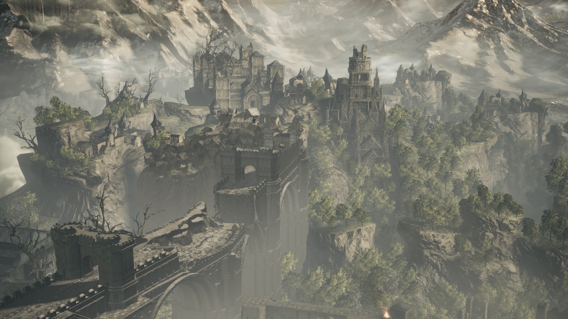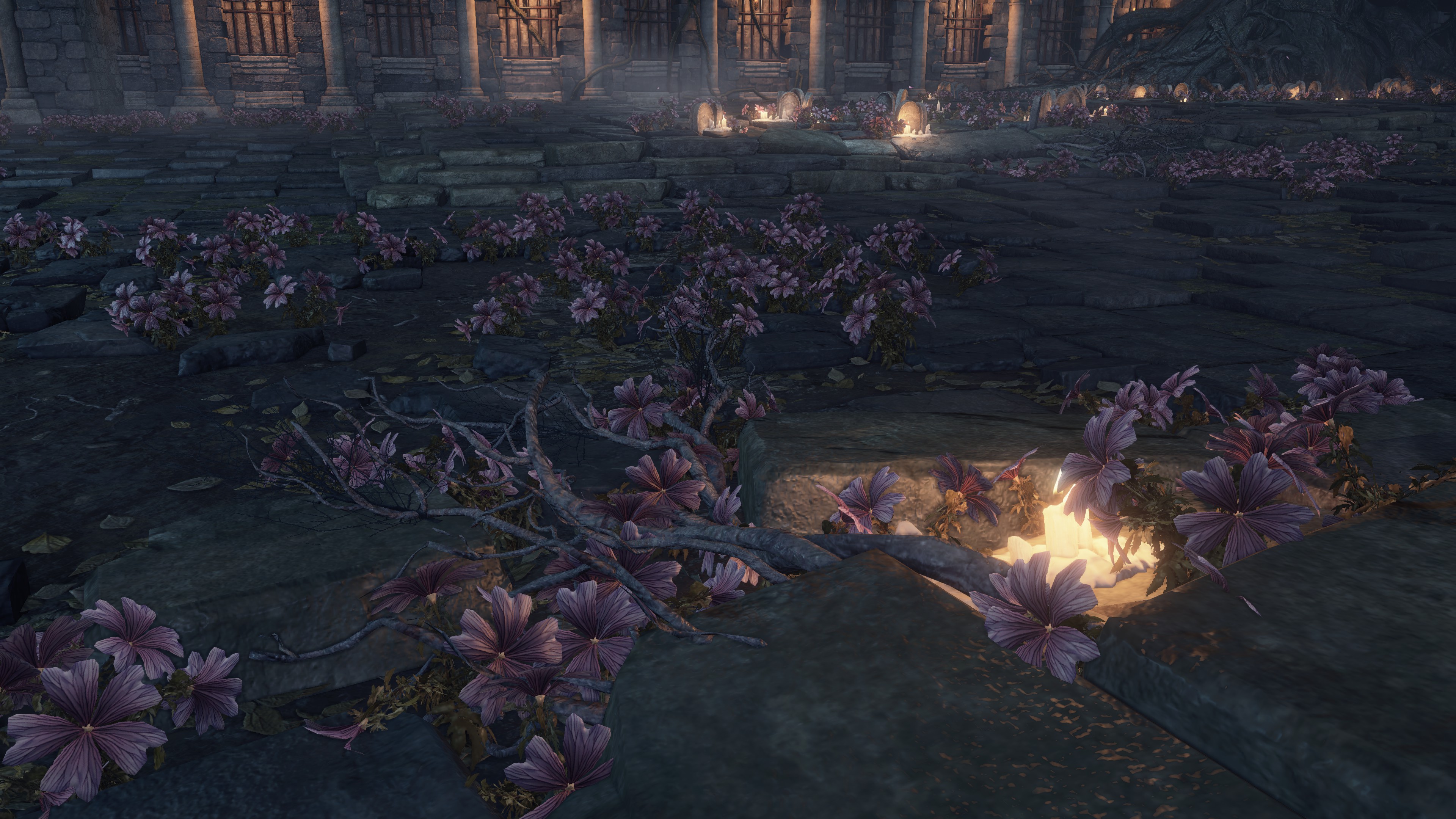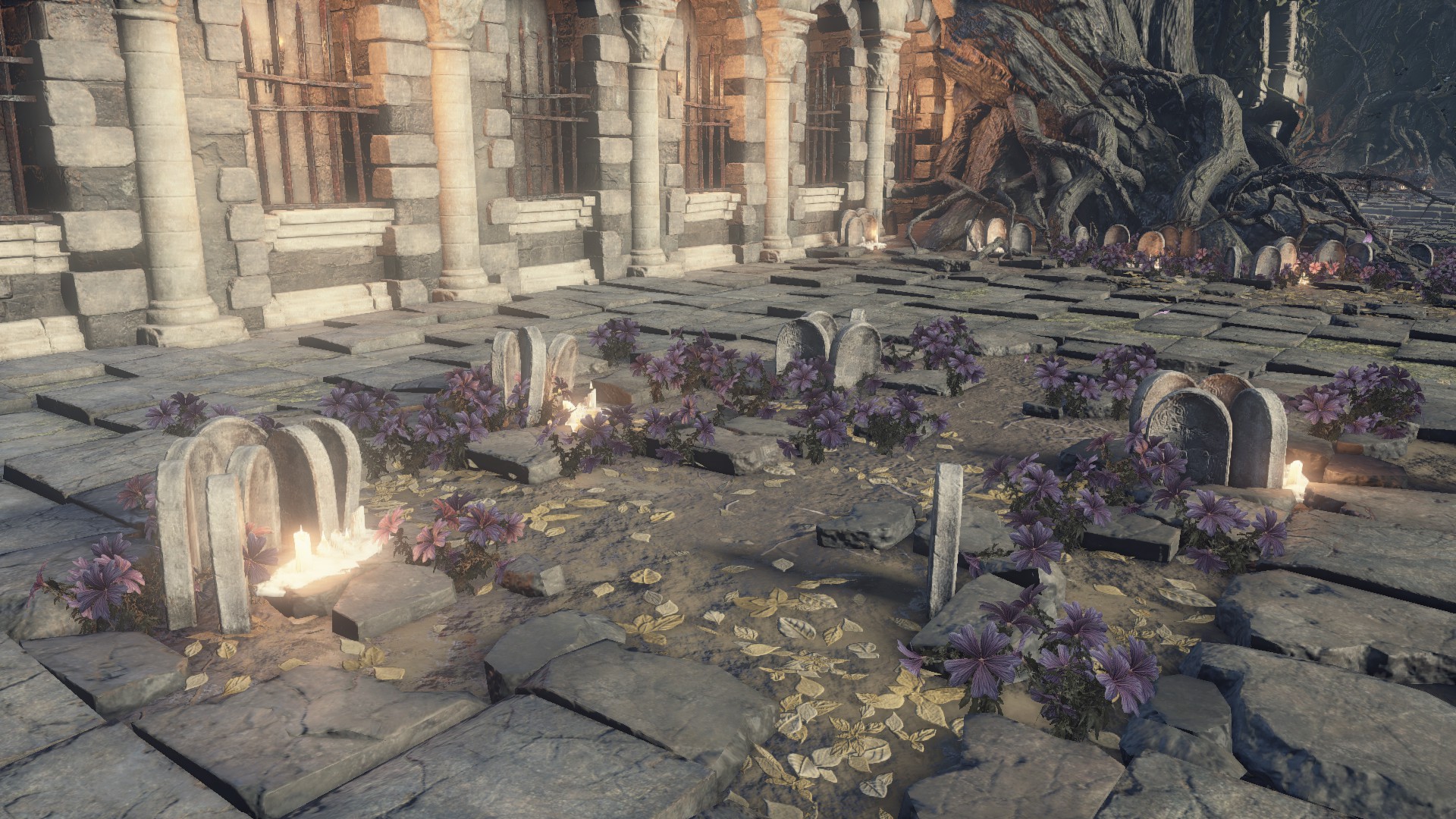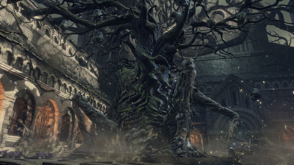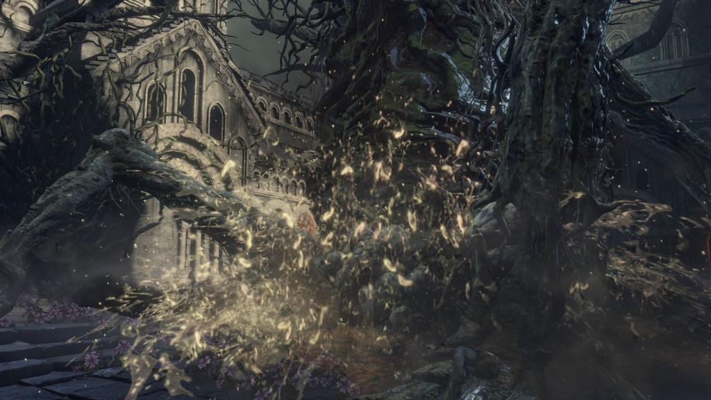 The Curse-Rotted Greatwood is called a “spirit tree” or shinju, (神樹) trees which are in some away associated with the divine — typically located on consecrated ground or housing the spirit of a god. Indeed, we can see that the townsfolk bow in praise while in its presence, and the description for the cut Hammer of the Great Tree reaffirms that it is an object of worship. The only question is why this specific tree. Based on just its size, this god tree has been around for quite a long time, so many years in fact that it has become a “distant memory” according to the cut weapon’s text. Moreover, it does seem to have taken root on sacred ground. The tree stands in an courtyard at the center of a huge stone complex. We have no way to enter, but civilians pour out of windows during the Greatwood’s boss battle, so it is more than a plaza. A procession led by an evangelist heads from the direction of the similarly stone church to this complex. Therefore, it more than likely serves as a kind of shrine for the land, and there is the connection.