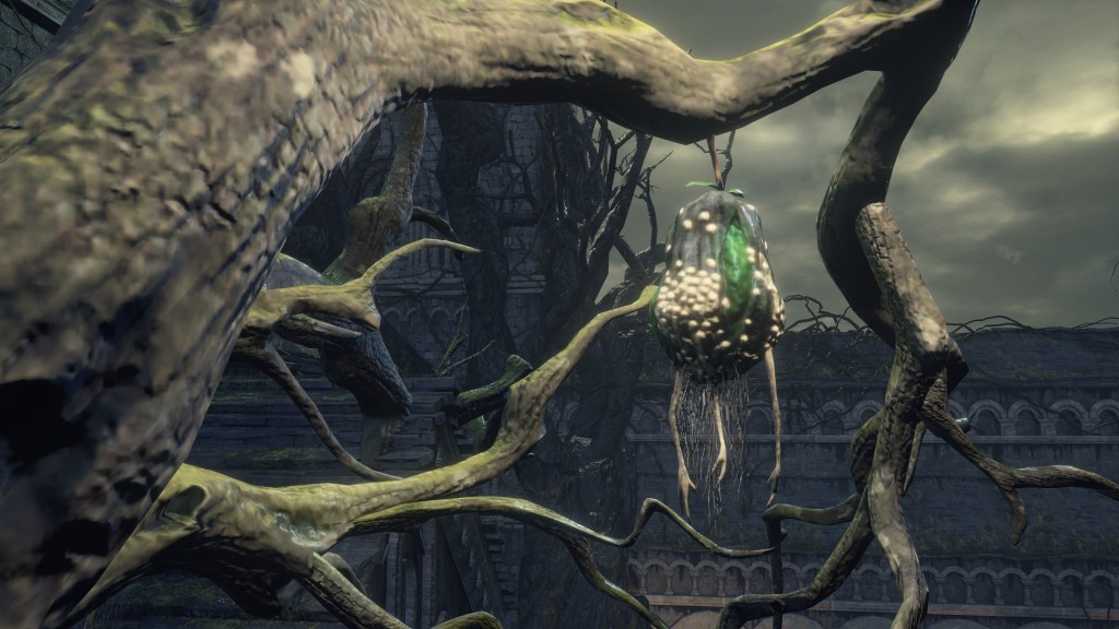 The “curse-bellied great tree” (呪腹の大樹) is embedded with unnaturally white cysts at various parts of its arboreal body. And after collapsing the floor and falling down into the Pit of Hollows, the tree’s trunk splits open to reveal more of these fleshy sacks tangled together within its belly — along with an equally sickly white arm. Each of these cysts are most likely an individual curse being circulated around its entire body, resulting in it producing corrosive fluid. Even the fruit it bears has this same green fluid and similar white cysts and arms, seeds for more cursed trees. The tree is aware of this and weaponizes its corrosion, leaking out fluid with heavy body slams or throwing around fruit with dexterous hands. This corrupted nature is exactly why the boss is internally named “cursed colossus” (呪われた巨像) and explains its sudden violent outburst against us and the townsfolk should we intrude on the area.