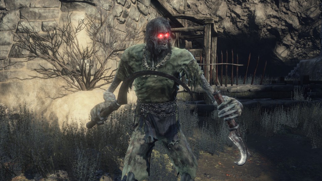 With how impoverished the Undead Settlement is compared to Lothric, it is understandable that the town has developed a seedy underworld. One of the corpses strung up in town owns kukris commonly adopted by thieves, like in the adjacent forest. Another in the graveyard carries a reinforced club, the added nails suiting gangs threatening a beatdown in lieu of a shakedown. Human pine resin is likewise often sold for a high price due to its rarity, which should still raise eyebrows when its main use is in a ceremony to coat weapons with heretical Dark power. There will always be those willing engage in shady transactions, and the ostracization of Undead makes dealing under the authorities’ nose child’s play. In short, the town is the perfect hotbed for criminals, cursed or otherwise. It explains the foreign bandits lingering in their neck of the woods specifically — when someone wants to acquire something illegal, they come to town, then lay low. This likewise provides the lowly morticians a nice side hustle for all their trouble.