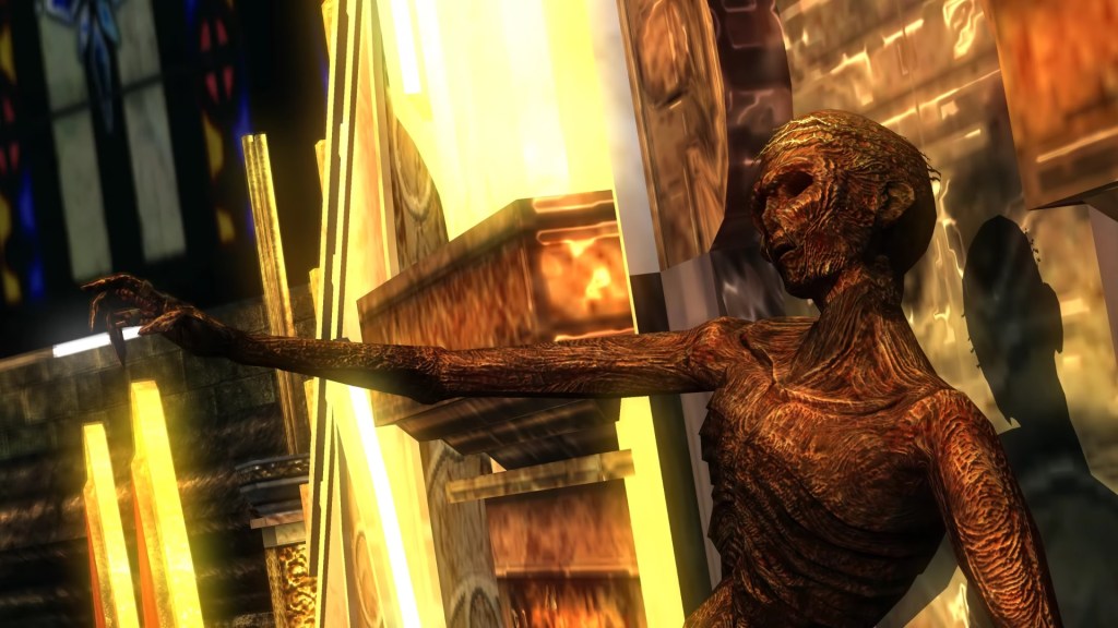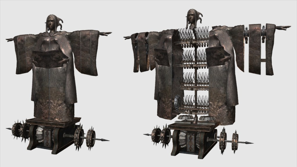 All of this imagery evokes Lovecraftian horror, and the fleshy abomination even has many blood-red eyes and a few short limbs grasping onto the tower while pulsing with its own “heartbeat”, suggesting it the ball in fact its own singular entity. But in order to even support its frame, the elder’s human servants have to be continuously performing magic rituals to secure the two gigantic chains hauling it up, a weakness which we readily take advantage of. With how easy it is to kill this demon by destabilizing the chains, why even create it? The obvious answer is that it is the pinnacle of the old man’s magical research, the largest concentration of flesh, blood, and soul into one being. In short, it is closest to Latria’s conception of divinity.