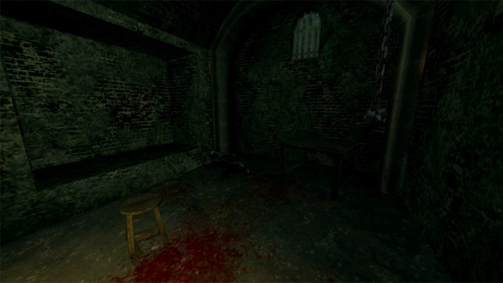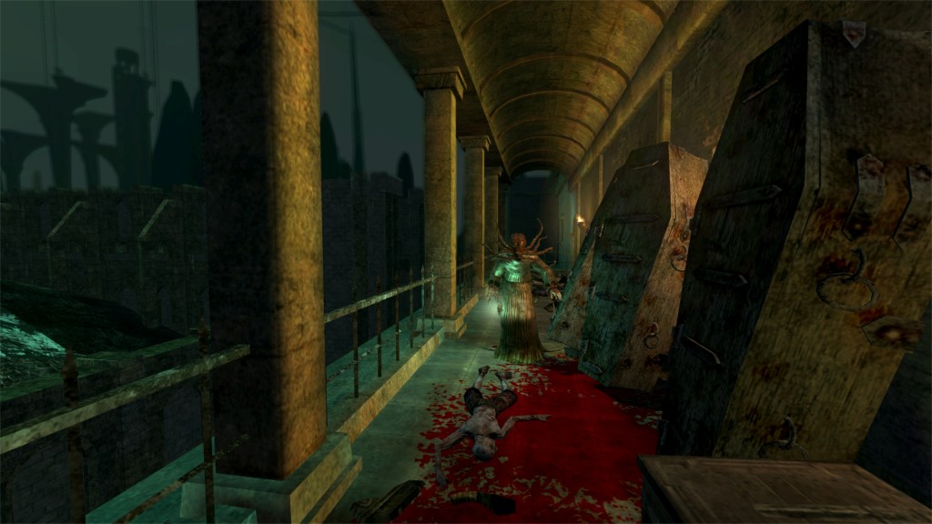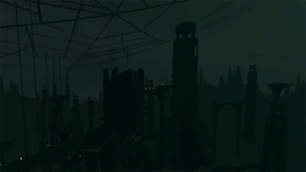 The only thing still holding these edifices up are the oversized chains linked between them — another renovation by the servants given that more cages hang from them. Based on this, we can infer that the cages are suspended from the web of large chains looming in the sky overhead. The web itself hangs from distant towers all around the perimeter of the area, suggesting that the cages and thus human soup cover a huge swath of the city beyond what we explore. This requires a great number of bodies, so the gargoyles may be additionally dumping the prisons’ coffins, which can found right up to the church — they have dropped a prisoner ball down there, after all. Alive or dead, everyone will end up in the fleshy swamp surrounding the Ivory Tower, and this blend of bodies was putty for experiments.
