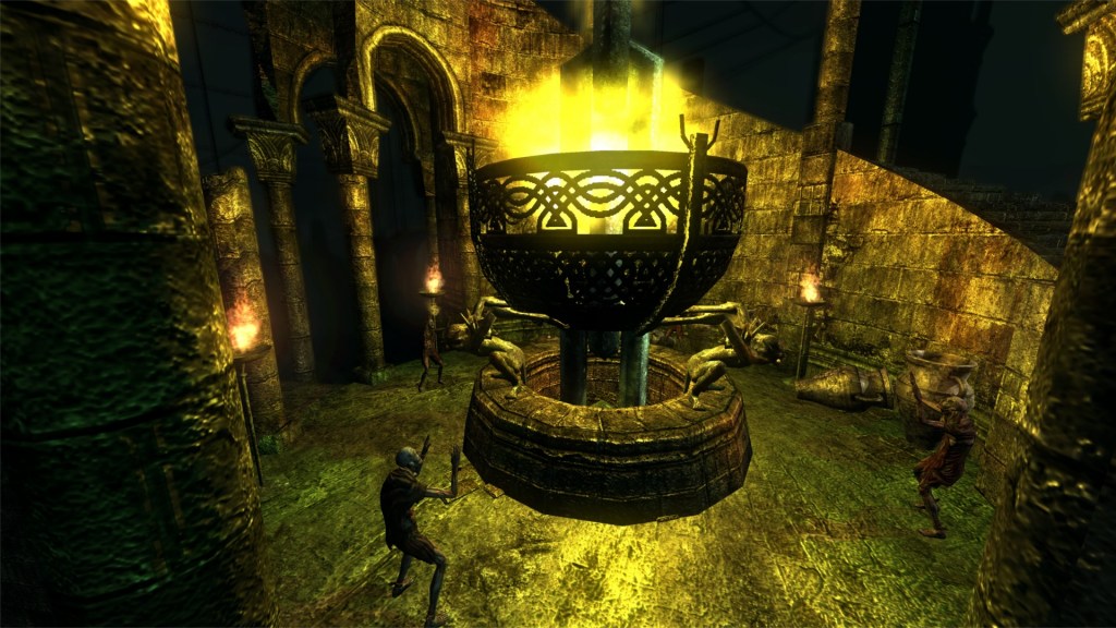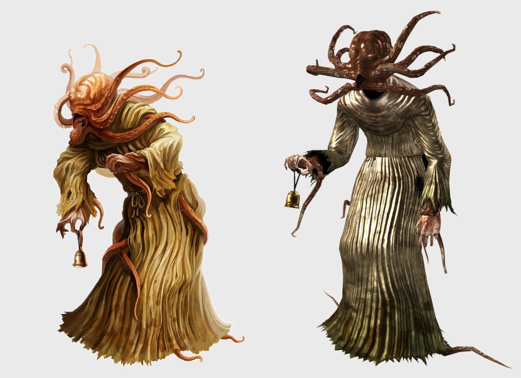 Betrayal thus seems to be the reason that some aristocrats are now demons. Thanks to the old man’s experimentation, they have been transformed into humanoid cephalopods reminiscent of mind flayers, enemies featured in Dungeons & Dragons loosely inspired by Lovecraft’s works. These hybrids wander the prison halls as jailers, armed with a bell to alert others of trouble and keys to freely traverse the labyrinthine halls. These same passages are also home to extravagant pots spewing a green gas — perhaps incense burners for rousing the prisoners’ spirits before the harvest. All of this makes the octopus men the most practical option for performing the everyday torture and coaxing. Indeed, the Nexus Archstone’s Japanese text specifically insists that they “can’t be human” as if in denial of their former humanity, so it is possible that the former noble’s wife still thinks of these monsters as people. But whoever she is referring to, they are all part of the system setup for the elder’s vengeance.