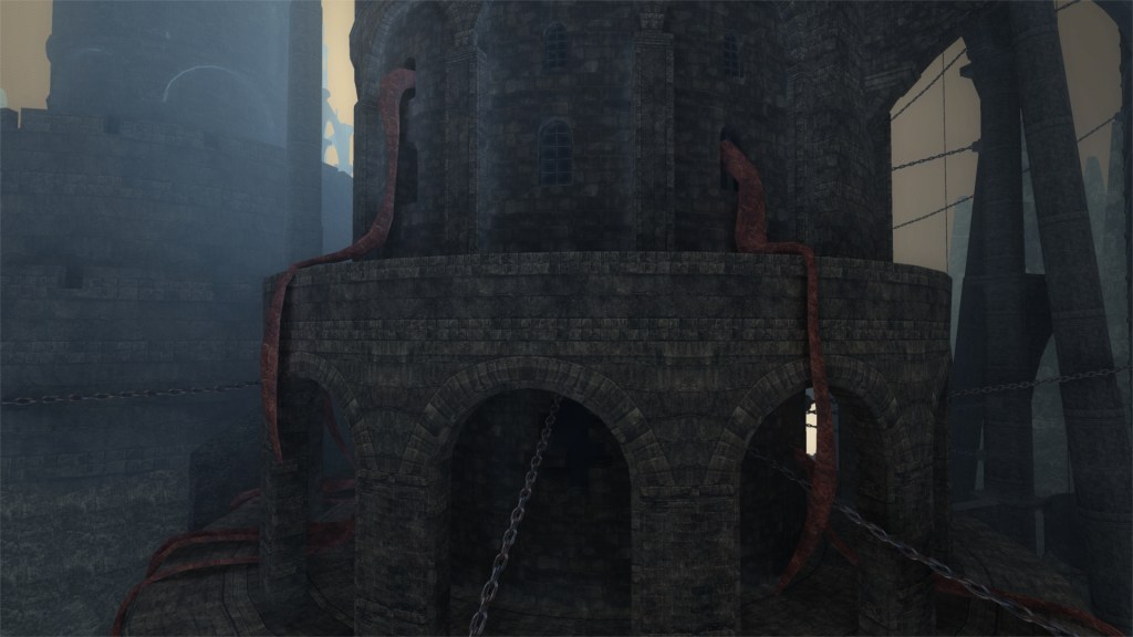 The sinner’s church enshrining the statue of a false god offers equally empty hopes of deliverance to its mad flock. Like the ballista preceding it, the holy icon is just a mask for the “ugly malice” behind it. Prisoners lured there seem to be periodically taken to the Ivory Tower, hence why the gargoyles readily fly us up to the next area without conflict. From there, other gargoyles lock them back up in hanging cages where they continue to be tortured as if they had never left their original cell. And once the gargoyles satiate the old man’s sadism, the cages are finally lowered into the base of the buildings where the prisoners all meld together into a soup of flesh and entrails. Makeshift wooden platforms, bridges, and poles to crucify certain prisoners have been set up at the Ivory Tower, allowing the octopus men stationed there to oversee the ghastly formulation. The organic goop also appears to be responsible for destabilizing the city’s foundations, most buildings now leaning to the point of breaking the arched paths bridging them together.