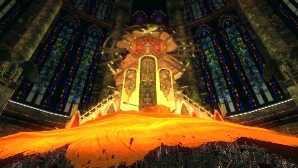 As seen with Stonefang, the deep fog can create a demon out of nothing but the conceptions of the soul’s imagination. In that case, it is feasible for the yellow cloth to be the product of the old man’s own thoughts. Consider his use of it. When we first see the boss, he is seated in the Queen’s throne while garbed in the eminent fabric. Yellow is of course the color of riches and royalty, which is reinforced by the boss’ name — ou is a homonym for “king”. (王) Moreover, this wordplay for the “Elder in Yellow” combined with the design are a clear homage to the King in Yellow, (黄衣の王) a character popularized by H.P. Lovecraft. The color also complements the golden reliefs of divine imagery backdropping the boss. He even wears a crown of thorns, a holy symbol for Christ’s suffering, so the old man clearly views himself as a divine king persecuted by mortals, someone who should render such sinners final judgment at the end of the world. At the same time, he is portrayed as a demonic king, an avatar of eldritch horror. And key to both of these images is the yellow cloth.