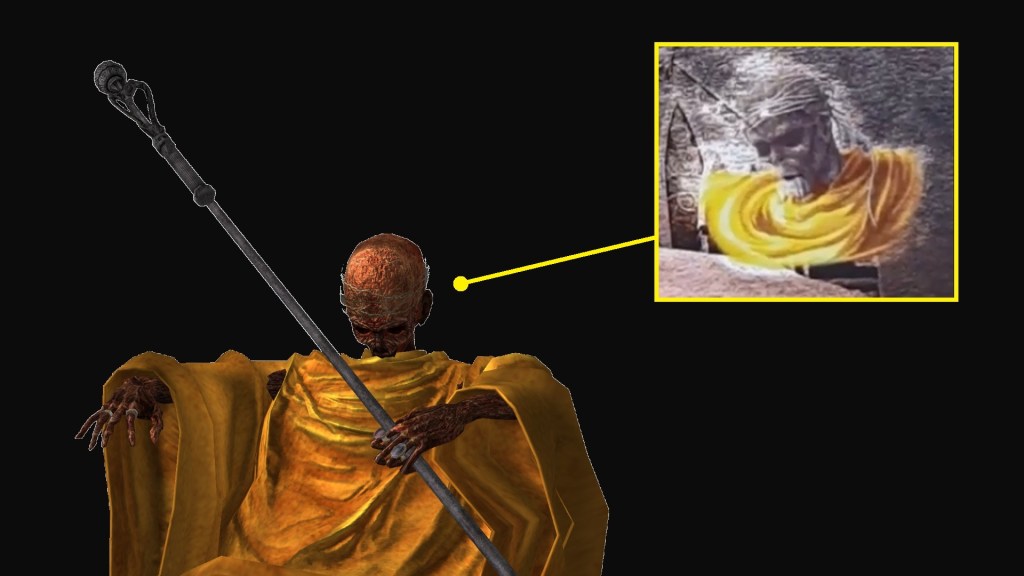 But wherever these demons originated, the yellow cloth wasn’t simply subservient to the old man’s whims. Homing Soul Arrow is another spell derived from the Old Monk’s soul, and its description affirms that the autonomous arrows it produces reflect the old man’s true nature. In other words, he relied on power which he had no actual control over once unleashed. In fact, the description for the Insanity Catalyst makes clear that this power which he desperately latched onto wasn’t ideal. This wand wrapped in yellow cloth considerably boosts the damage of magic while halving maximum MP, reflecting the frenzied but reduced mental capacity of madness. Other item descriptions and dialogue reaffirm that the yellow cloth drives humans mad and paranoid. Being a soul-sucking demon, the cloth likely drains its host’s mind, hence why it wraps around the head to control a spirit body.