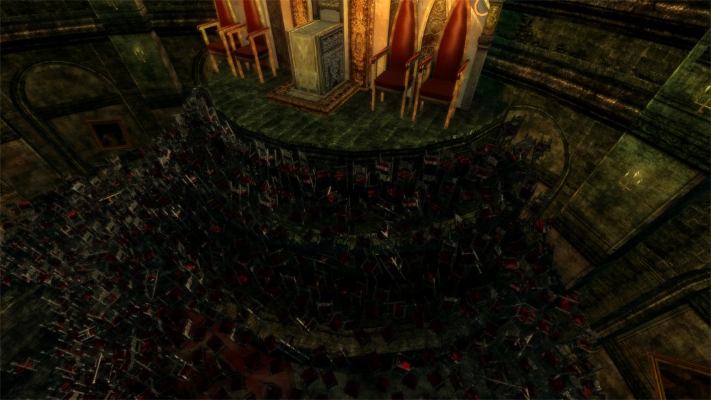 And so, the elder returned with his demons and ravaged Latria, the visible buildings mostly in ruins. According to the Japanese text for the Nexus Archstone, the Queen lost her life while her clan was imprisoned. Although we are provided no details about the manner in which she was killed, the portraits of a regally-dressed woman with her face violently scratched or torn out hanging in the Old Monk’s boss room denotes the elder’s violent rage toward her. The exact nature of this mass incarceration is equally unclear, as the former noble’s wife had somehow managed to bring her luxuries with her. With so many being displaced, it is possible that the elder’s forces just didn’t care about what the nobles dragged along with them as they were hauled off from their homes. But even if it is amusing to imagine the ex-noblewoman desperately holding onto all her sacks, boxes, and chests filled with valuables, this scenario stretches credulity and may just be a creative liberty by FromSoftware. Regardless, the rulers undoubtedly found themselves the ruled. The Queen’s throne is now the seat of the elder in yellow, crowning a haphazard pile of council chairs — the aristocracy was now subject to his whims.