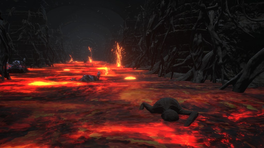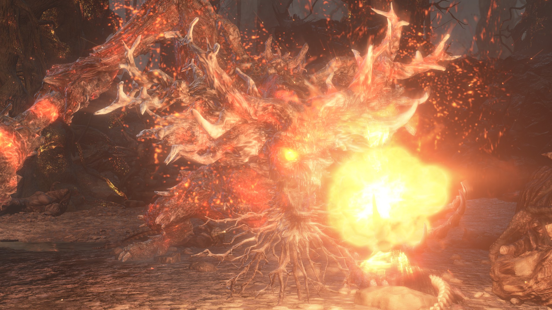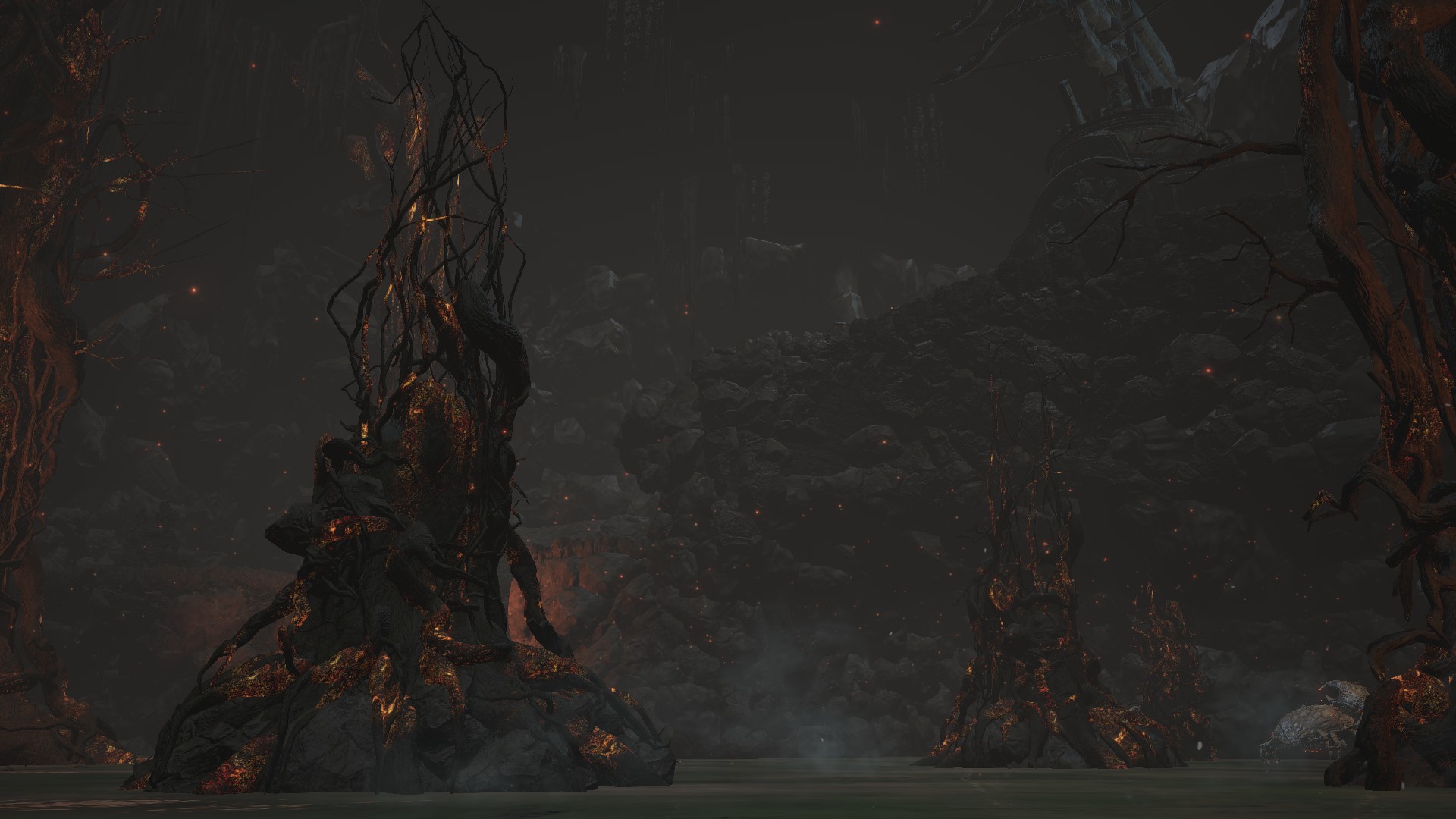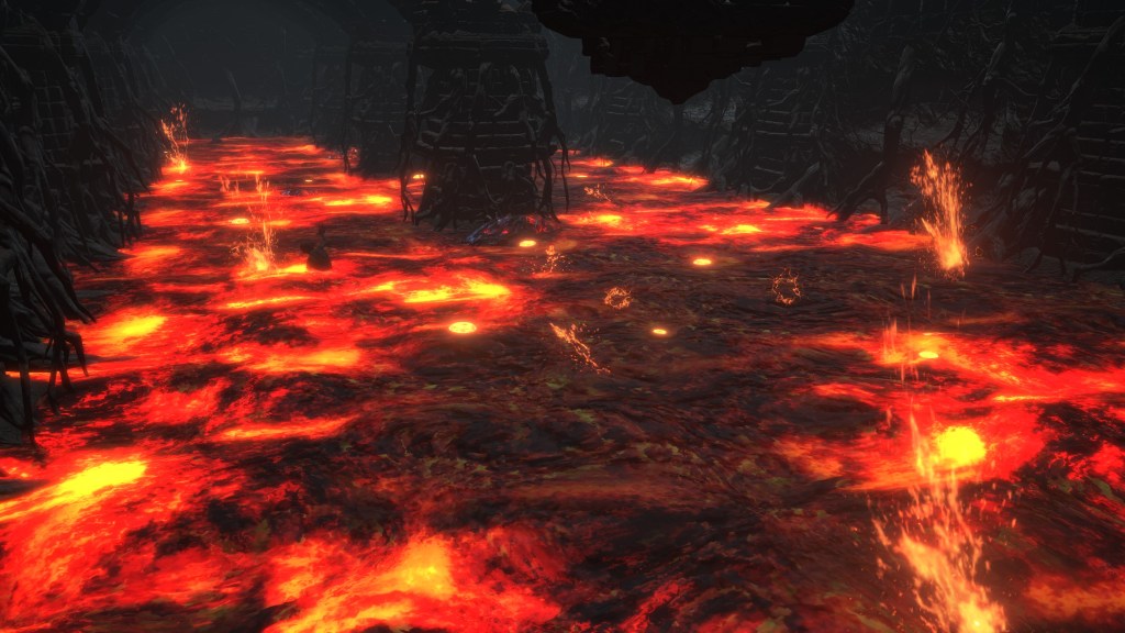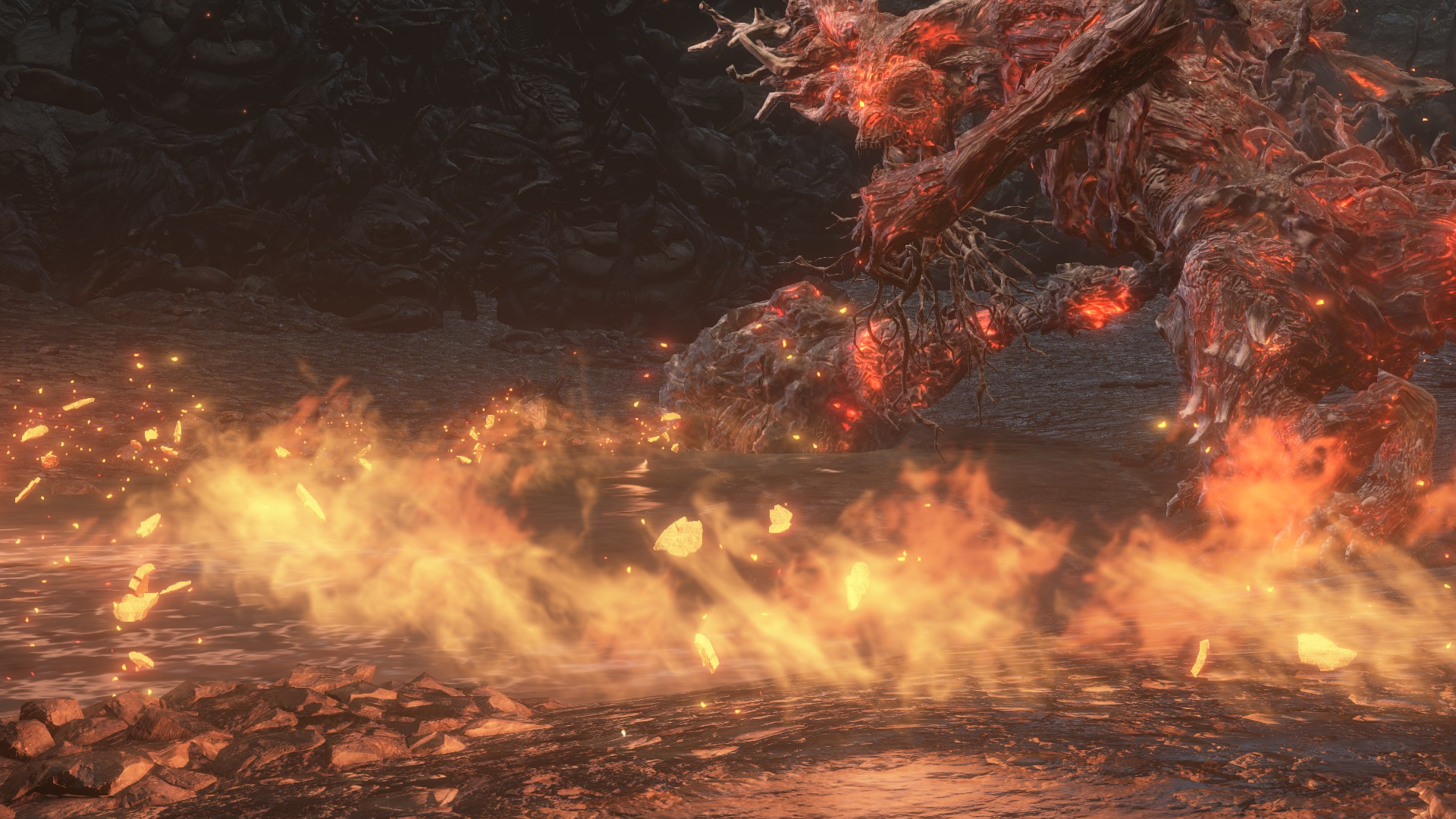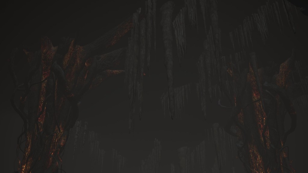 This helps explain the others’ continued habitation underground. Smouldering Lake brings to mind Ash Lake, though the area differs in key ways from the Lower World seen in DS1. For one, the archtrees are covered in overgrowth, while the ceiling they hold up has formed long stalactites, proof of all the rainwater continuing to drip down since DS1. Despite this, the lake is obviously shallower, but it is also bathed in warm embers to keep it that way. This is consistent with the general location of Izalith, within a ginormous cavern on the same level as Ash Lake. In short, the portion of the Lower World near the Flame of Chaos’ birthplace has become an area rich in the fire remaining in the region even after the source drifted to Drangleic. Gathering the demons in this high density of flame has created a cumulative heating effect, the bonds between each smolder reinforcing the other so that they collectively last longer. In that case, it was in the chaos demons’ next best interest to coalesce every piece of their First Flame that they could find. And one such demon had done so better than others.