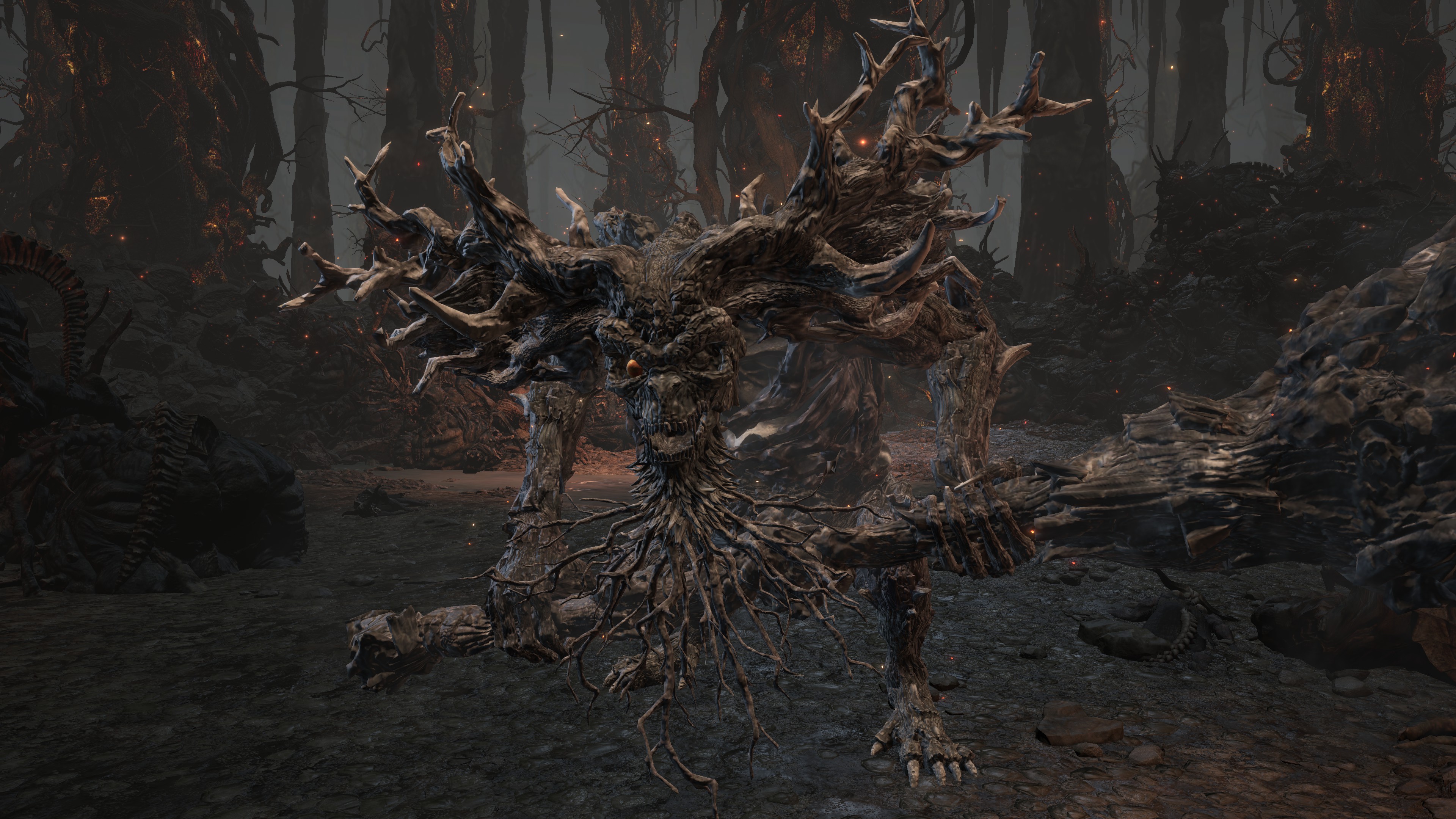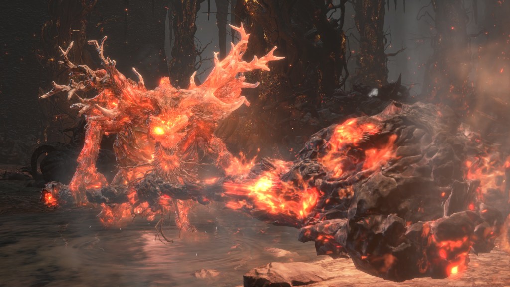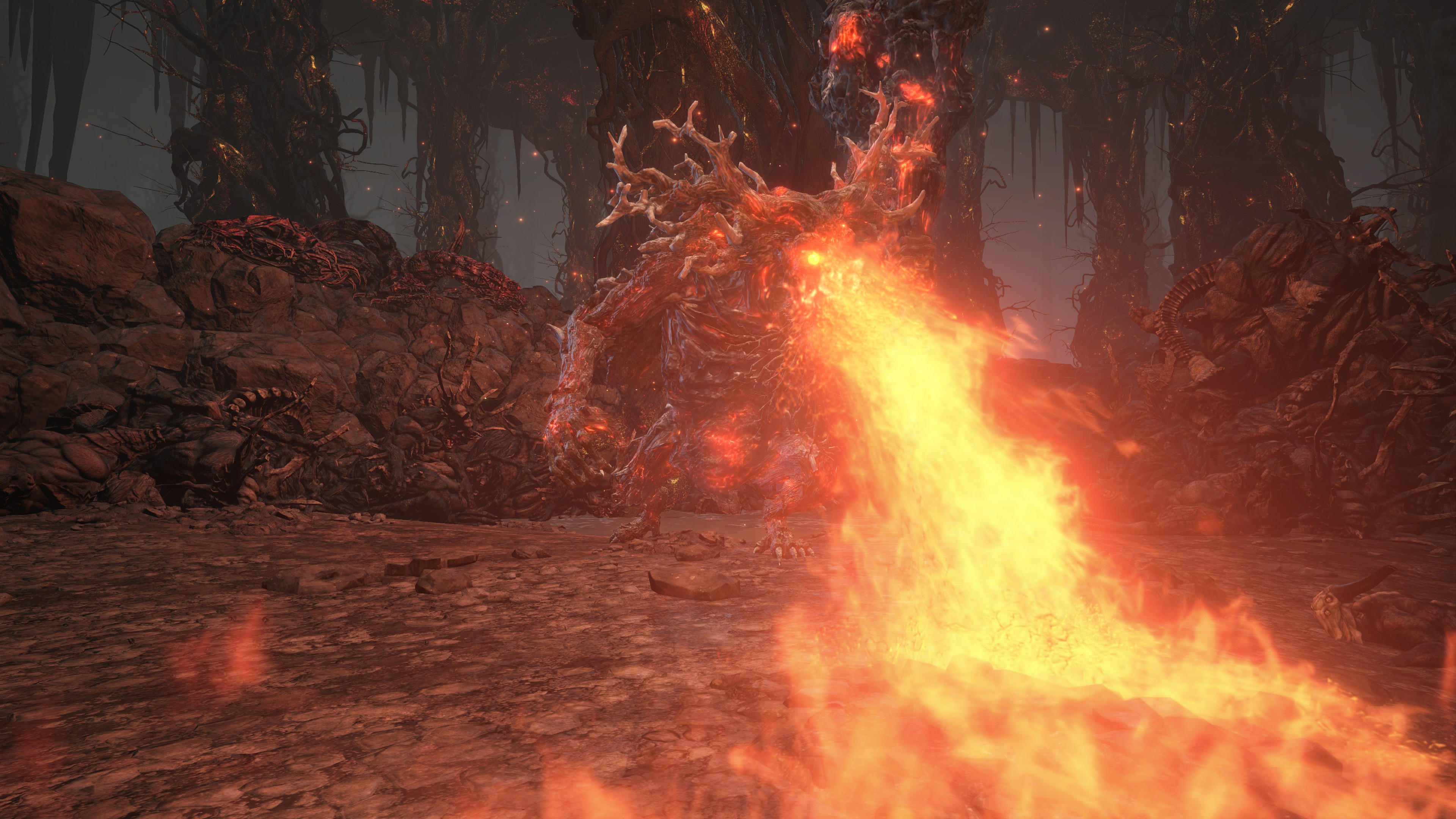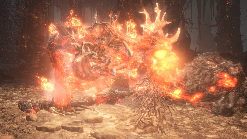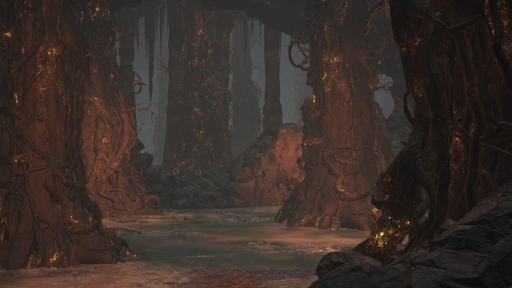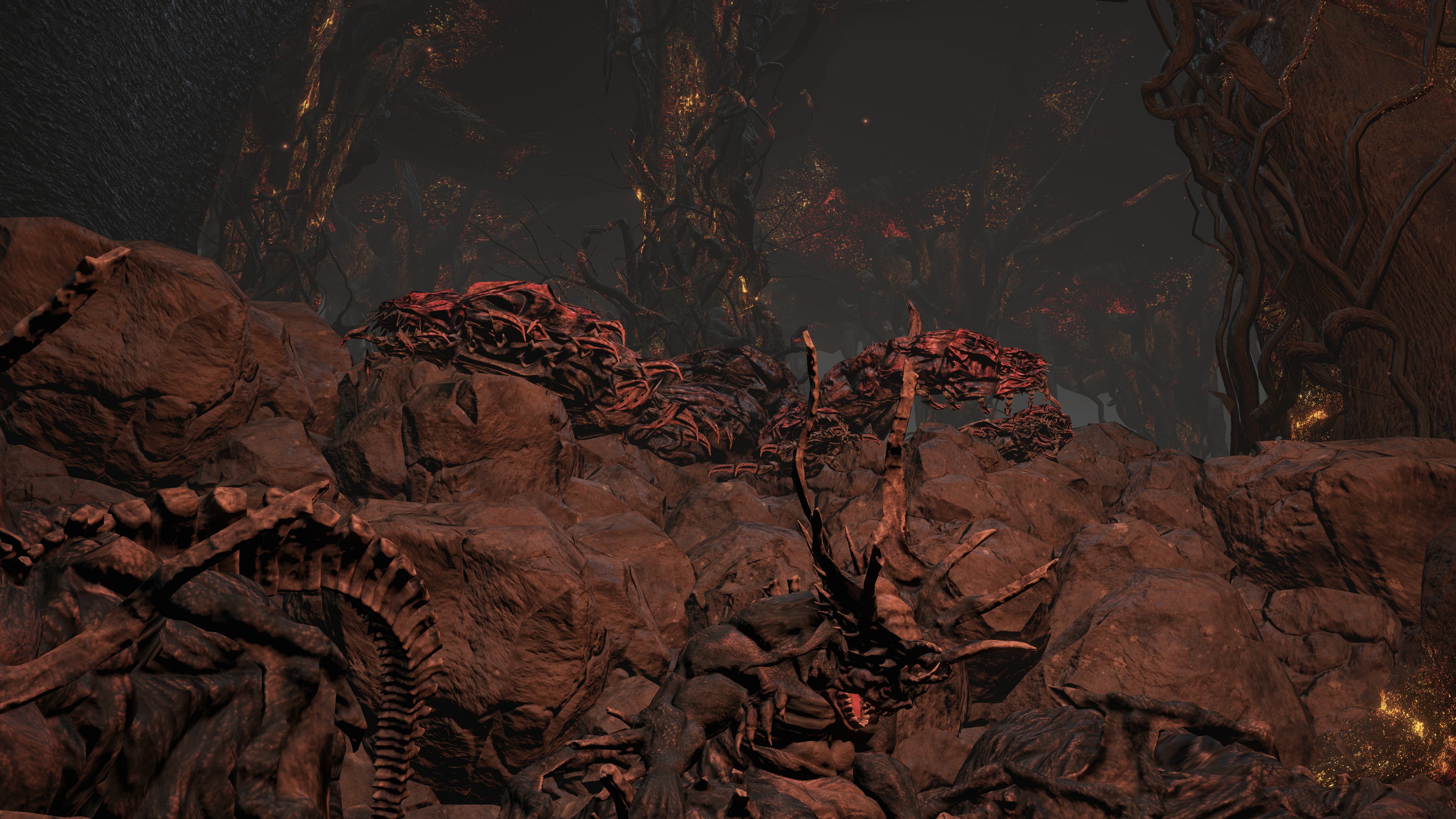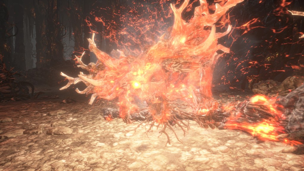 This helps explain the others’ continued habitation underground. Smouldering Lake brings to mind Ash Lake, though the area differs in key ways from the Lower World seen in DS1. For one, the archtrees are covered in overgrowth, while the ceiling they hold up has formed long stalactites, proof of all the rainwater continuing to drip down since DS1. Despite this, the lake is obviously shallower, but it is also bathed in warm embers to keep it that way. This is consistent with the general location of Izalith, within a ginormous cavern on the same level as Ash Lake. In short, the portion of the Lower World near the Flame of Chaos’ birthplace has become an area rich in the fire remaining in the region even after the source drifted to Drangleic. Gathering the demons in this high density of flame has created a cumulative heating effect, the bonds between each smolder reinforcing the other so that they collectively last longer. In that case, it was in the chaos demons’ next best interest to coalesce every piece of their First Flame that they could find. And one such demon had done so better than others.