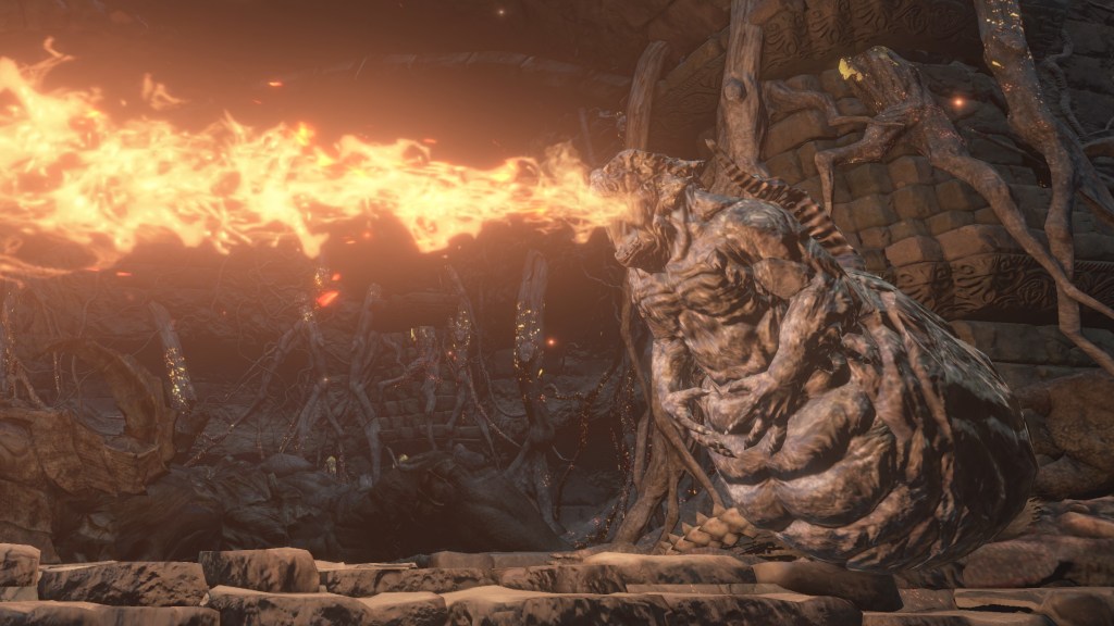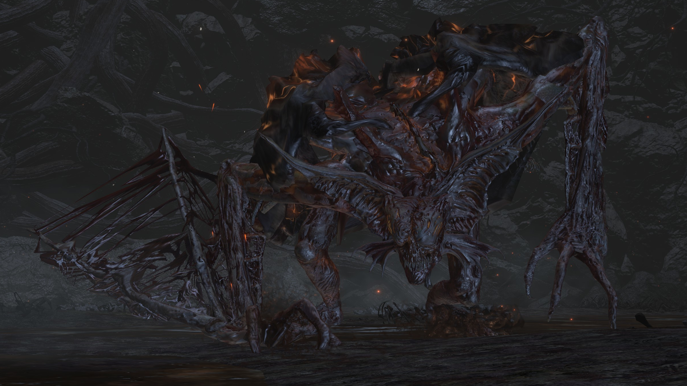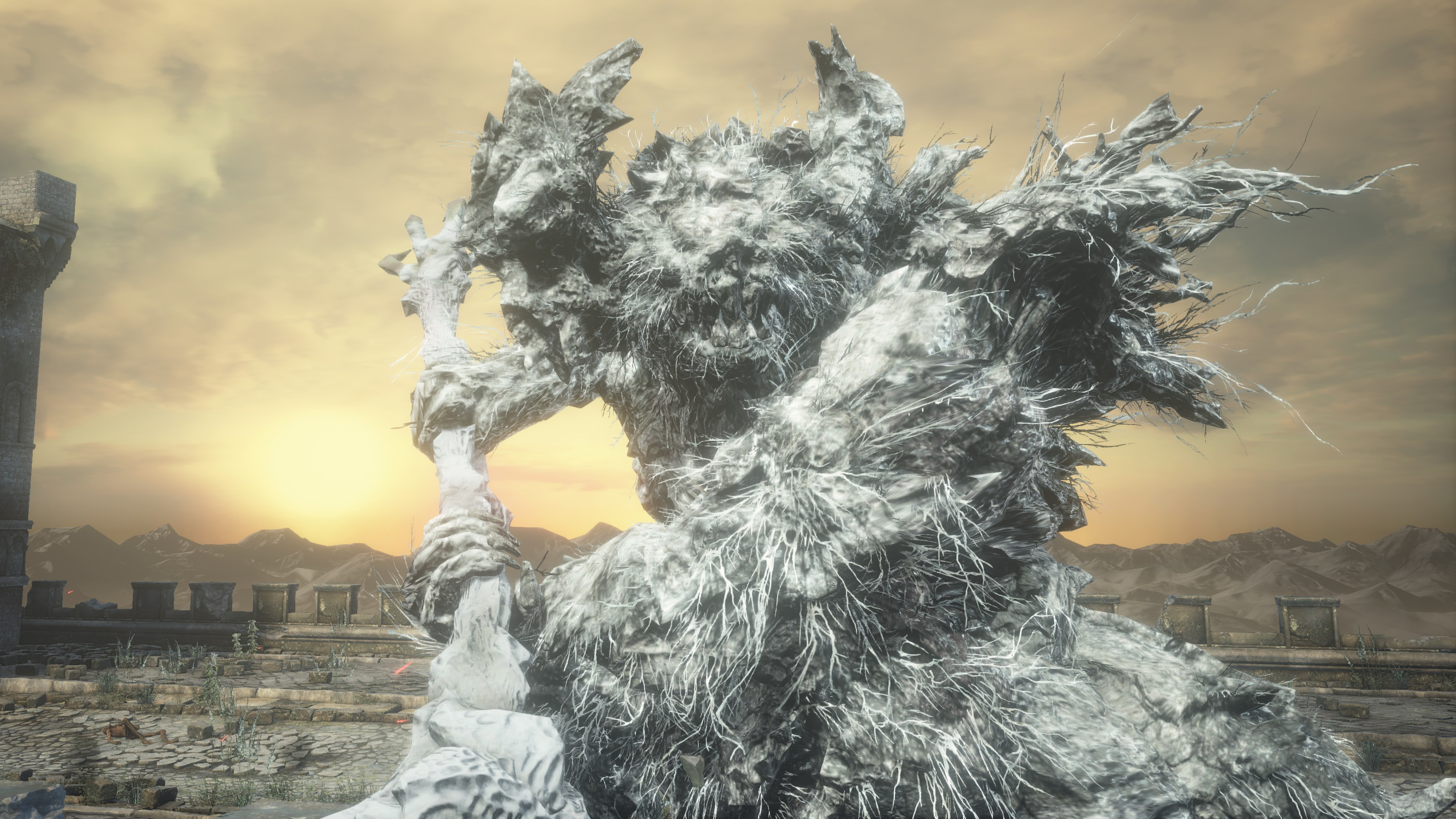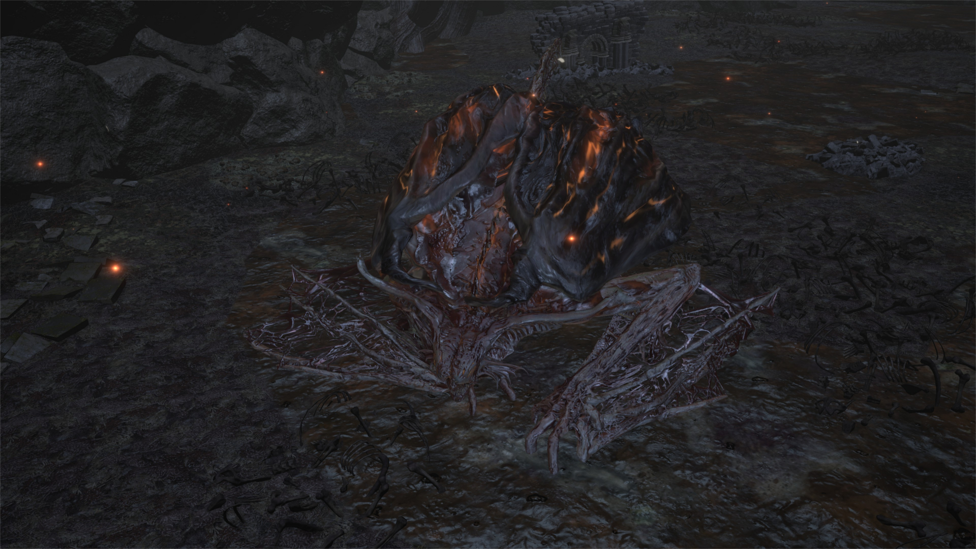 Whatever the cause, the fact remains that the Flame of Chaos met its end, leading to the demons it bore becoming a dying race. While “stray demons” were present in DS1, the Stray Demon of DS3 alone has lost its smolder, and only recently based on the corpses with charred humanity surrounding it on Lothric’s bridge. It is also the only one to spend a prolonged period far from home since the Old Chaos’ destruction, excluding the batwing demons who have long stopped relying on Chaos for power. The Flame of Chaos is the First Flame for the grotesque life spawned from a seedbed, so what we see with the demons parallels what we see with life derived from the First Flame — the text for Chaos Bed Vestige even notes mankind’s similar relationship with fire. And what relationship do we see? As Flame’s effect upon this stagnant world wanes, many human bodies petrify. In this way, the Stray Demon’s form can also be attributed to Chaos going out, bonds between the vestiges of chaos fire that the demons carry naturally weakened. In an environment devoid of its First Flame, the demons’ own fire eventually burned out.