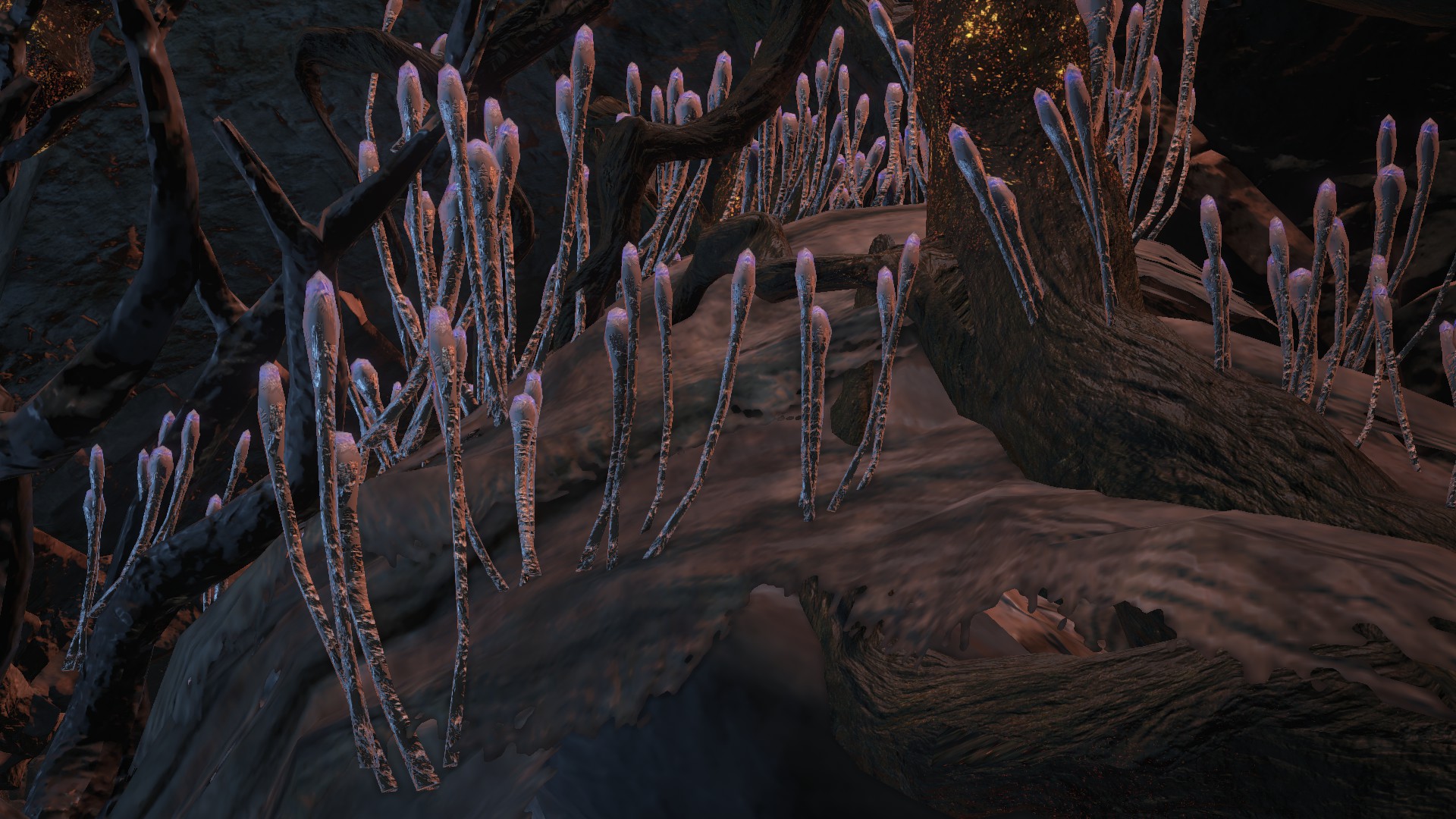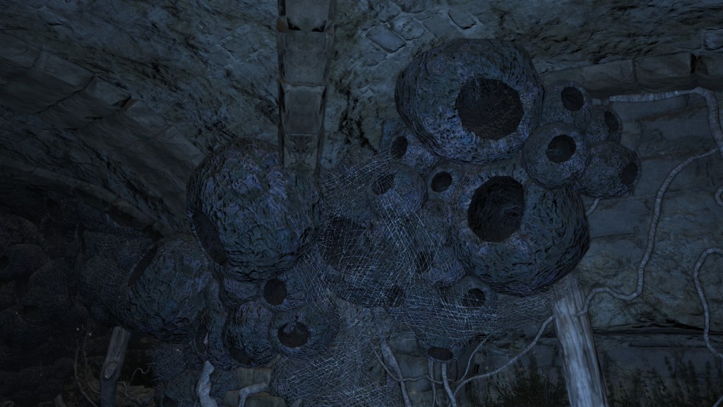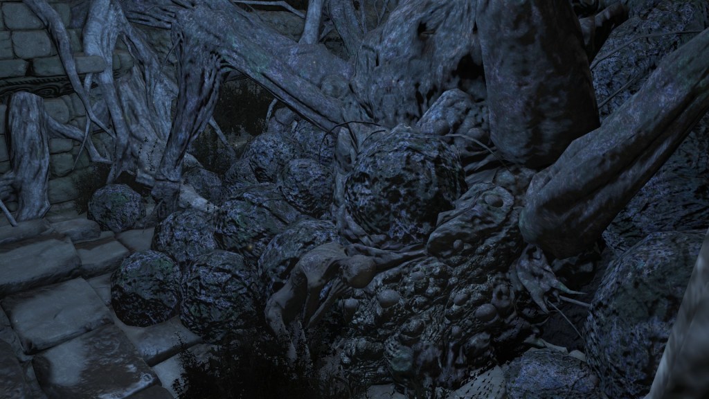 Surrounding the spider demon’s body are the same eggs she laid in DS1, revealing her continued effort to birth new generations of demons. In DS1, Quelaag had attempted to use the principles behind Chaos and Fire Keepers to make her younger sister into a new seedbed for demon parasites that would combine with their followers. This plan to revitalize their dying land with new demons ultimately failed due to the Fair Lady’s compassion for her followers resulting in her sharing their debilitating sickness. But despite all the stillborn eggs she had laid thereafter, she apparently continued to try. Even more of these eggs can be found in a larger chamber directly below hers. The fact that this chamber is flooded and free of the embers littering the area outside the Chaos Witches’ section indicates it to have a much cooler temperature, which is probably why the vast majority of eggs were left to incubate there with the mossy overgrowth. Despite past mistakes, the Fair Lady has done her best to fulfill her deceased elder sister’s plan after all of these years.