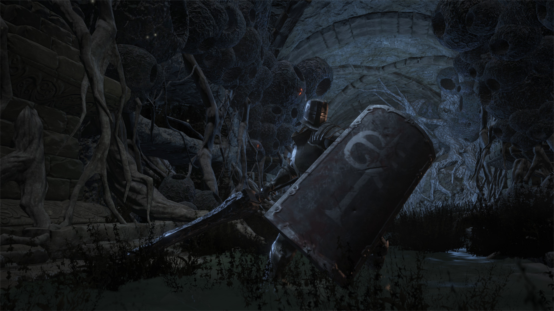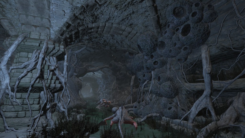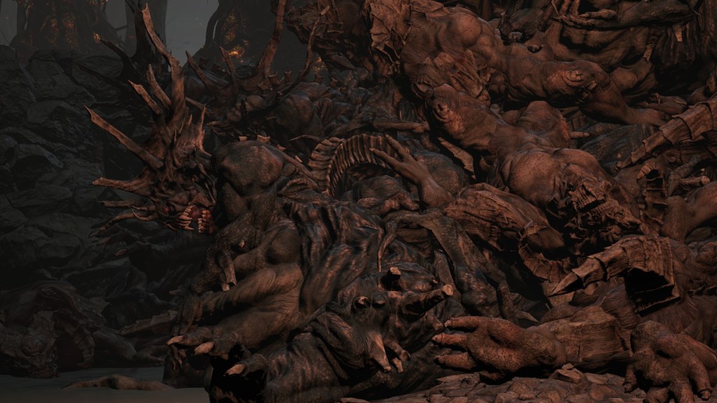 Meanwhile, leftover flesh from the battle have become cursed by their deceased owners’ resentment, coalescing into the smoldering carrion crawling throughout the ruins. Admittedly, examples found in the lava-flooded chambers may predate the conflict. The fire gems this carrion carries suggests the demonic nature of the burnt flesh regardless. That grudges are beginning to manifest gives the deacons all the more reason to provide their brethren a proper burial. Time is certainly of the essence. While life born of the Life Soul still looks to not rot even in death, one deacon’s corpse is growing strange fungi not seen anywhere else — though we do see more in concept art for the area. Considering the close relation between flora and fungi throughout the series, this may be the chaos equivalent of human dendrification. If so, then it is only so long before the others begin exhibiting similar symptoms of the world’s stagnation, be they alive or dead. But there are too many dead to give the proper respects, leaving those alive exhaustedly spread thin. And no one cares for their plight. They are truly unwanted.