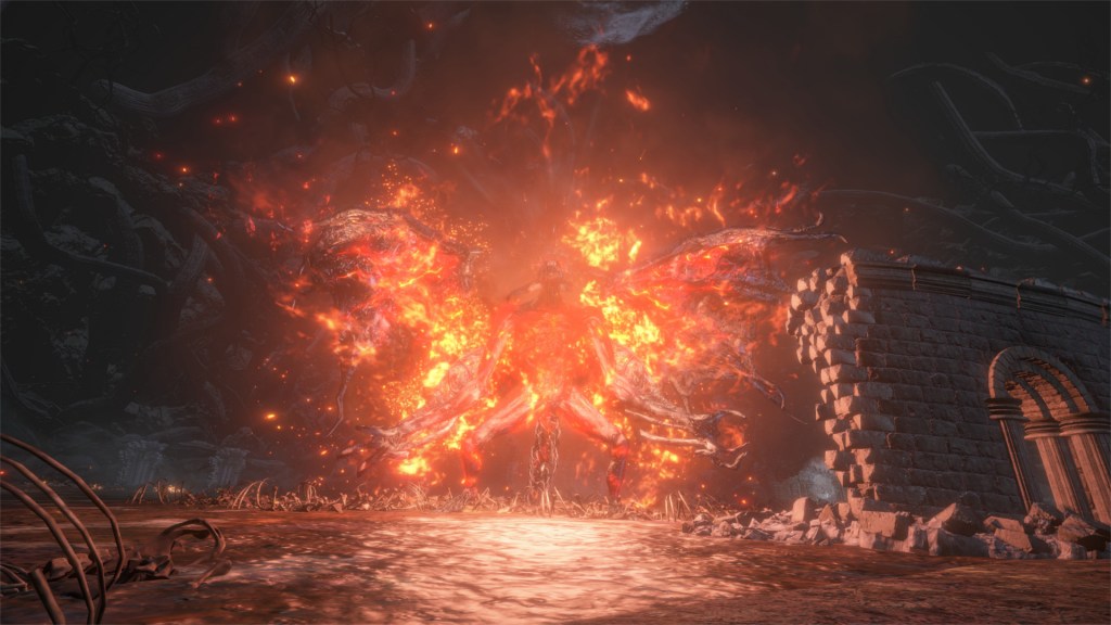 No, he is just an old man drained both physically and mentally. When we enter the boss room, his chaos fire is mere smoke until he detects our presence, which quickly builds up into an inferno. And as the boss approaches death, he attempts to unleash all his power left to kill us in an explosion. He afterwards loses most of his remaining fire and becomes too exhausted to stand, let alone properly fight. Indeed, his internal name of “ash demon”, (灰のデーモン) associates him with the aftermath of a fire burning out. This is a king long past his prime but still fighting with everything he has got while he can still draw breath. But that power is nonetheless exhausted, making our battle the last wind of a feeble king paranoid enough to assume us another invader to the kingdom he is still salvaging. In the months since his people were massacred, he is still gathering up the dead. That speaks to both his determination and his anxiety.