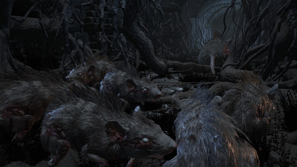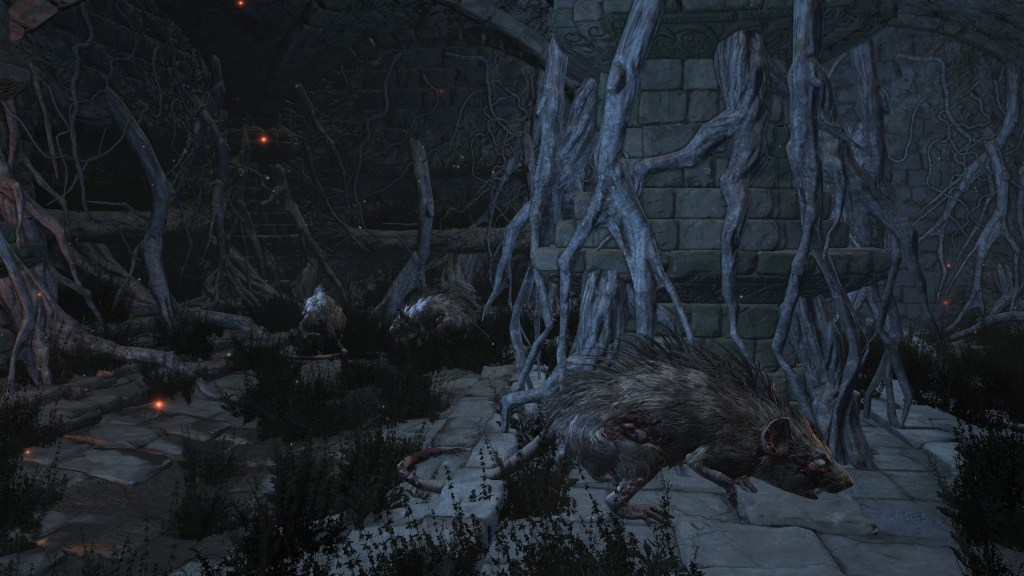 Despite these attempts to rebuild their civilization, the demons were still unable to rebuild their actual capital. The topography of Smouldering Lake indicates it to be within the vicinity of the lava-rich caverns that Izalith called home, and our discovery of an Izalithian pyromancy tome prompts Cornyx to conclude that we have discovered the actual lost city from DS1. However, we don’t see substantial Izalithian architecture anywhere in the area. Instead, the demons have taken over the lower levels of Carthus intersecting with their territory. Everything in these demon ruins from the iconography to the rugs belong to the desert kingdom. The only difference are the rats, who apparenty feed on travelers in addition to the long abandoned corpses. Evidently, the demons don’t have a city to call their own anymore, which is fair considering the state of the capital even before parts warped to the New World. The remaining demons probably continued to live in what was left of the ruins, but they were quick to vacate it once a new option arrived, perhaps due to other factors.