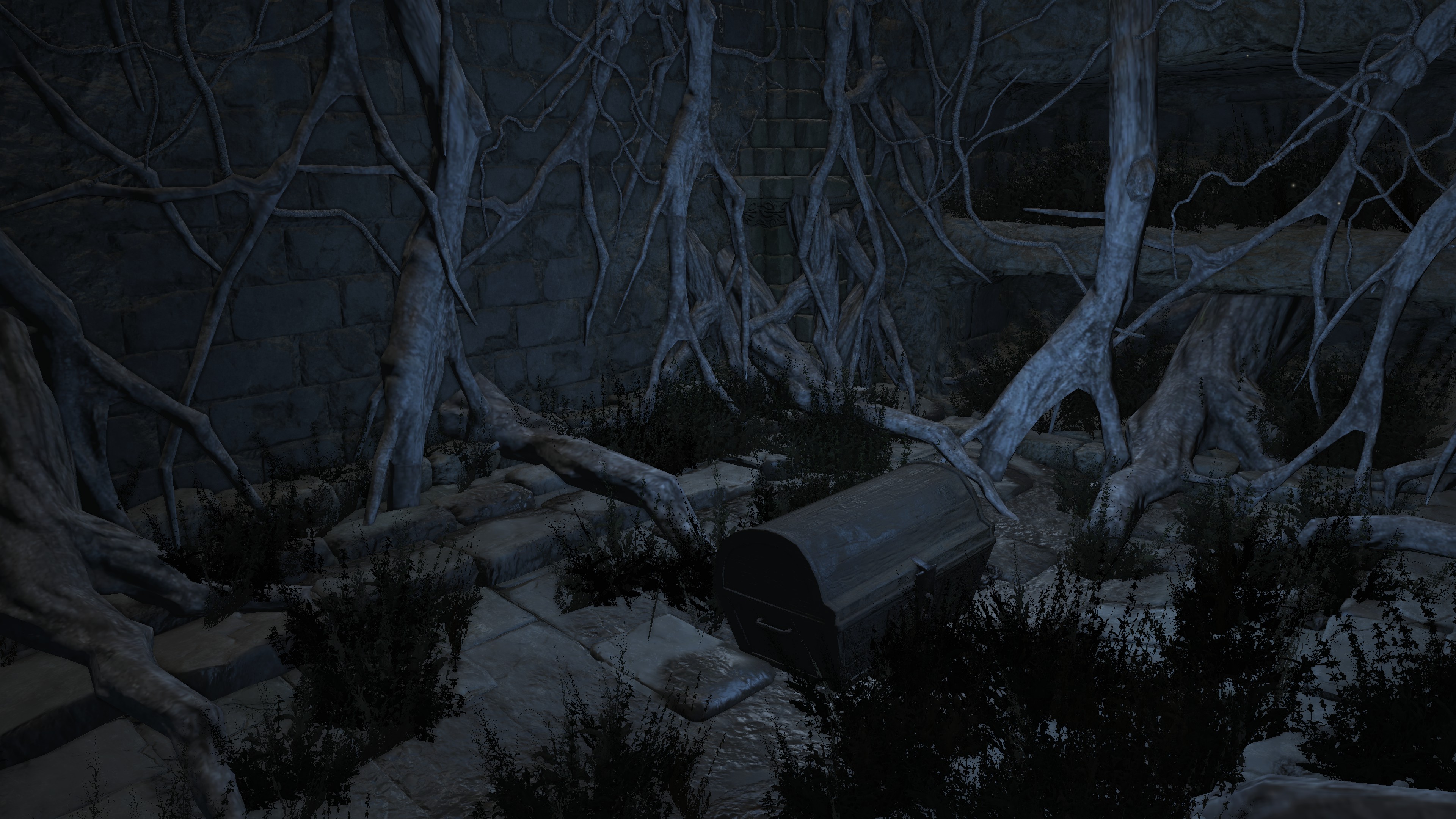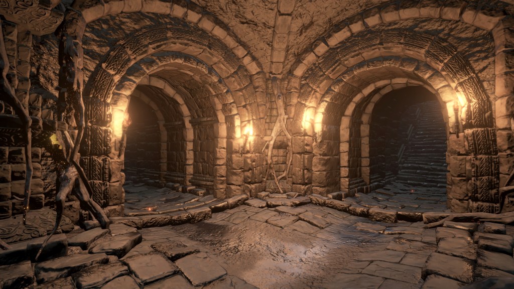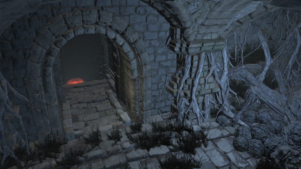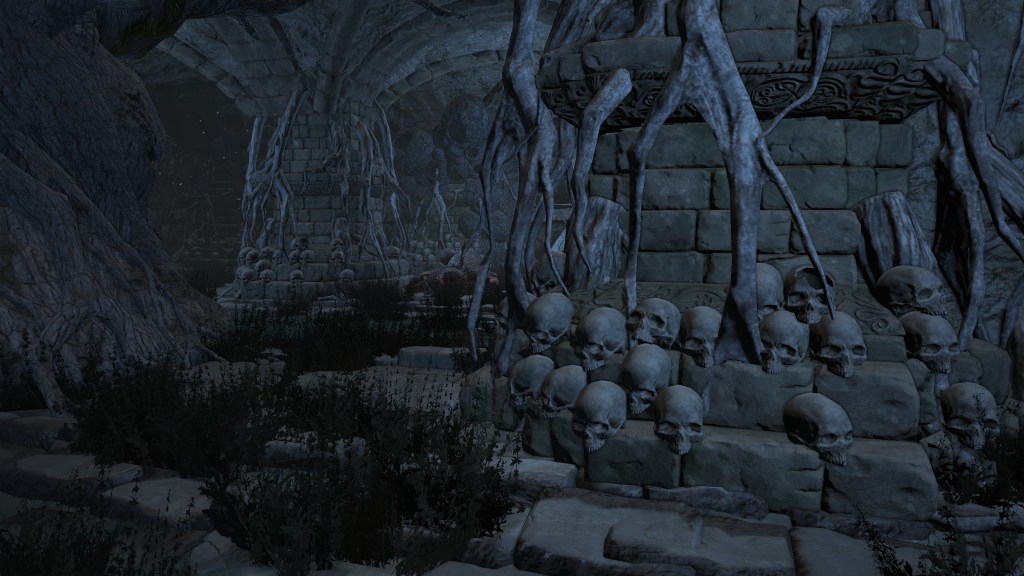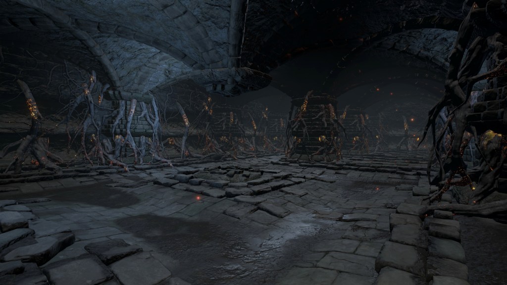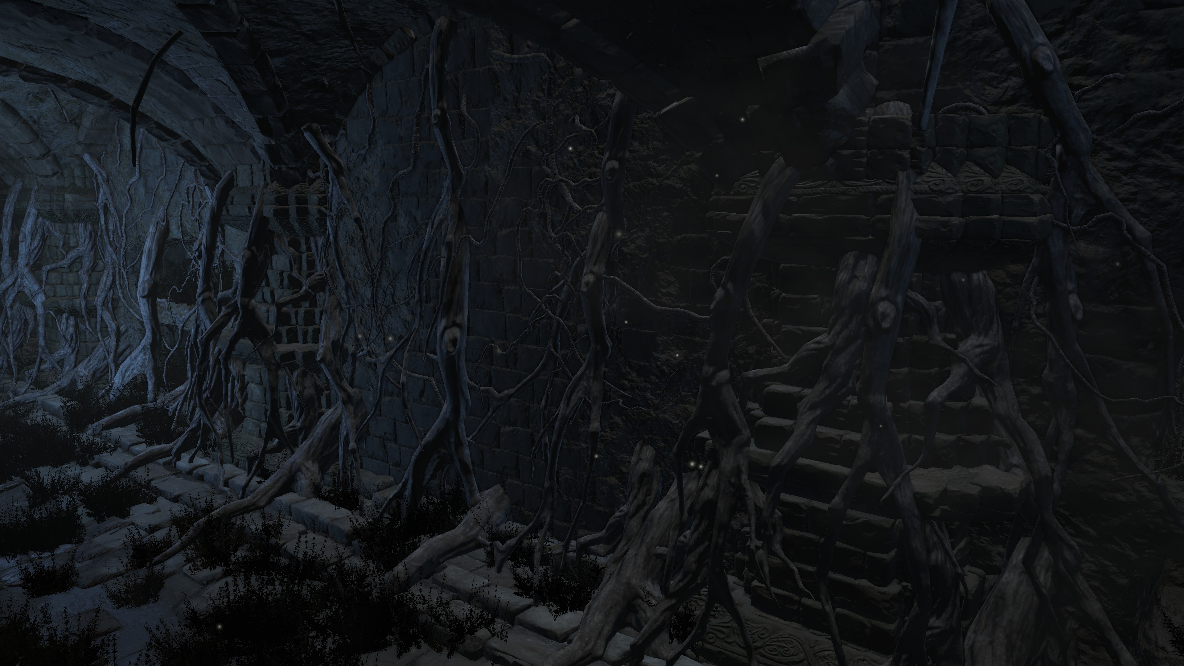 The Old Demon King has converted a large portion of the tombs into an antechamber for his apparent palace, while the large archway partitioning his boss room from the rest of the lake appears to mark a sort of throne room or personal chamber with a similar function. This is shown by the rug laid along the path through this archway, a decoration imbuing the chamber ahead with a sense of prestige not seen elsewhere in the ruins. Rather, these other chambers have been decorated with the demon statues that previously guarded the city of Izalith. Not all of these renovation were artificial, of course. Archtree roots burrow between the stone for much of the complex thanks to years of being situated beneath the lake. And several of the lower regions have at least recently flooded with lava that had previously oozed from the earth of Izalith. All in all, these tombs give off the same nostalgic air as the ruined metropolis that these demons once called home. That said, any relation between Carthus and Izalith likely ends there.