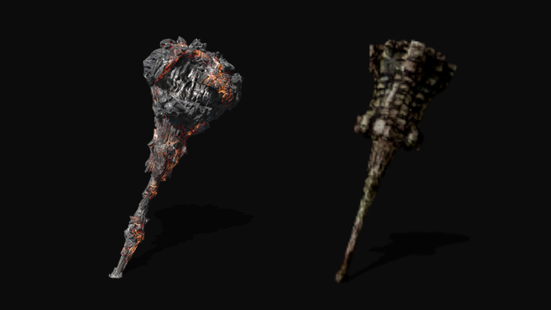The Old King’s Great Hammer is a mass of rock crudely shaped to have a long hilt. However, it is a weapon that “knows” old Izalith and retains remnants of chaos fire, making it capable of generating lava. It is thus most likely derived from some of the land that had been ravaged by the Flame of Chaos. Based on this and its crude make, the hammer was created early on, when the civilization was first experimenting with the power — hence its sloppy artistry compared to the Demon’s Great Hammer of DS1. That same game implicated weapons imbued with chaos fire to be “demon weapons”, although the only actual example of such was the sword possessed by Quelaag. Other demons wielded mundane weapons finely carved from the bones of their kin or the stone of archtrees. And while DS3 adds demons wielding a fire-imbued greataxe, it is never stated to be chaos fire. If the Old Demon King owned this chaos weapon since its creation, then he has carried it for almost the entirety of his lifespan as a demon.