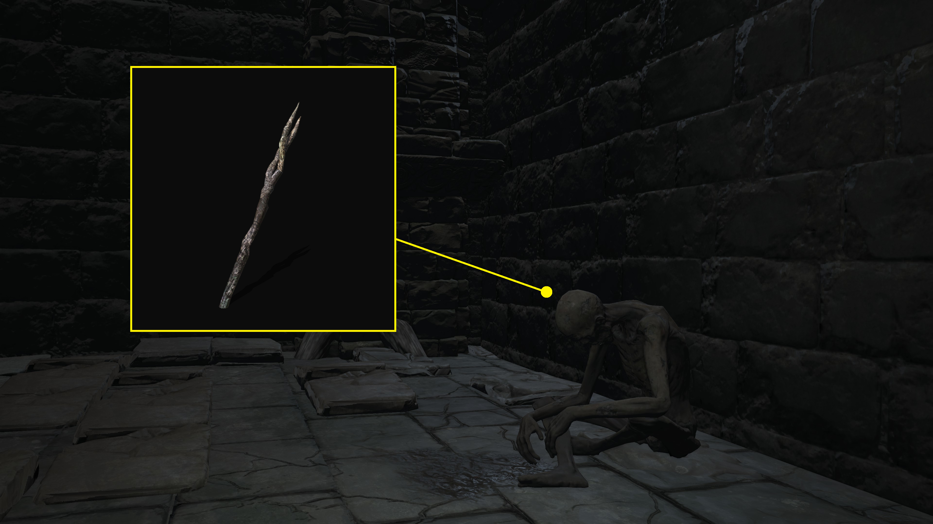 Attempts were also made to save the sacred treasure. The Izalith staff is on a corpse behind an illusory wall, which itself is behind a chest behind another illusory wall. Said chest contains three large titanite shards, a decent if underwhelming reward to hide. However, their juxtaposition with the corpse and staff suggest more to the story. If this was the palace wing dedicated to the gods, then their treasures, like this staff, would have been stored in such chests; there would also be attempts to hide them when the palace was raided, same as the owners. But with things going so bad, some loyal human must have decided to escape with the divine regalia before it was pillaged, swapping it out with some cheap titanite to hopefully satiate the vandals while he slipped out back. But after conjuring the second wall to cover his tracks, the servant apparently found his escape route on the lower level obstructed by a pack of basilisks wandering in to the cool, moist environment they so love. Caught between a war and a cursed place, he simply stayed on his safe ledge and starved to death — nothing for the demons went right.