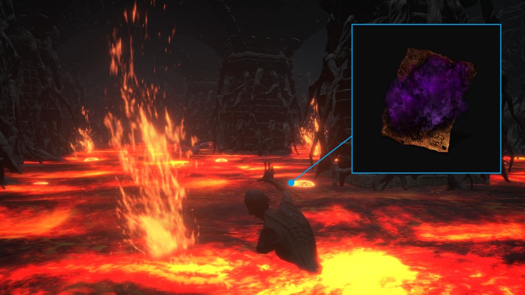 Being the Old Demon King’s palace, it comes as no surprise that the Fair Lady was also enshrined in the ruins. Behind an illusory wall lies the remains of the witch’s demonic lower half; nearby, a lava-flooded chamber with scorched corpses carrying Toxic Mist and the White Hair Talisman. The former is a pyromancy developed by Eingyi, a spell never known to the Great Swamp as its description now makes explicit. This reinforces DS1’s implication that the improvement to Poison Mist only came after the pyromancer got exiled by his homeland, particularly during his time at the Poison Swamp where he met the Fair Lady. Therefore, Eingyi must have been present to teach this pyromancy to humans in these ruins, and he only taught his arts to trusted servants of the Daughter of Chaos he always closely guarded.