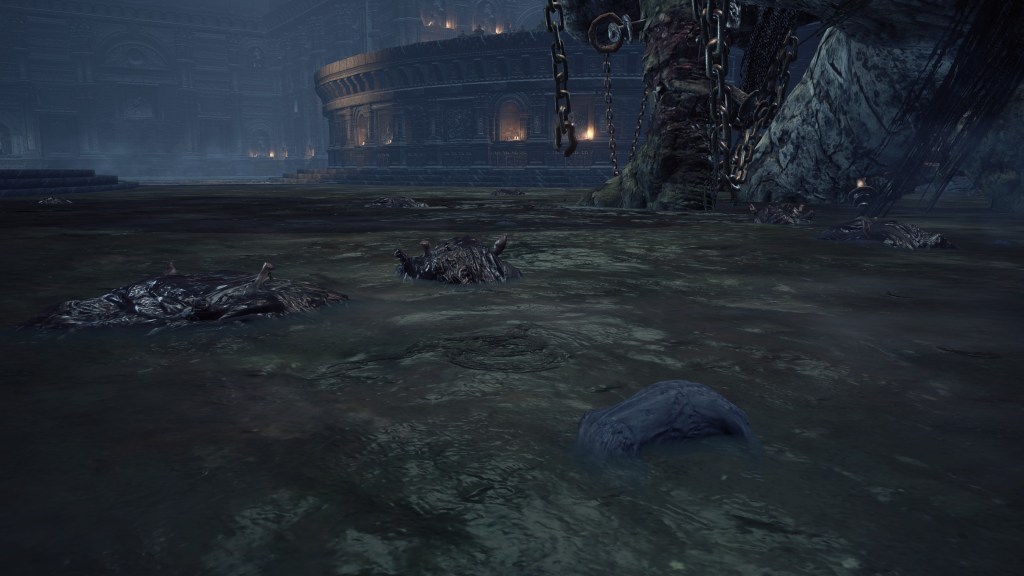 With the order all broken up, the traitors then helped Aldrich with his invasion of Irithyll, and now defend the god-eater as he savors his current meal. The two knights’ ability to enhance their weapons with the power of Dark via human pine resin leaves no ambiguity about their new allegiance. Perhaps that turpentine, corrupted by the fluids of humanity, was obtained back when they were still loyally battling against the Deep’s horrors, acolytes liberally igniting fires as they do. If so, then seeing how flame could be squelched at the source might have been the first crack in these knights’ faith in firelinking. Either way, the travelers returned “home” to see no more comrades to convert or execute, not that they necessarily care. The status of their brethren left serving Sulyvahn is irrelevant. Their journey has put them on a new path headed for a Deep Sea, and they are clearly ready to embrace the darkness. The two mercenaries we encounter may bear the culture of Drangleic, but they have failed to carry its legacy.