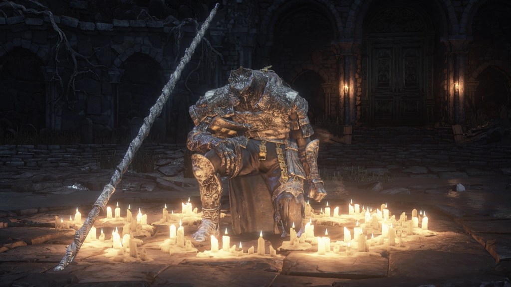 What if Gundyr was only late because he had been restrained as part of some ploy to guarantee he failed his ostensible mission? His true mission was always becoming a sheath for the coiled sword and a trial judging unkindled ash, and he was armed with that in mind. But this party had tricked the king into believing that he was to become the next Lord of Cinder, manipulating his sense of duty to bind him to the mission. When the time came to actually embark, he was captured and imprisoned until it was too late to complete — or would be, if the hero hadn’t evidently broken free and continued on to the ritual site. But as fate would have it, he slipped into the dark dimension en route, leaving him understandably confused. What he did know was that he was surrounded by enemies, a glaive-wielding Black Knight now dead in his boss room. So when we walk in on him kneeling in the ruins of the Firelink Shrine he was probably familiar with — seemingly to add some candlelight — he jumps straight for the kill. And once subdued, the warrior lost any chance of fulfilling his duty by the time he did return to his world of light.
