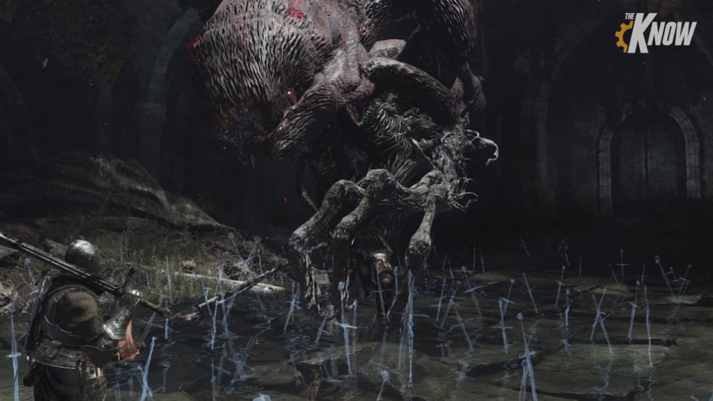 These developments beg two questions: who set him up as the judge, and why has he remained alive for so long? Being the centerpiece in the ruined chamber of Lothric’s old ritual place managed by its church, his kingdom is most likely responsible for making him the sheath. Leaked screenshots suggest as much. Gundyr would have been fought in the ruined temple where we ultimately find Consumed King Oceiros, the original firelinking facility befitting the founding king with the pus he bears befitting the surrounding garden where it currently runs rampant. Similar to the graveyard ruins, there was a chamber to battle the judge followed by another enshrining the Lordvessel, with the spectral swords surrounding him possibly denoting previous failures of the trial buried there; the multiple different swords we would have needed to pull out of his body before the fight reinforces the notion. As to the cause of his immortality, his pus helps reveal the answer.