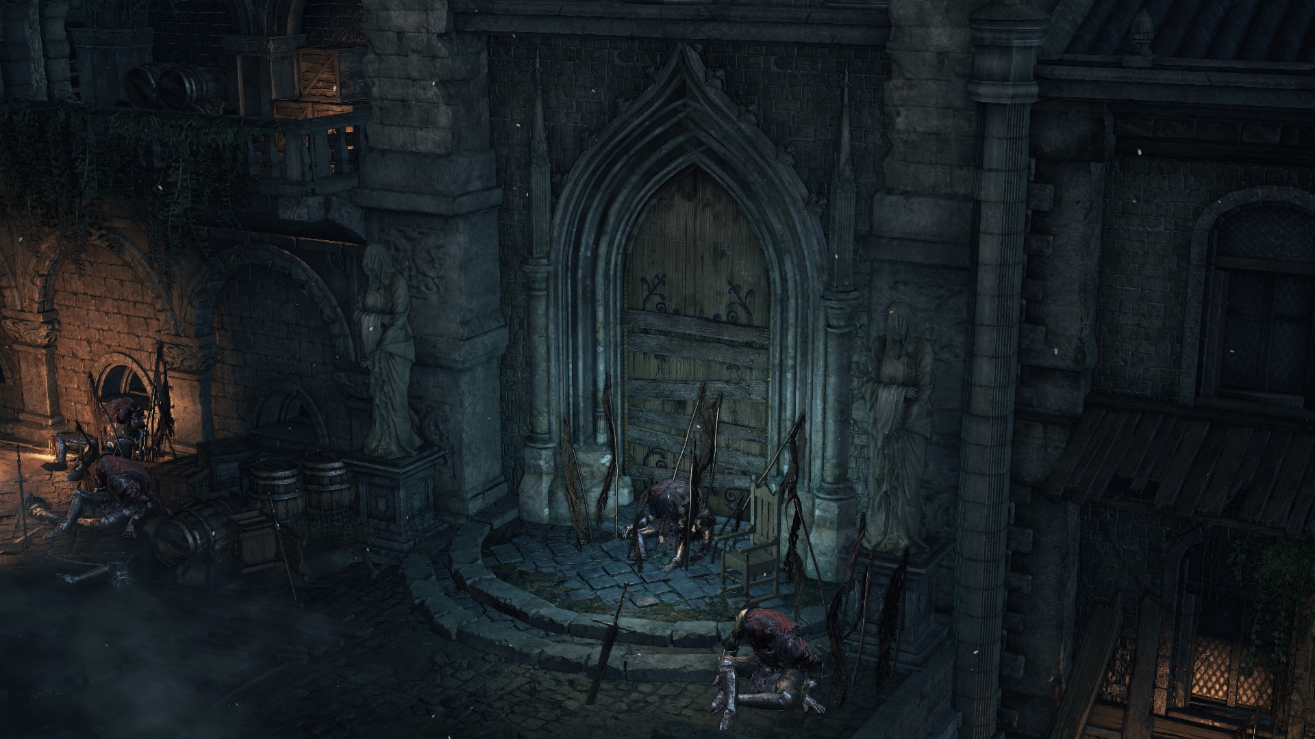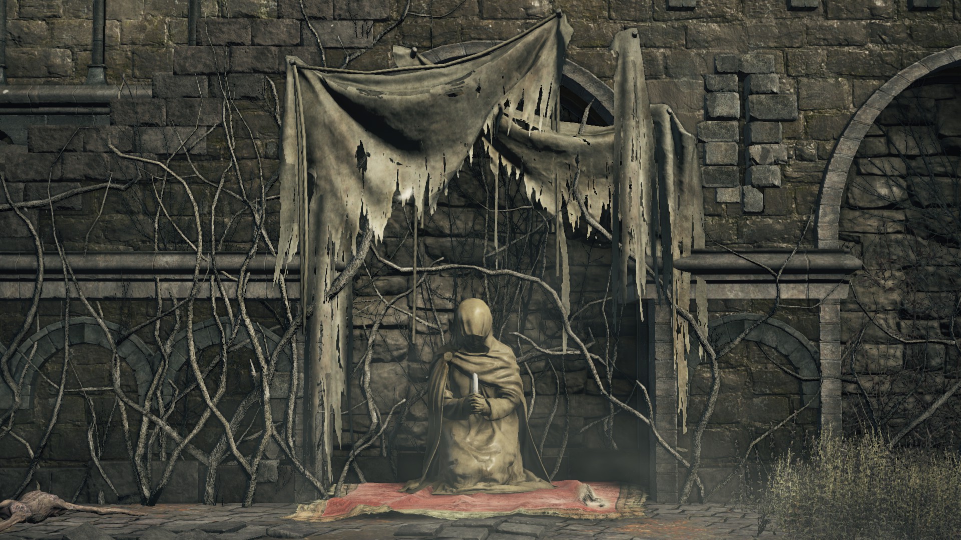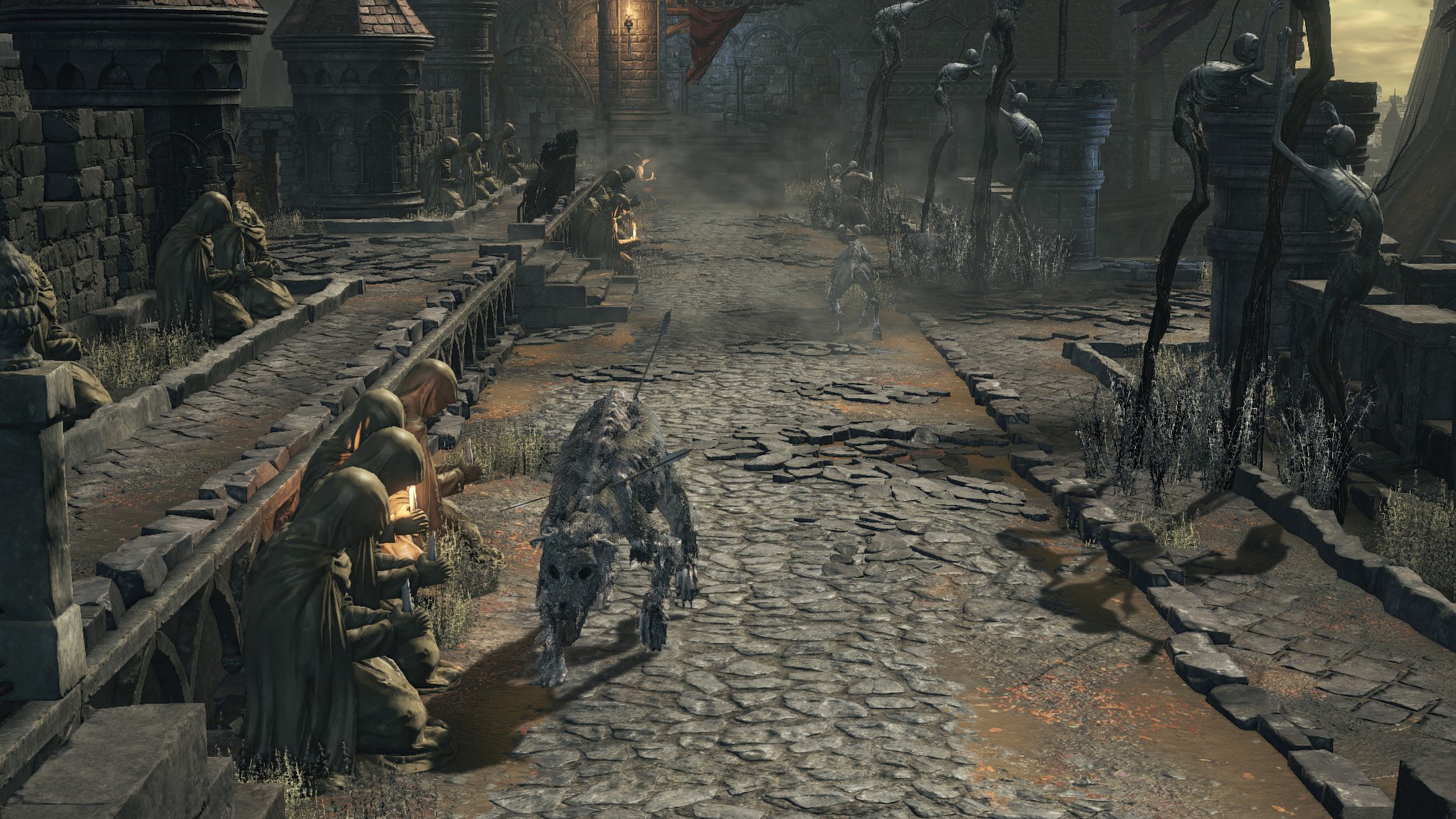 Naturally, this alliance extended to the forces under the knights as well. The soldiers’ iron round shields, leather armor, and royal guard scarves bear the same symbol of the High Priestess. Some even employ Undead Hunter Charms normally limited to church warriors. Statues of the High Priestess have also been erected, not only at the knights’ tombs but also at the front door to the city barracks — fittingly, the knight in command of the facility is a member of her guard. More statues of the hooded robed woman, this time kneeling whilst grasping a candle in prayer, line the city walls the soldiers patrol, all facing the direction of the castle. Clearly, the religious Pillar had a pervasive influence over both Lothric’s royalty and its military.