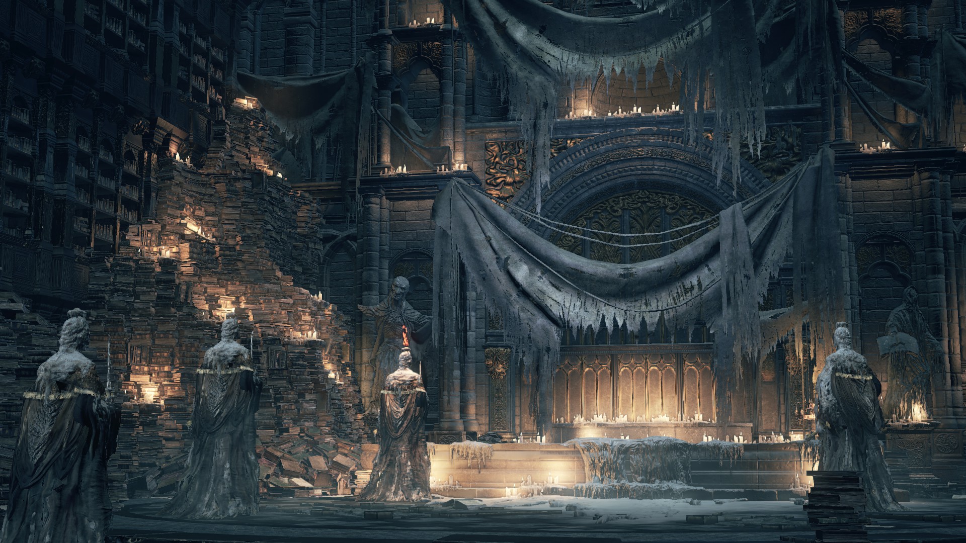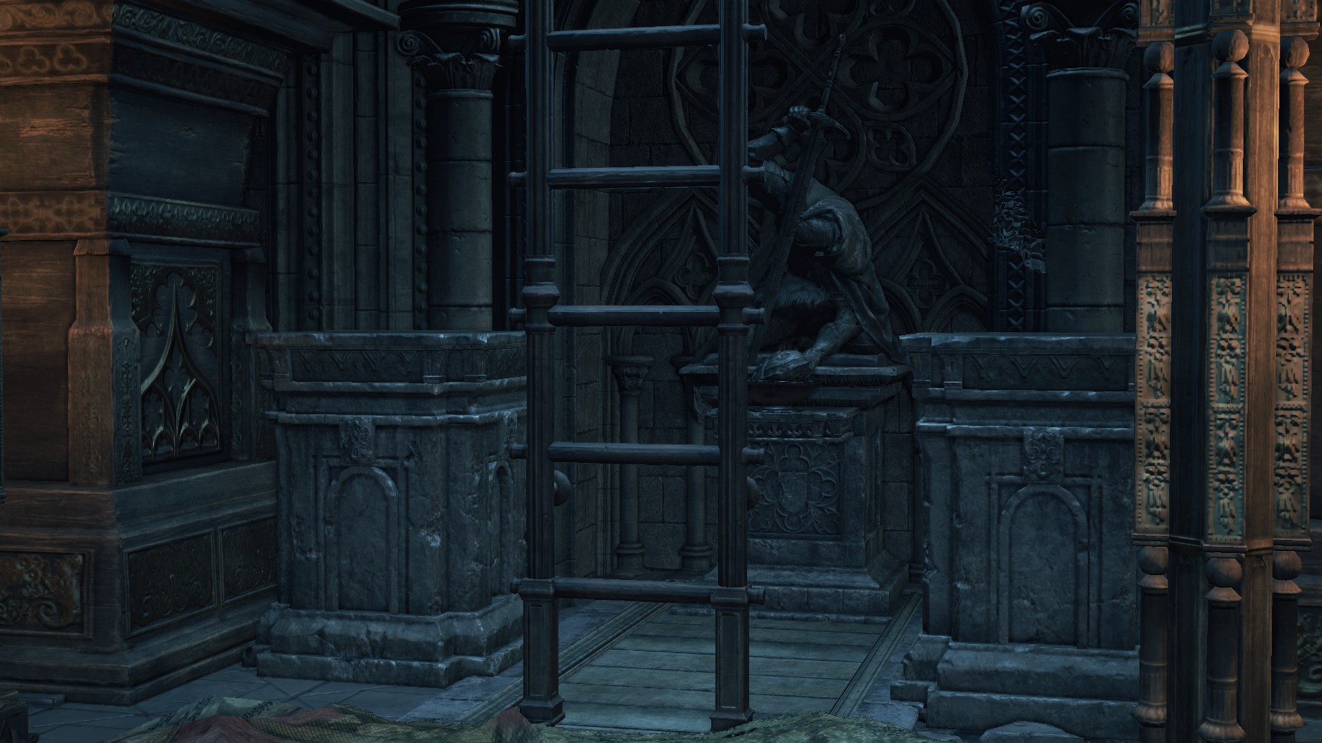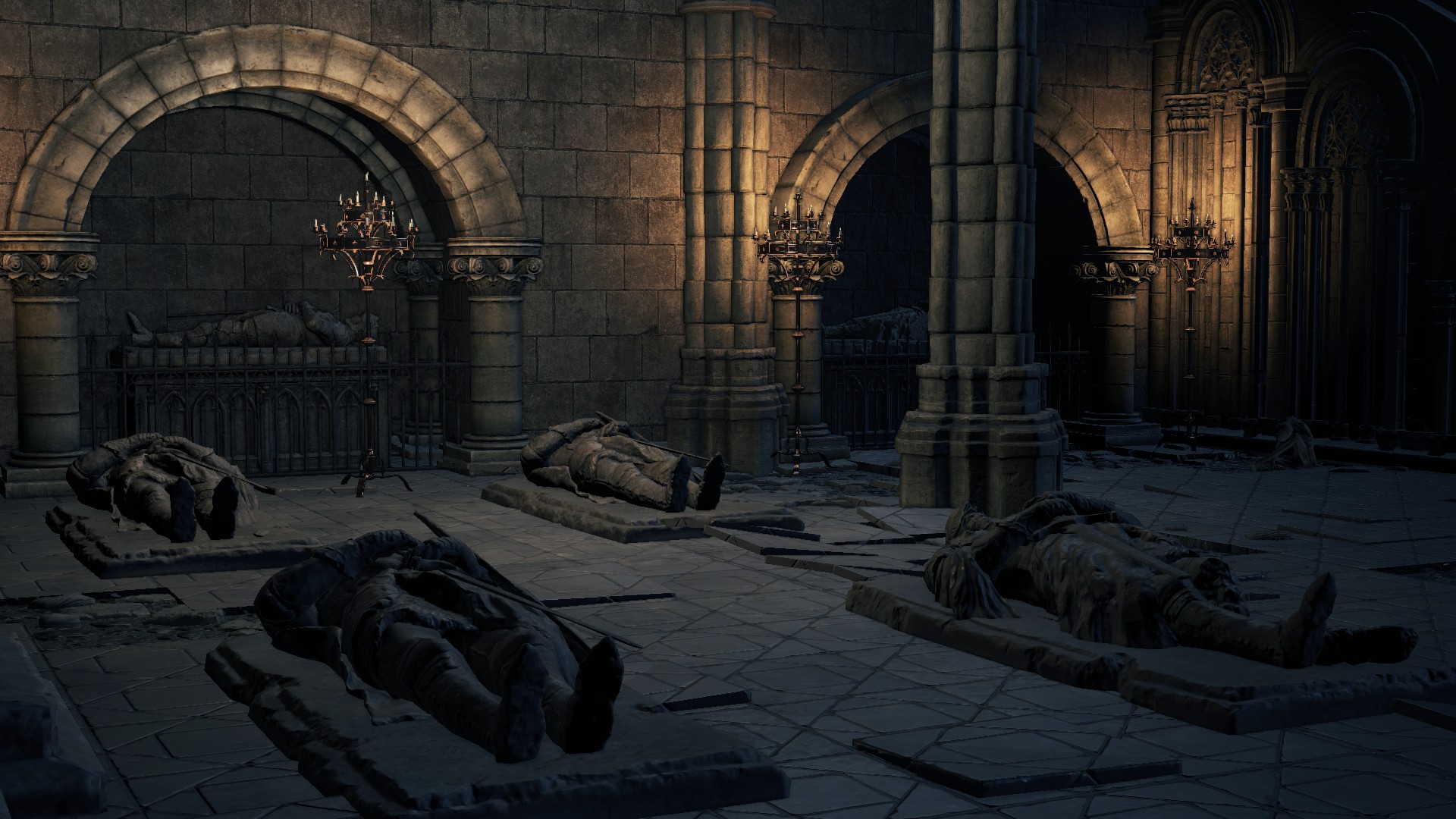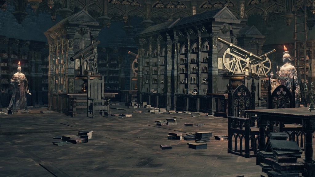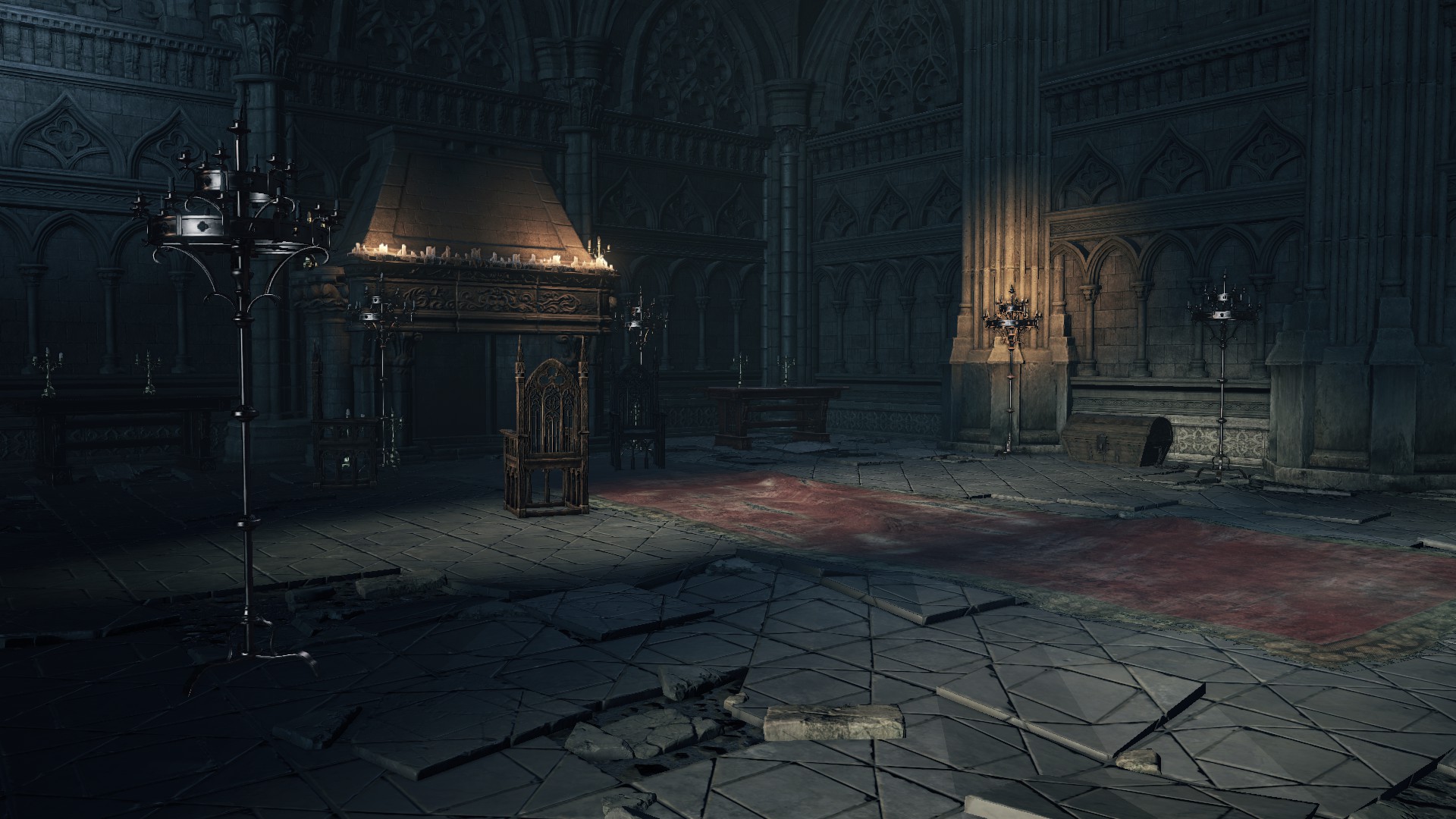 Since the knights strengthened their ties with the ritual chiefs in response to the scholars acquiring the Grand Archives, Lothric Castle was built with the two Pillars’ facilities intertwined. The priests performed final rites for knights entombed at the back of the church or training grounds, elaborate quarters for the High Priestesses spanning between them. Both Pillars have thus intermingled to their mutual benefit from the start. Considering that a shrine to the firstborn immediately precedes the knights’ fancy library, its books probably concerned things like the country’s political and religious history, each text specifically handpicked by the priesthood. By restricting their education to such topics, the High Priestesses could promote their sensibilities and virtues, thereby fostering a sense of national pride and religious fervor in the kingdom’s military arm. This is likely the reason for also locating the Altar of Sunlight at the exit, subtly nudging knights into devoting themselves to the covenant of their heritage they just read about — from the sunlight medals all in the castle carry, it worked.