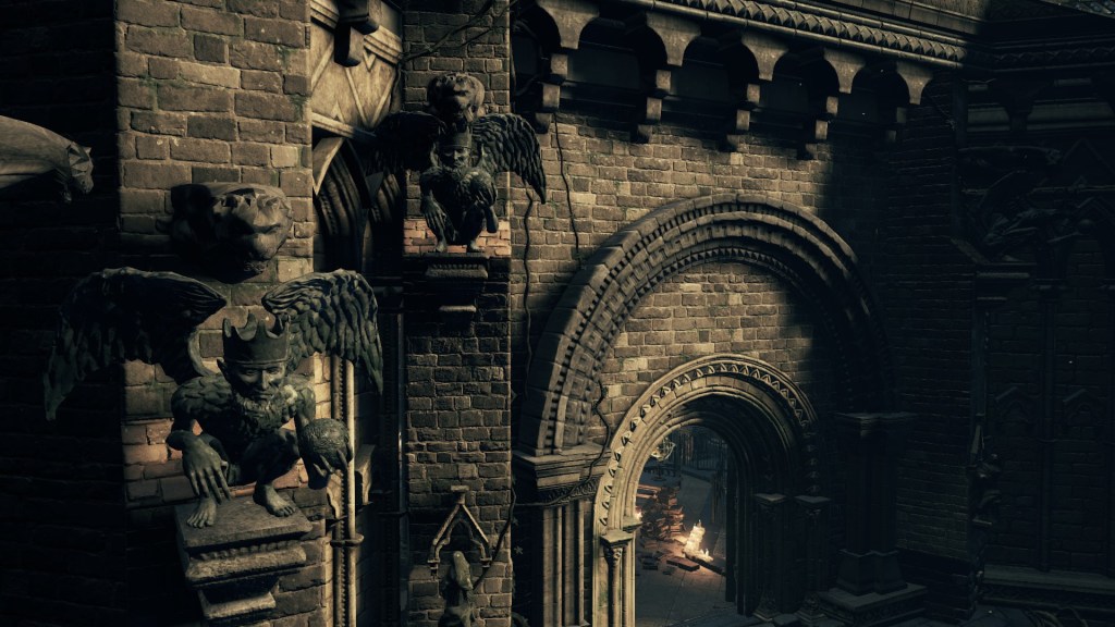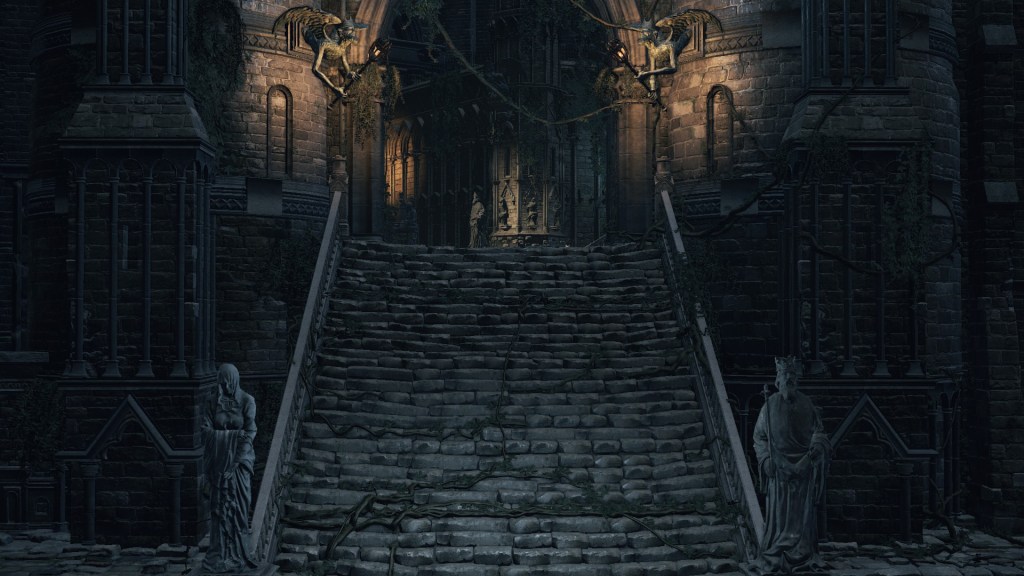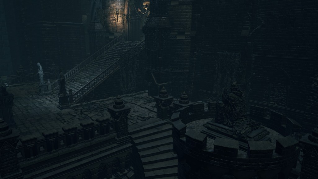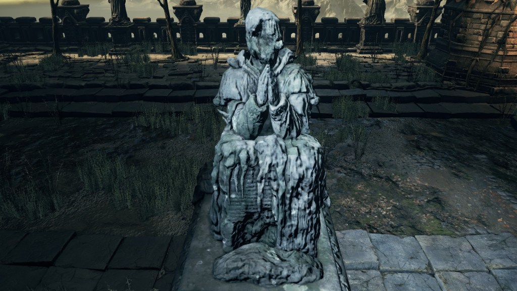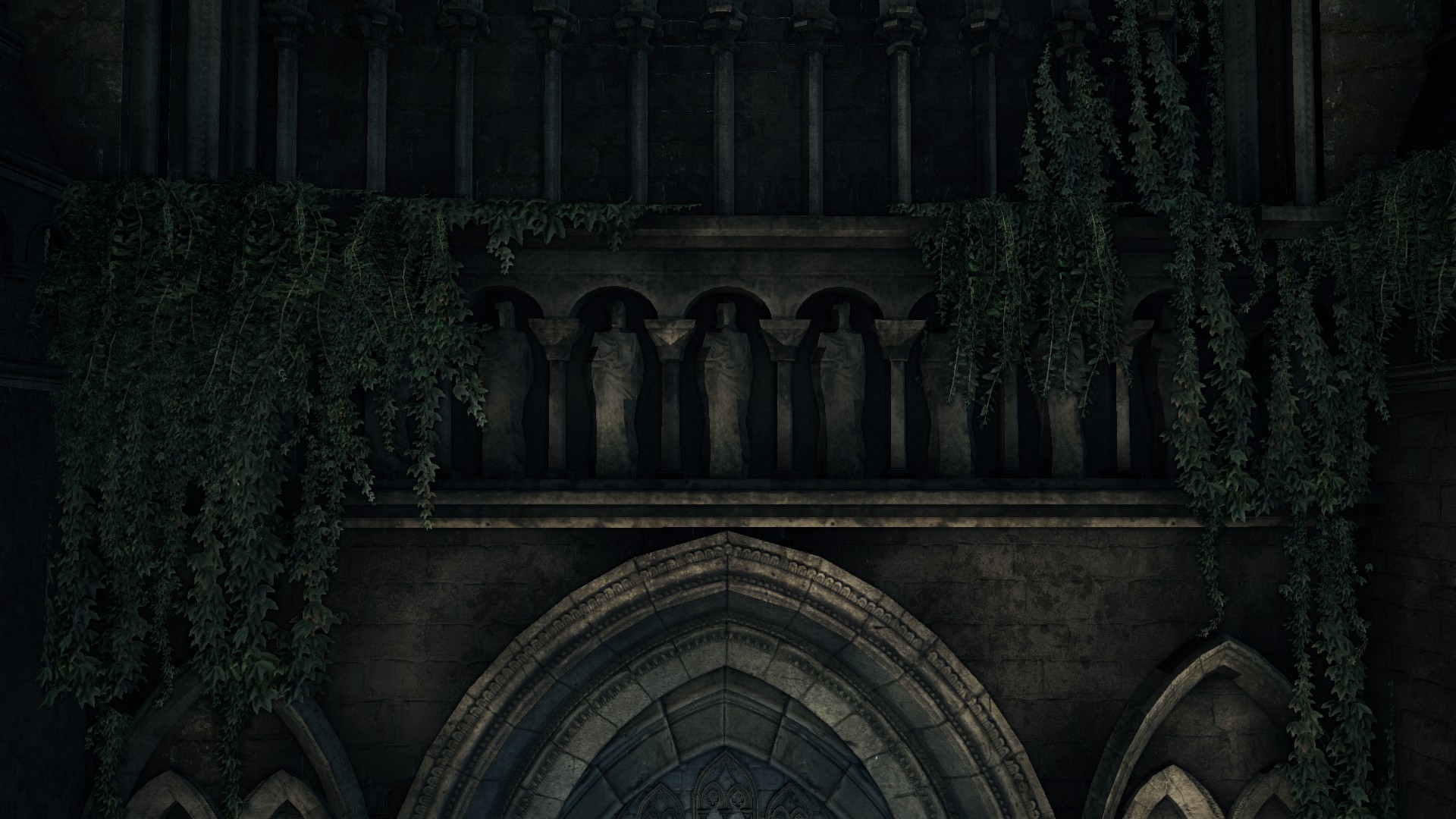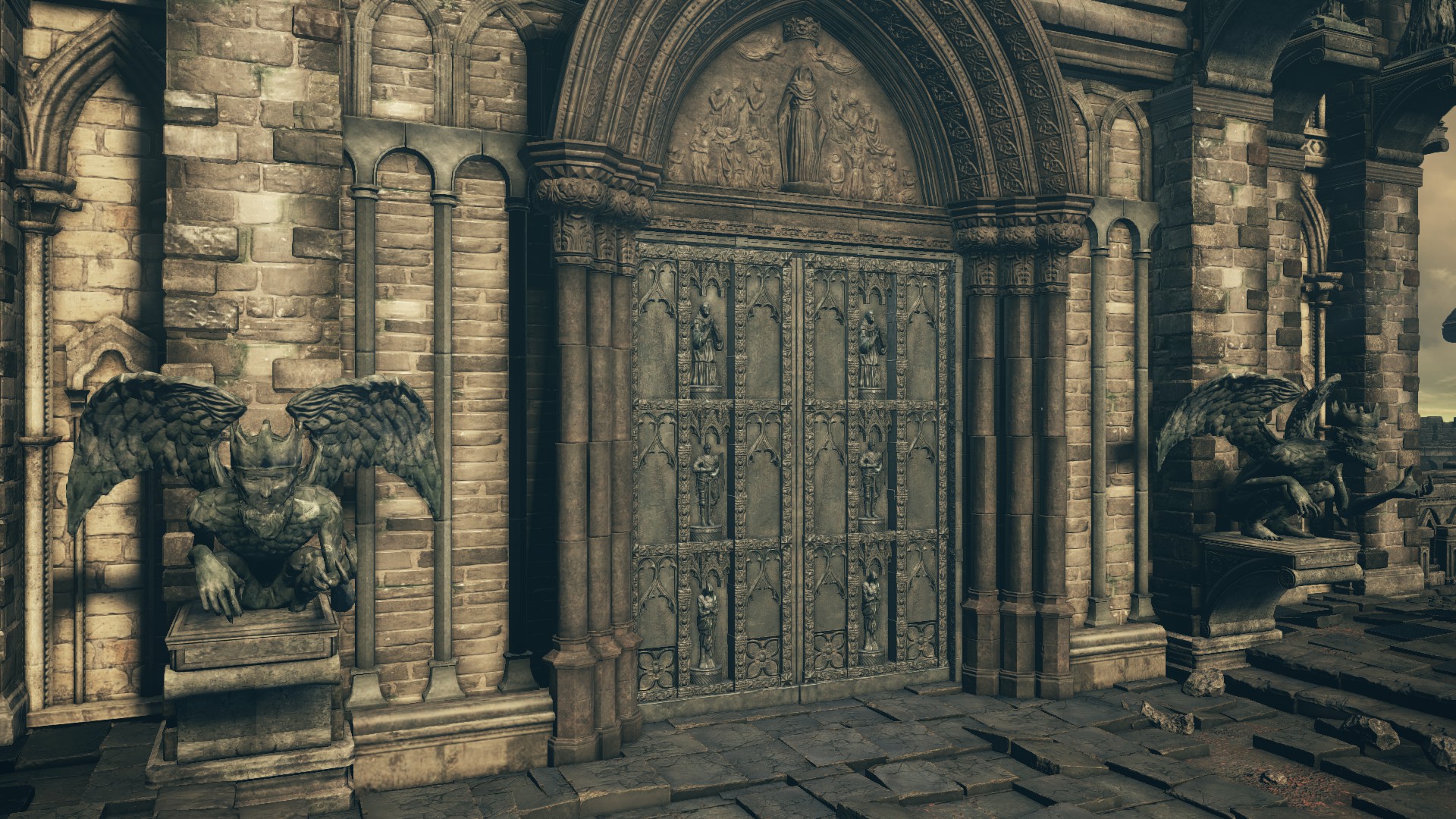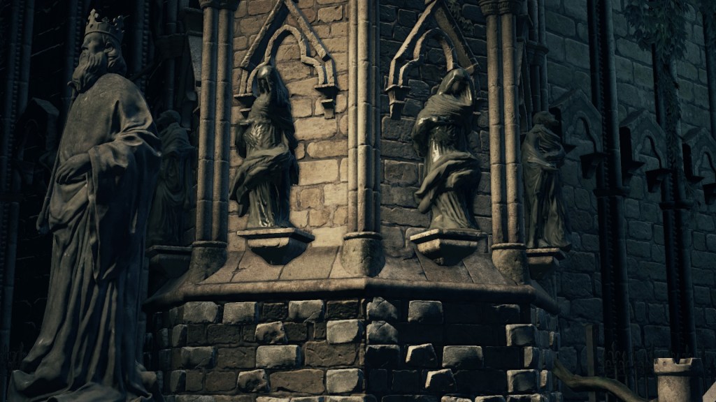 The bridge to the Grand Archives from the facilities for the Knight and High Priestess is ornamented with statues of the Scholar and a primordial serpent as an angel. Juxtaposing the two is a reminder to temper reason with piety, and the Knight holding his own head as the bridge’s centerpiece reinforces self-sacrificing obedience. Following the bridge are statues of the High Priestess and King flanking entry to the courtyard, another reminder of who truly lords over this place. Above them are gargoyles of the angelic King with torch in hand. To the side is a statue of a Scholar praying over a stone slab etched with text, both of which have been melted by the evident force he prays toward. These all signify the King and Scholar’s submission to holy flame.