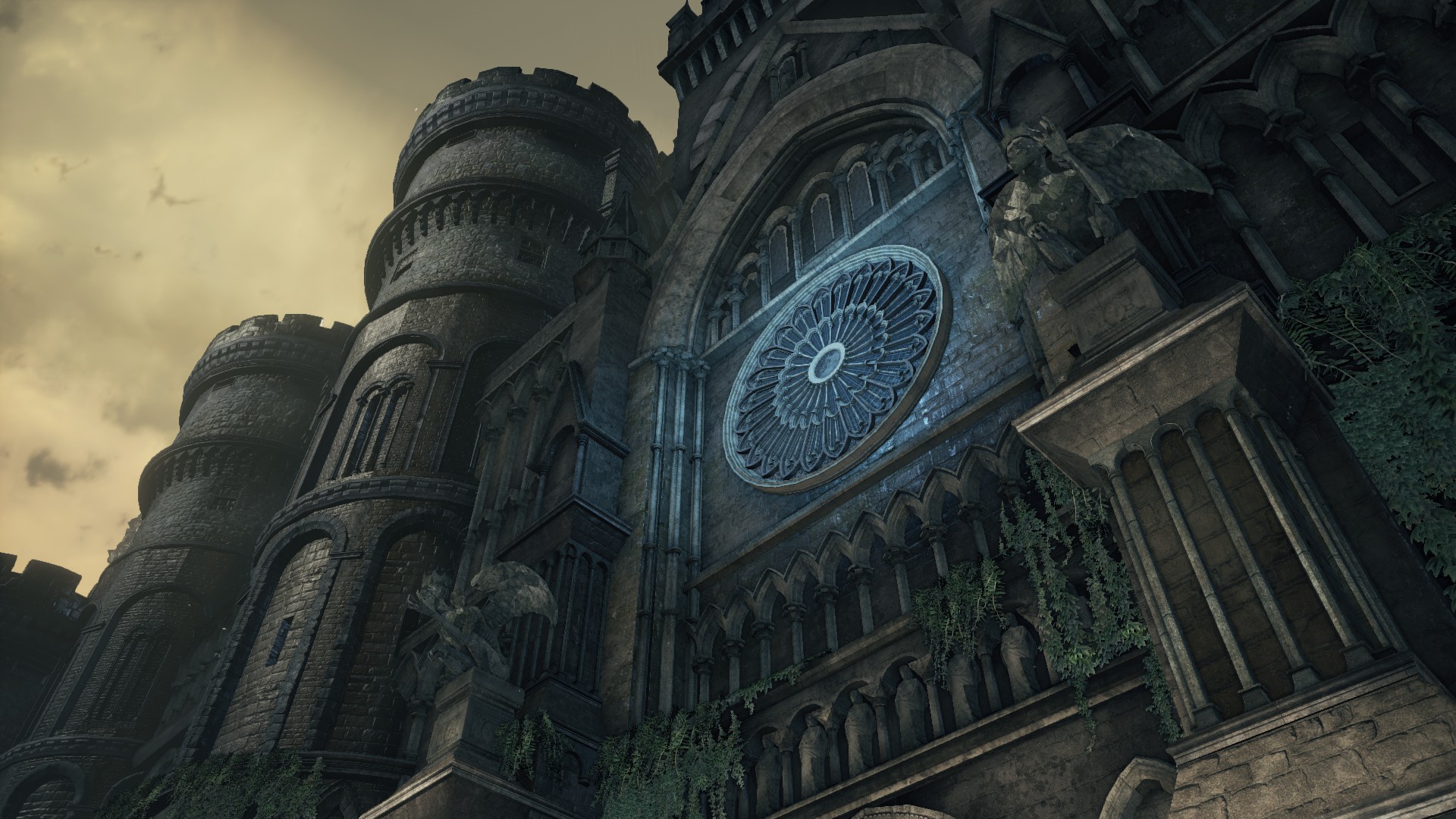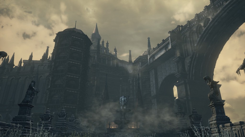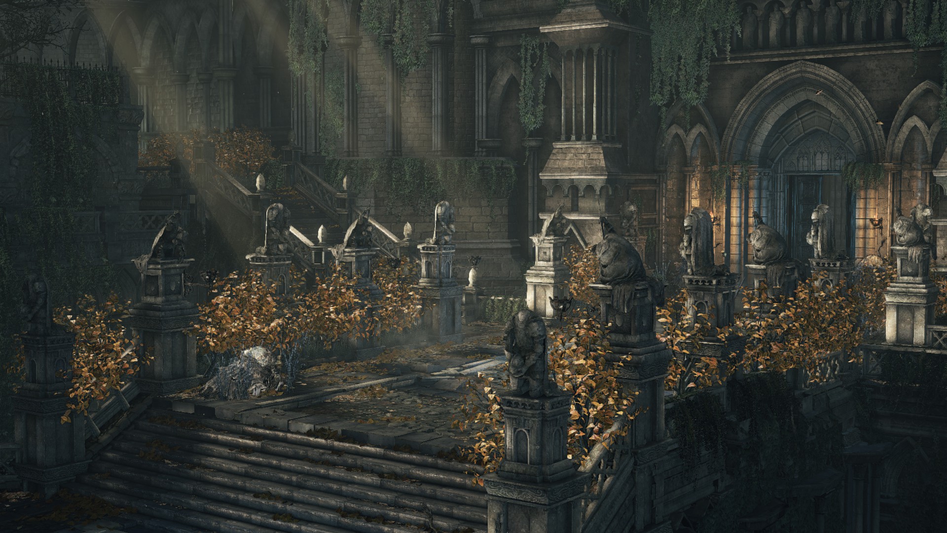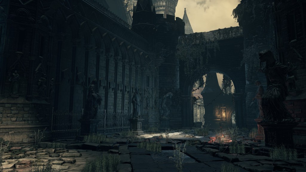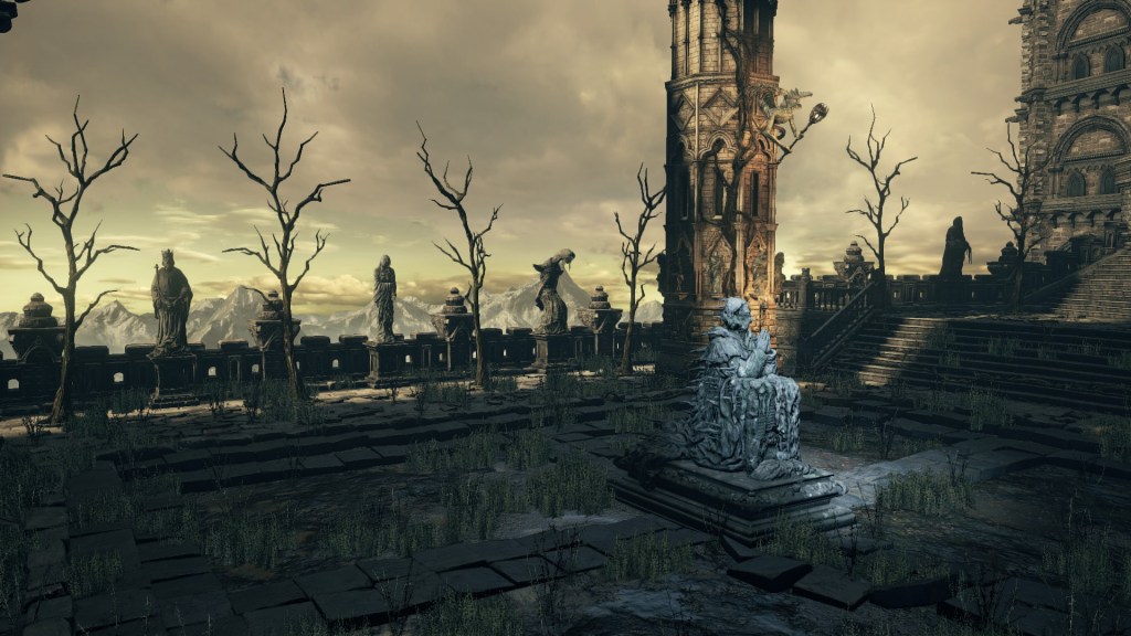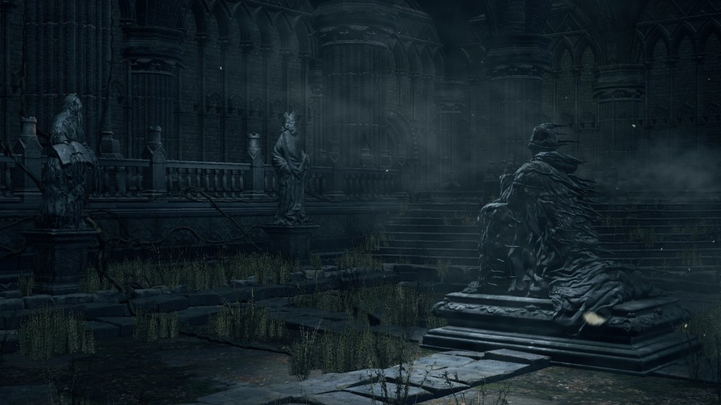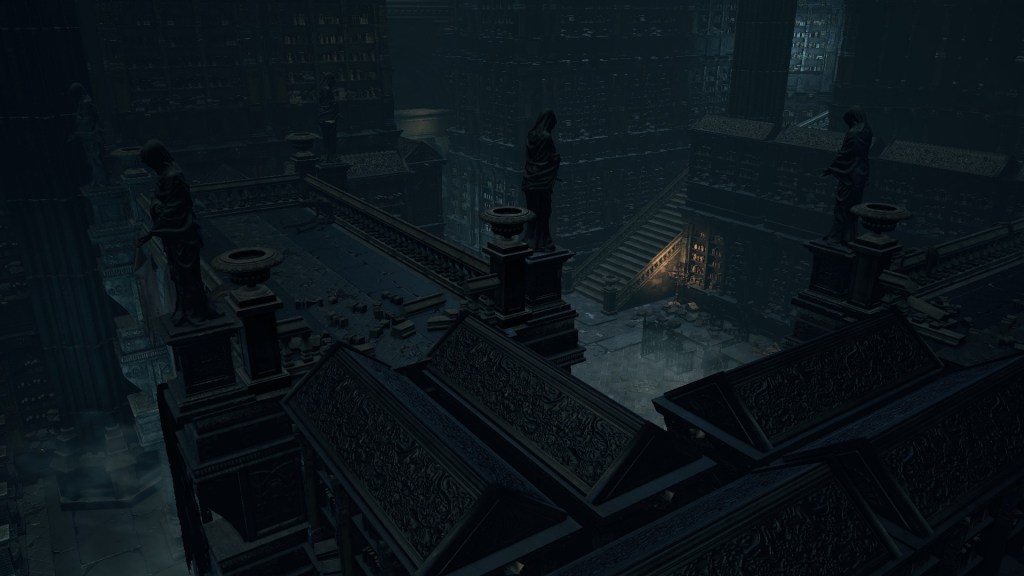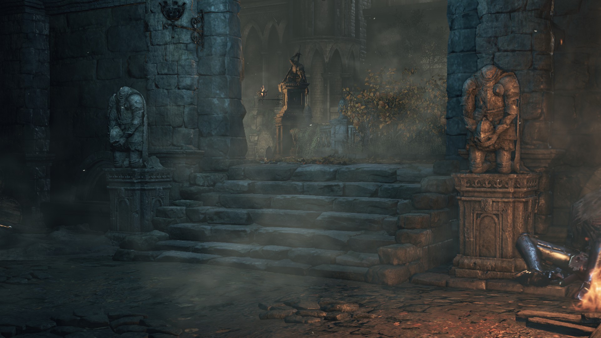 The bridge to the Grand Archives from the facilities for the Knight and High Priestess is ornamented with statues of the Scholar and a primordial serpent as an angel. Juxtaposing the two is a reminder to temper reason with piety, and the Knight holding his own head as the bridge’s centerpiece reinforces self-sacrificing obedience. Following the bridge are statues of the High Priestess and King flanking entry to the courtyard, another reminder of who truly lords over this place. Above them are gargoyles of the angelic King with torch in hand. To the side is a statue of a Scholar praying over a stone slab etched with text, both of which have been melted by the evident force he prays toward. These all signify the King and Scholar’s submission to holy flame.