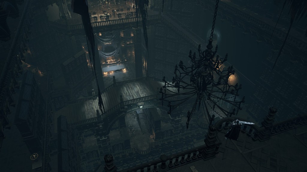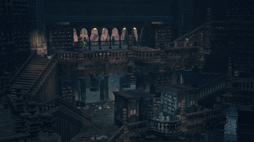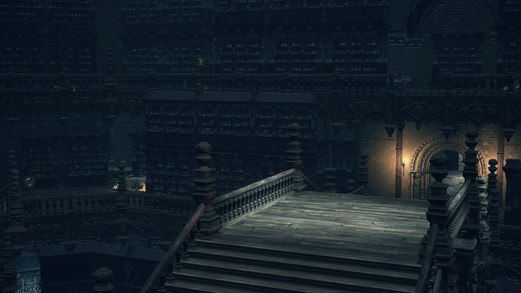 We can acquire Avelyn off a corpse accessed from atop the bookshelves. While an obvious reference to the Duke’s Archives from DS1, it suggests interest in studying the weapon’s impressive mechanical design. We already see the library employ mechanisms lowering bookshelves into the floor to reveal hidden spaces or open shortcuts. In one case, a shelf hides a chest containing a titanite slab, another marvel worth examining and especially worth protecting from robbers. Titanite scales are also plentiful in this area, three alone acquired from a chest and two more produced by a crystal lizard with no twinkling titanite. The latter suggests that these aren’t requisitioned from military stores but harvested from local lizards consuming souls, possibly in controlled experiments, before they grow to hulking size. Clearly, knowing everything there is to know about the universe fell within their domain, which would be valued by the royalty and thus may be why the Grand Archives has a direct bridge to the prince’s chambers.