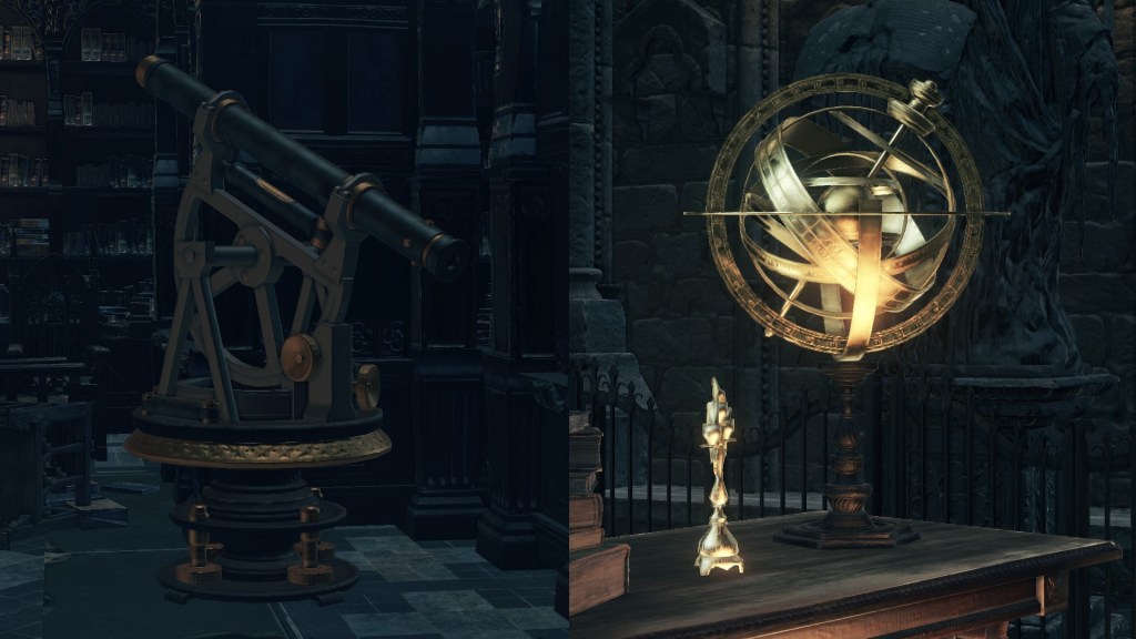 The third Pillar is the Scholar. As stated earlier, these “wise men” (賢者) were made masters of the kingdom’s largest library. These Grand Archives were the repository for all knowledge that Lothric had collected over the course of its long history, and it was the job of the scholars to preserve and study its vast contents. Why? To advise the king when appropriate. The building is covered with statues of the monarch holding a globe, historically a symbol of dominion over the world — and he must know the world to hold dominion over it. And so, ink on parchment wasn’t the only thing the scholars were surveying. Large telescopes and armillary spheres sit among the tables, candlesticks, and books scattered about the library. If the scholars are using astronomical tools to perform their own observations of the natural world, then their role isn’t limited to just reading up on others’ discoveries; not limited to just grander cosmological inquiries even.