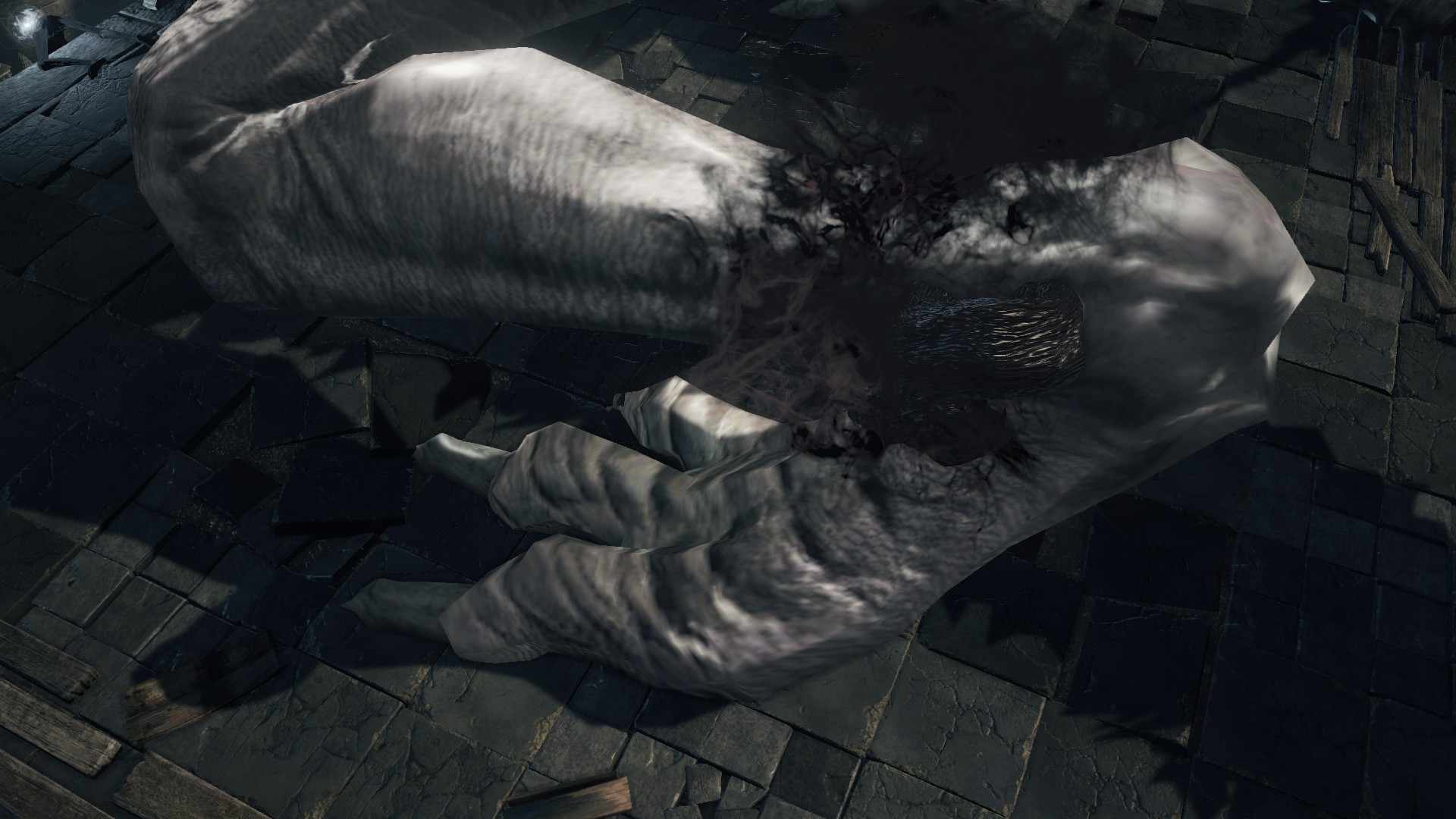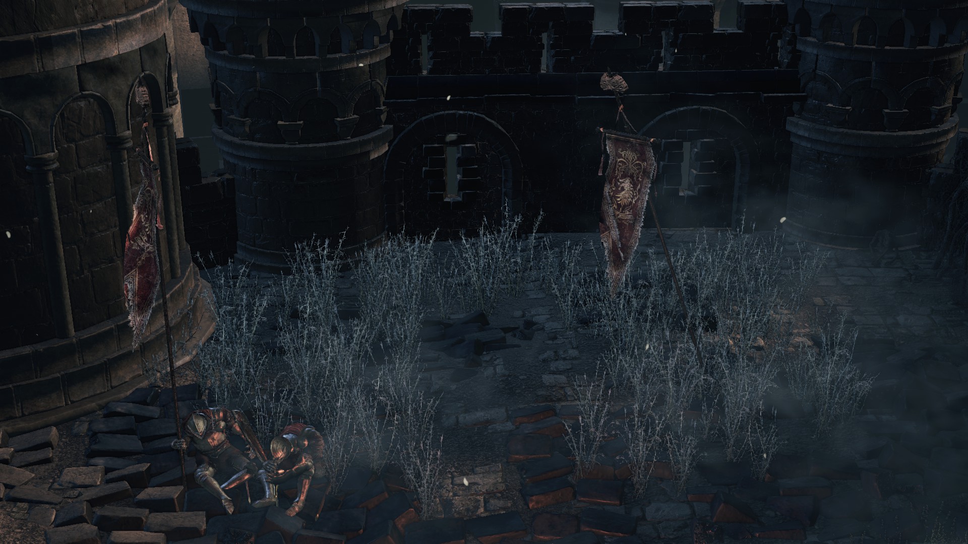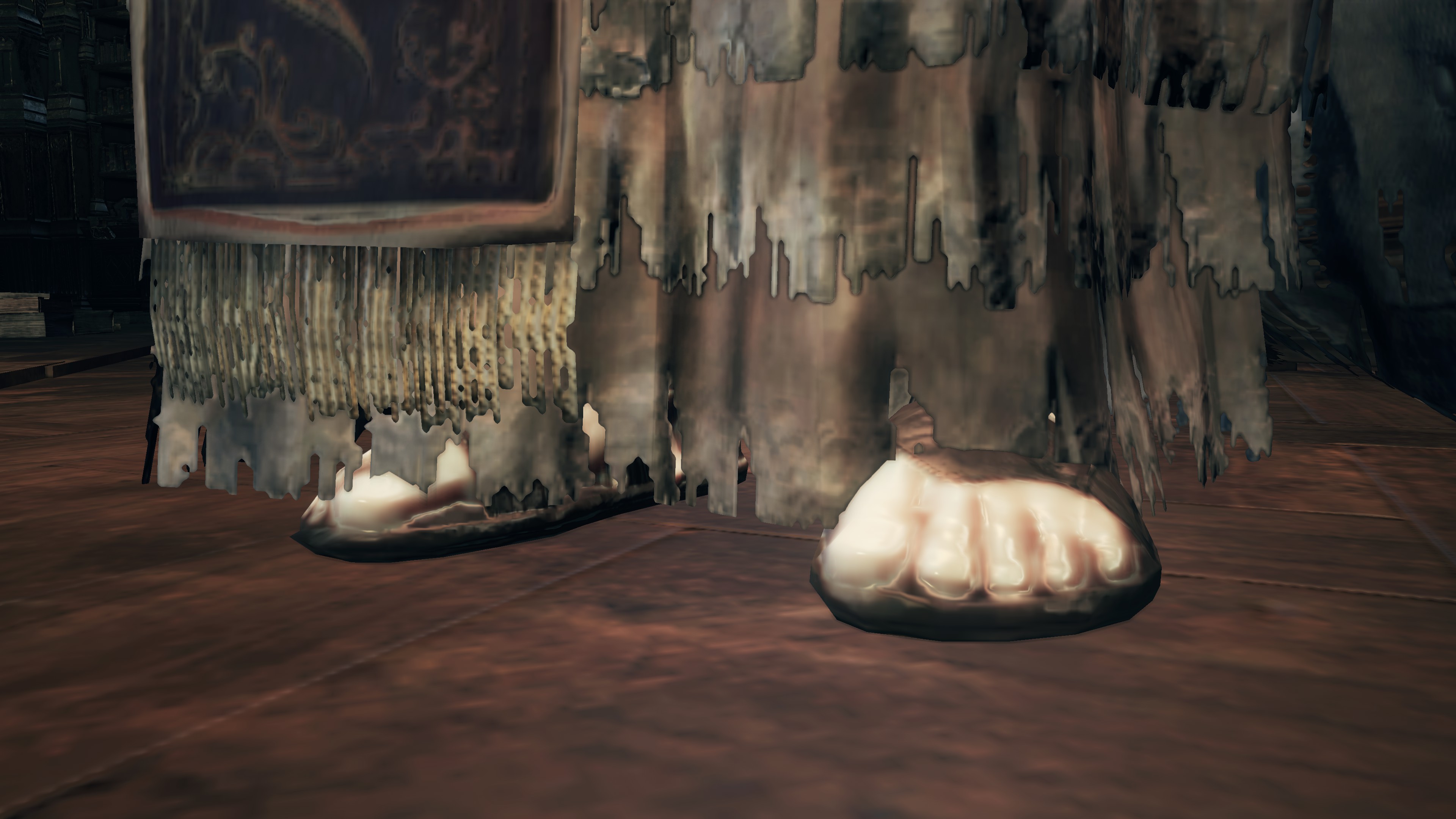 Upon arriving at the dragon training grounds, we come across trails in the stonework, as if something big and heavy crashed and slid against them. But following the trajectory, we find naught but a large patch of dendrification grass — too large for one human, though perfectly-sized for one “steed” shot down from the skies. Further in, two more wyverns harass us with fire breath, one initially seeming dead while the other flies in after previously harassing us the same at the High Wall. The white and yellow pair are resolute to prevent any push forward, only to go limp like dolls when the pus of man bursts forth from their feet at our approach. Humanity is clearly consuming their souls and stagnating their bodies, but why are wyverns bearing dark souls to begin with? Because they were originally men.