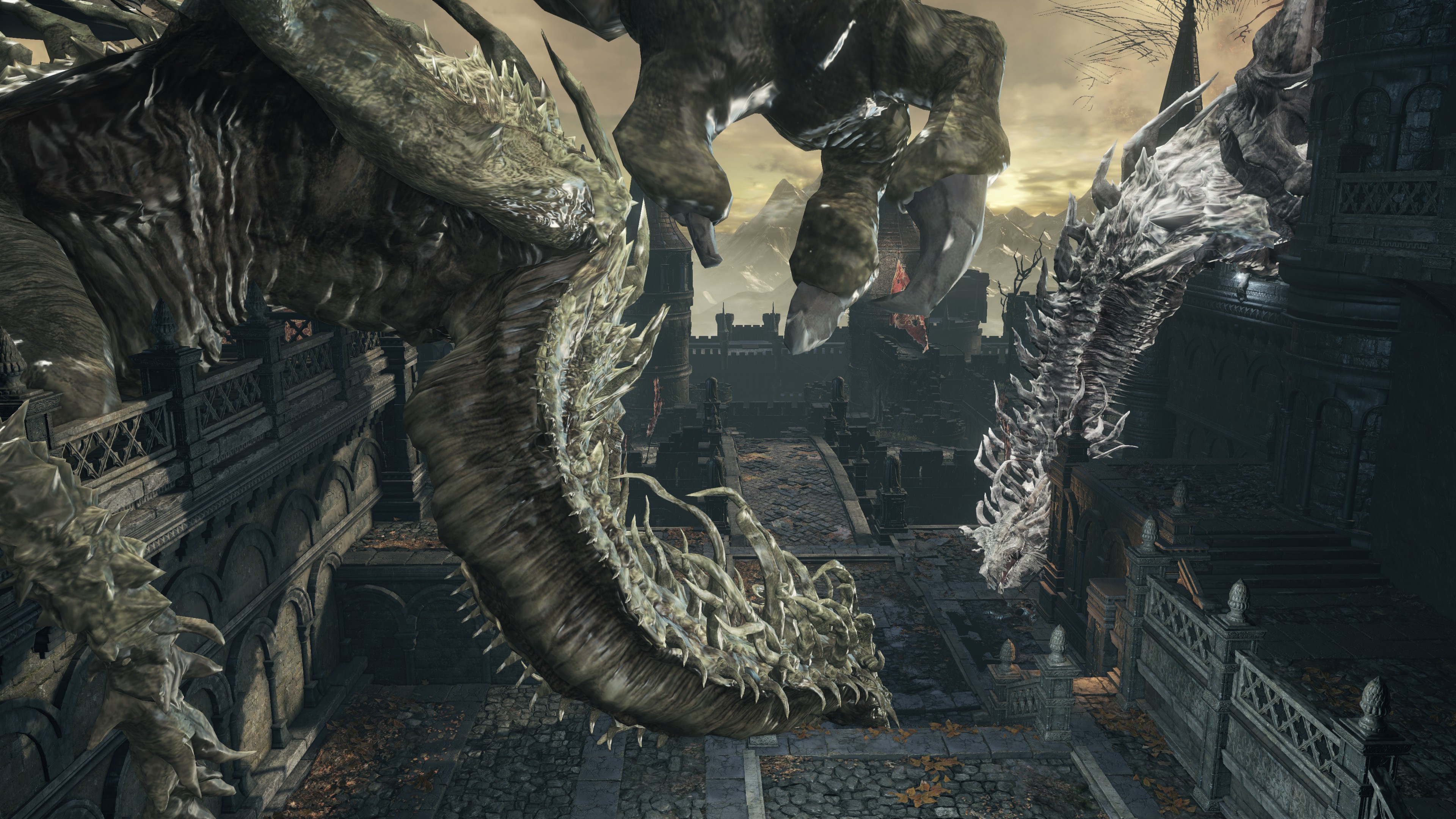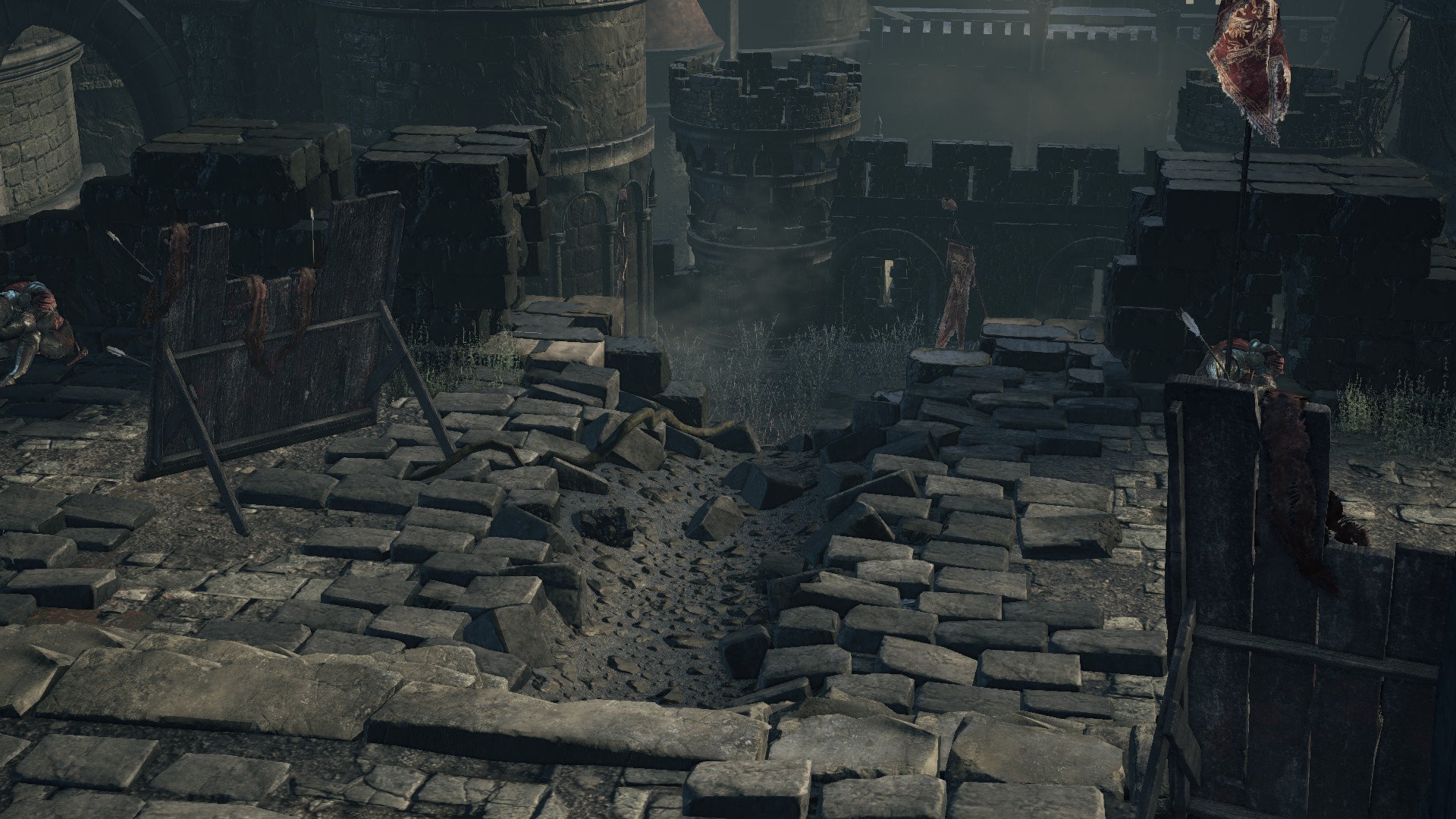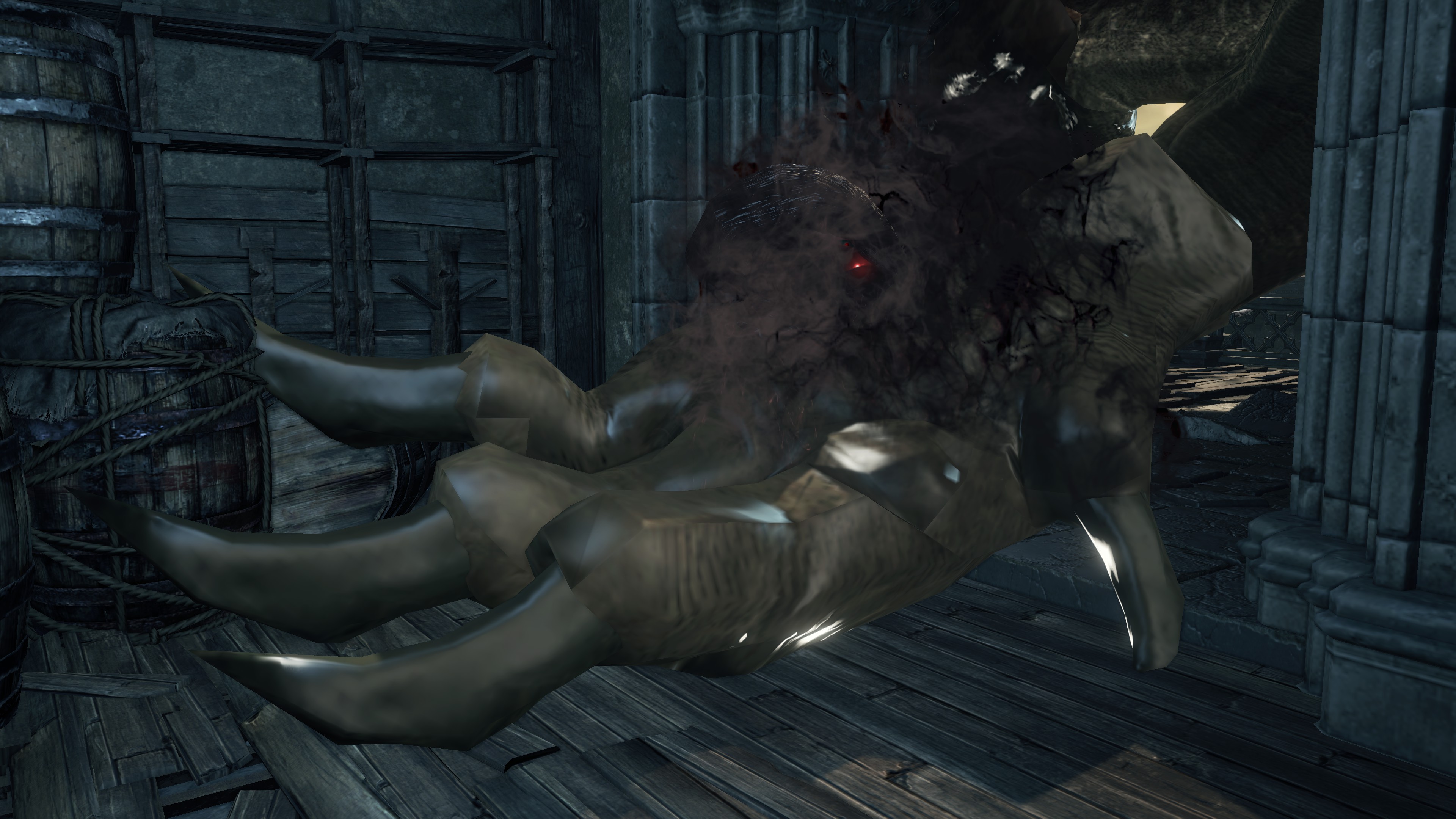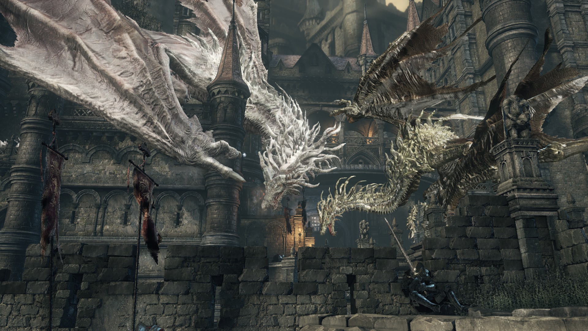 Upon arriving at the dragon training grounds, we come across trails in the stonework, as if something big and heavy crashed and slid against them. But following the trajectory, we find naught but a large patch of dendrification grass — too large for one human, though perfectly-sized for one “steed” shot down from the skies. Further in, two more wyverns harass us with fire breath, one initially seeming dead while the other flies in after previously harassing us the same at the High Wall. The white and yellow pair are resolute to prevent any push forward, only to go limp like dolls when the pus of man bursts forth from their feet at our approach. Humanity is clearly consuming their souls and stagnating their bodies, but why are wyverns bearing dark souls to begin with? Because they were originally men.