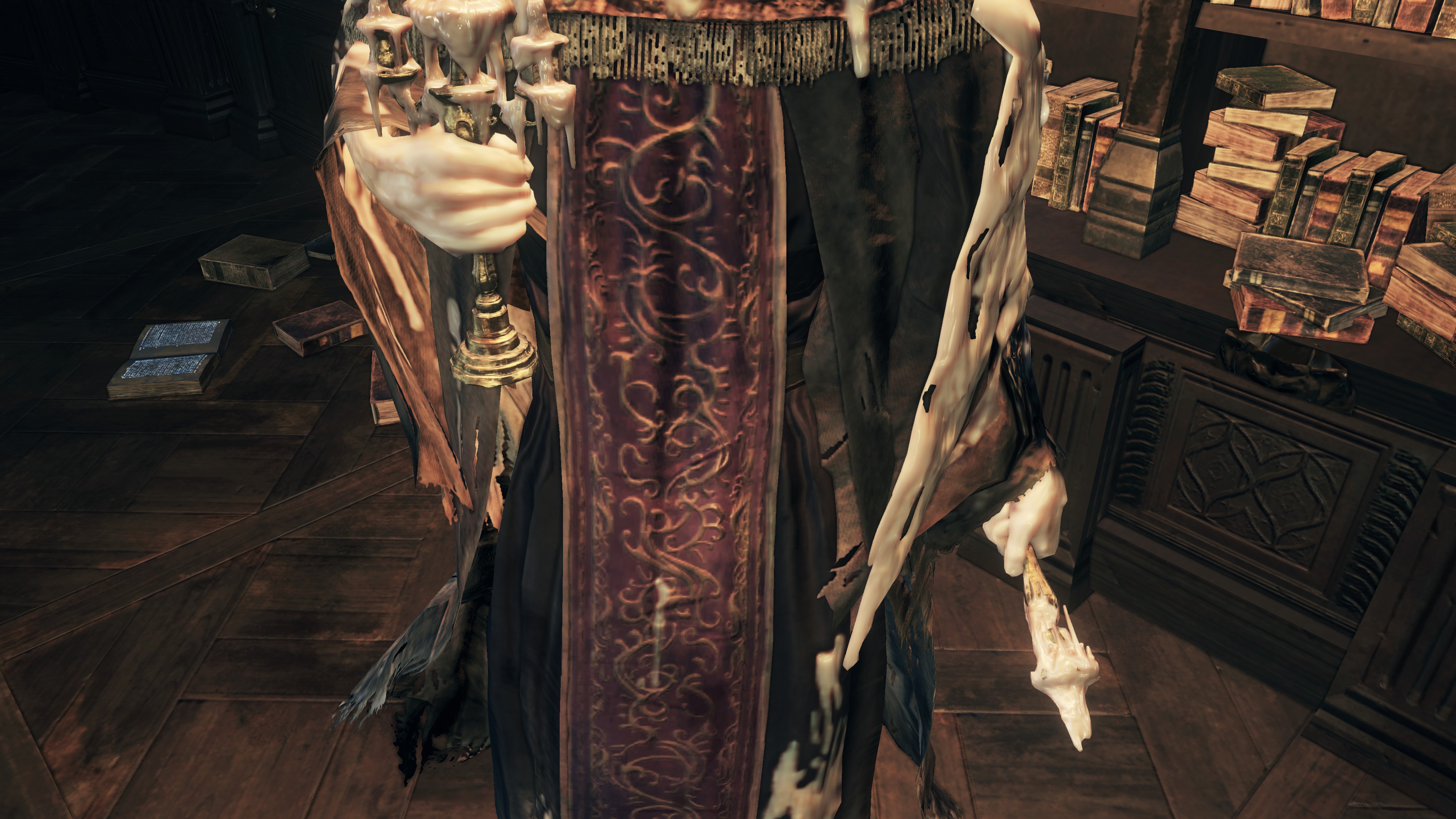 It is no surprise then that this prompted an alliance between the other two Pillars. The Knight needed its own magical edge to counteract the power of the Scholar. At the same time, the High Priestess needed a more weighty offense to counterbalance its own vulnerabilities. It was in both Pillars’ best interests to combine their strengths as a bulwark against the knowledge and power of the Scholar — adding Magic Barrier to their arsenal was likely also to this end. And their combined influence has come bearing down. The scholar robes incorporate elements from the High Priestess hanging cloth, and they each dip their bodies in candle wax and let it dry. This makes them look like walking candles, some even lighting wicks atop their heads, but they also carry around daggers covered in wax so that the hilts double as candlesticks. These gestures serve a practical purpose for their work, the weapon boosting sorceries and used by them as a sorcery catalyst, but the underlying symbolism is clear.