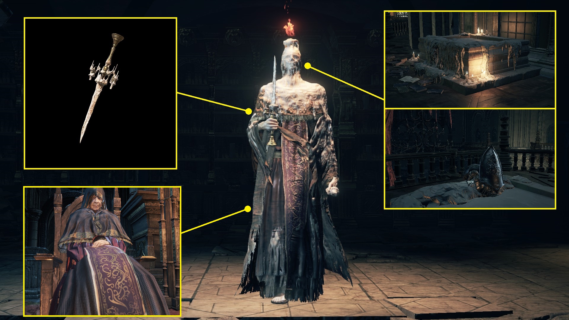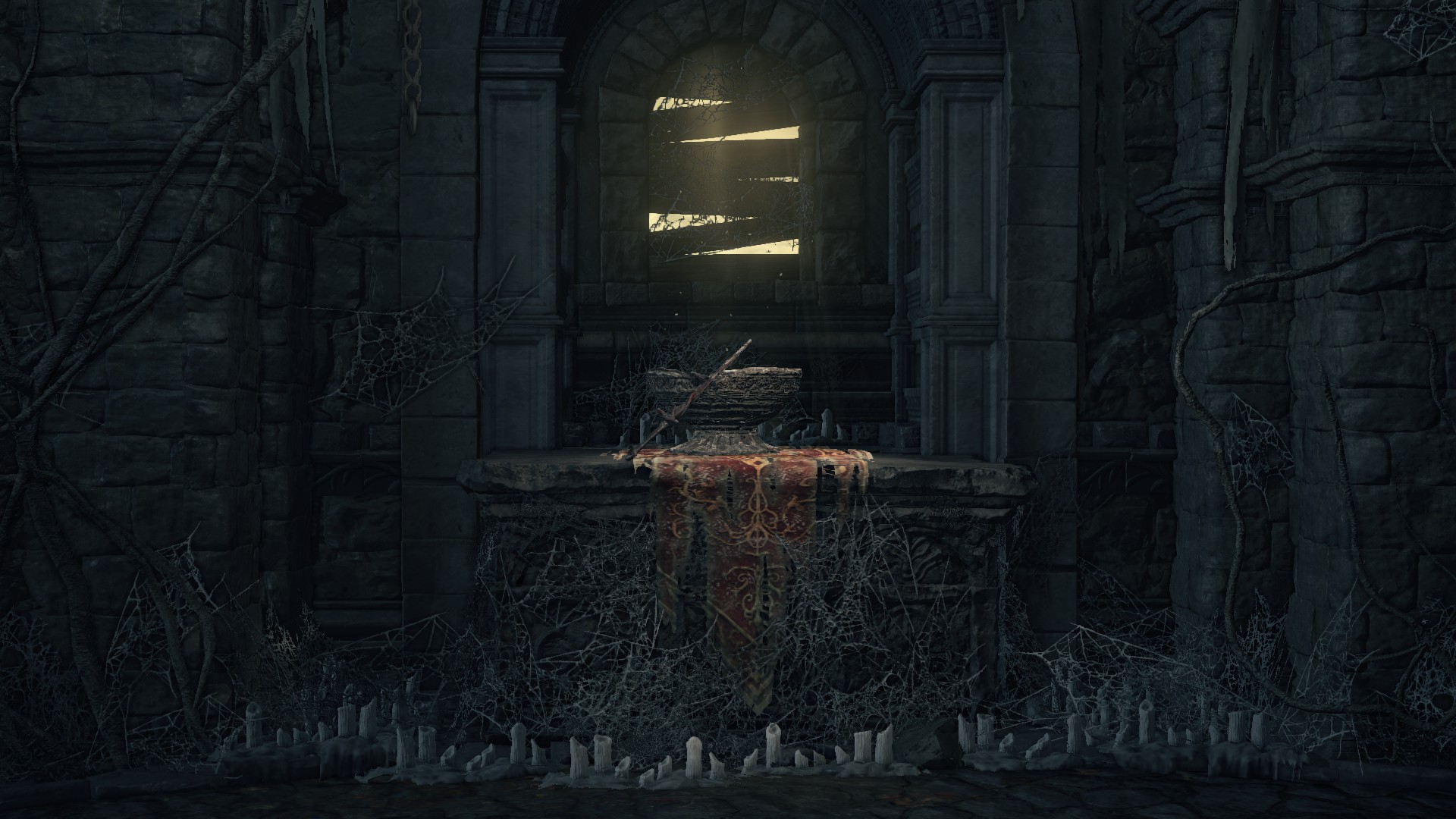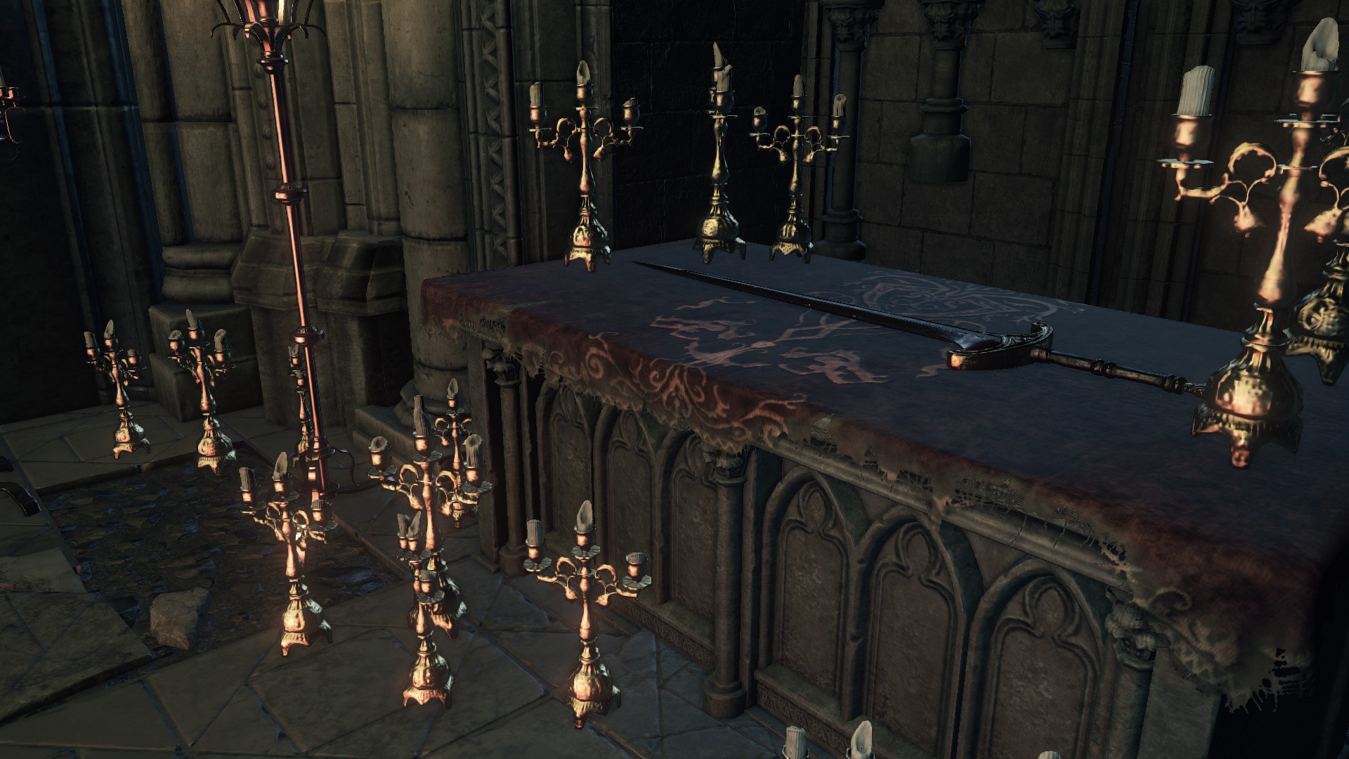 The chief ritualists appear to have blessed all the knights’ weapons, their swords on altars flush with candelabras in the holy women’s chambers and the church tomb. The latter in particular was seemingly collected from its owner as the corpse was prepared for burial. Why ceremonialize such weapons if not to apply, or reapply, a blessing? Since the arms don’t manifest any holy power by default, we can assume that these rituals are what allow the knights to cast Blessed Weapon on them without a miracle catalyst. Indeed, the Lothric War Banner can conjure an illusion of the long-gone flag which knights raised to inspire comrades in the kingdom’s early history, seemingly reconstructing an imprint in time through just innate holiness. These peculiar kinds of blessings make Knight all the more dependent on faith and scripture from the High Priestess, bolstering cooperation between the two Pillars even further.