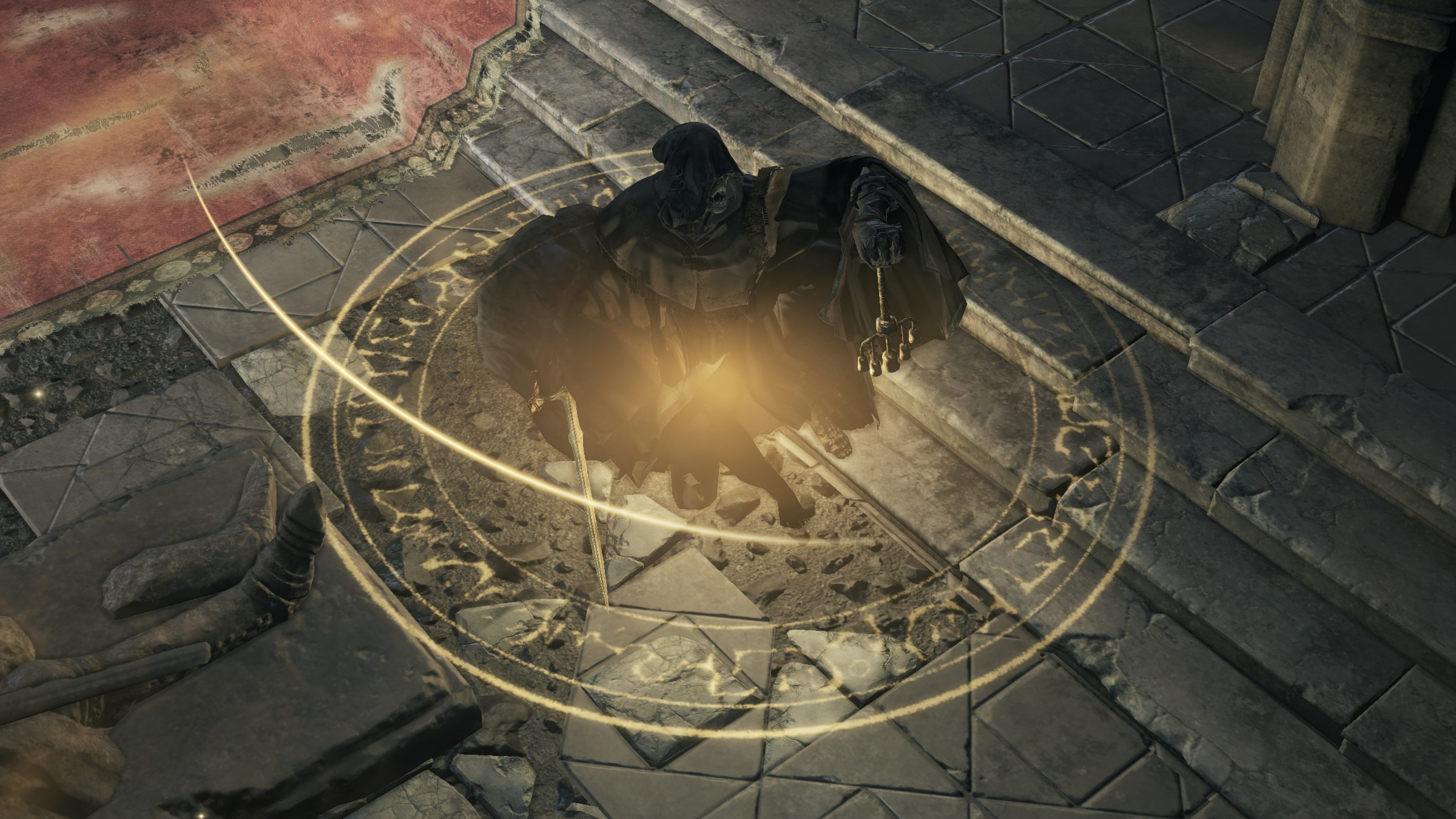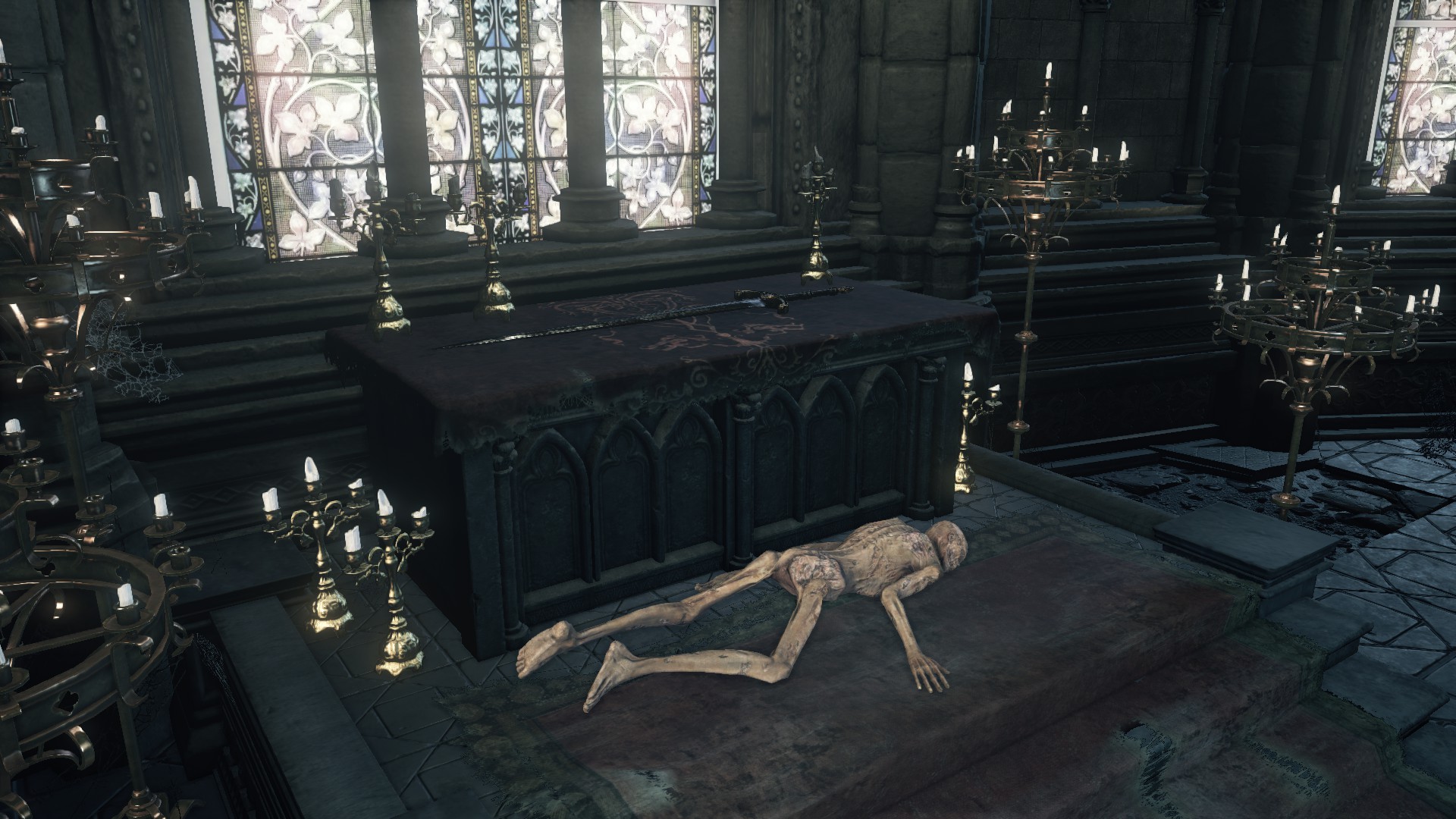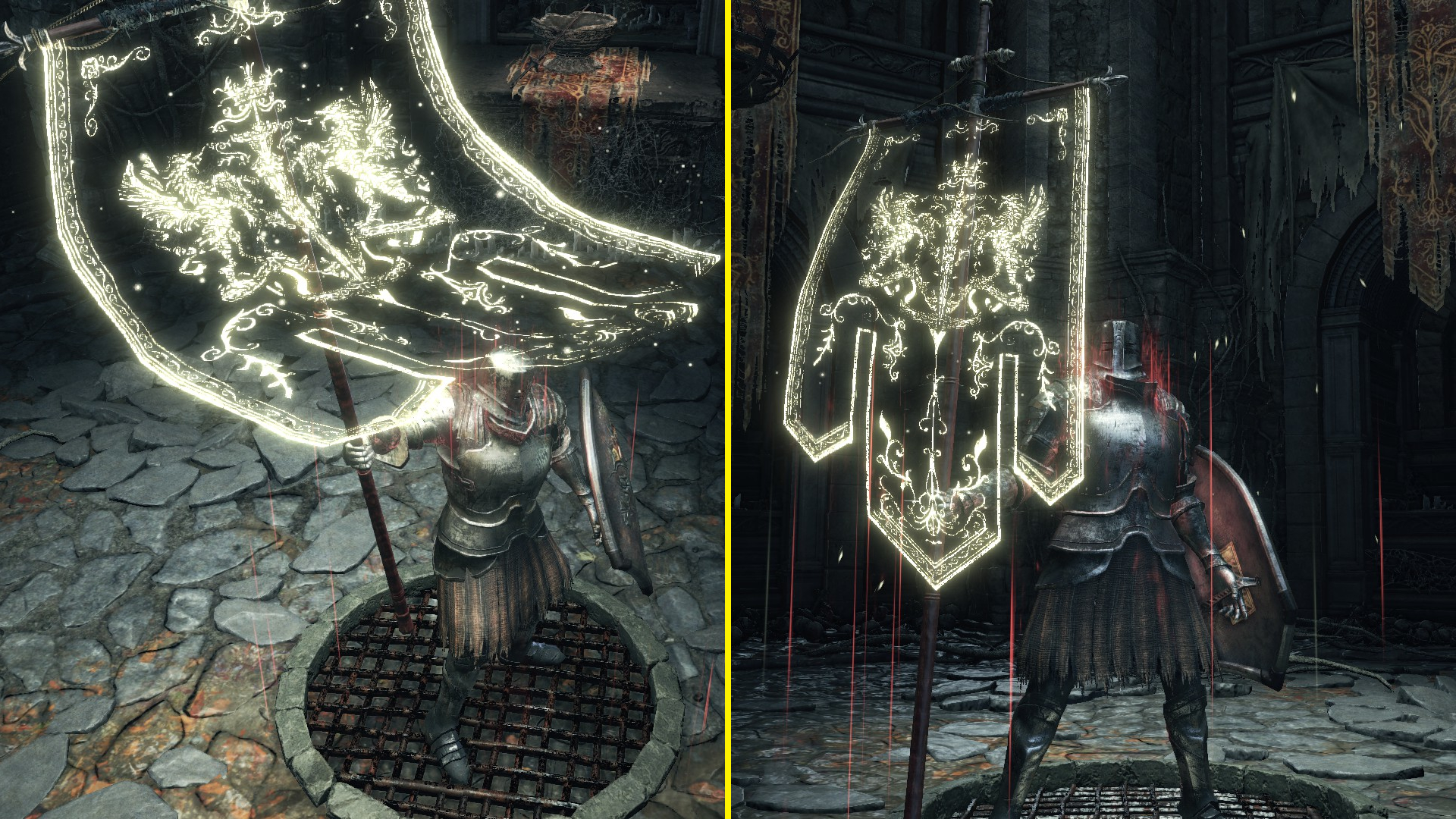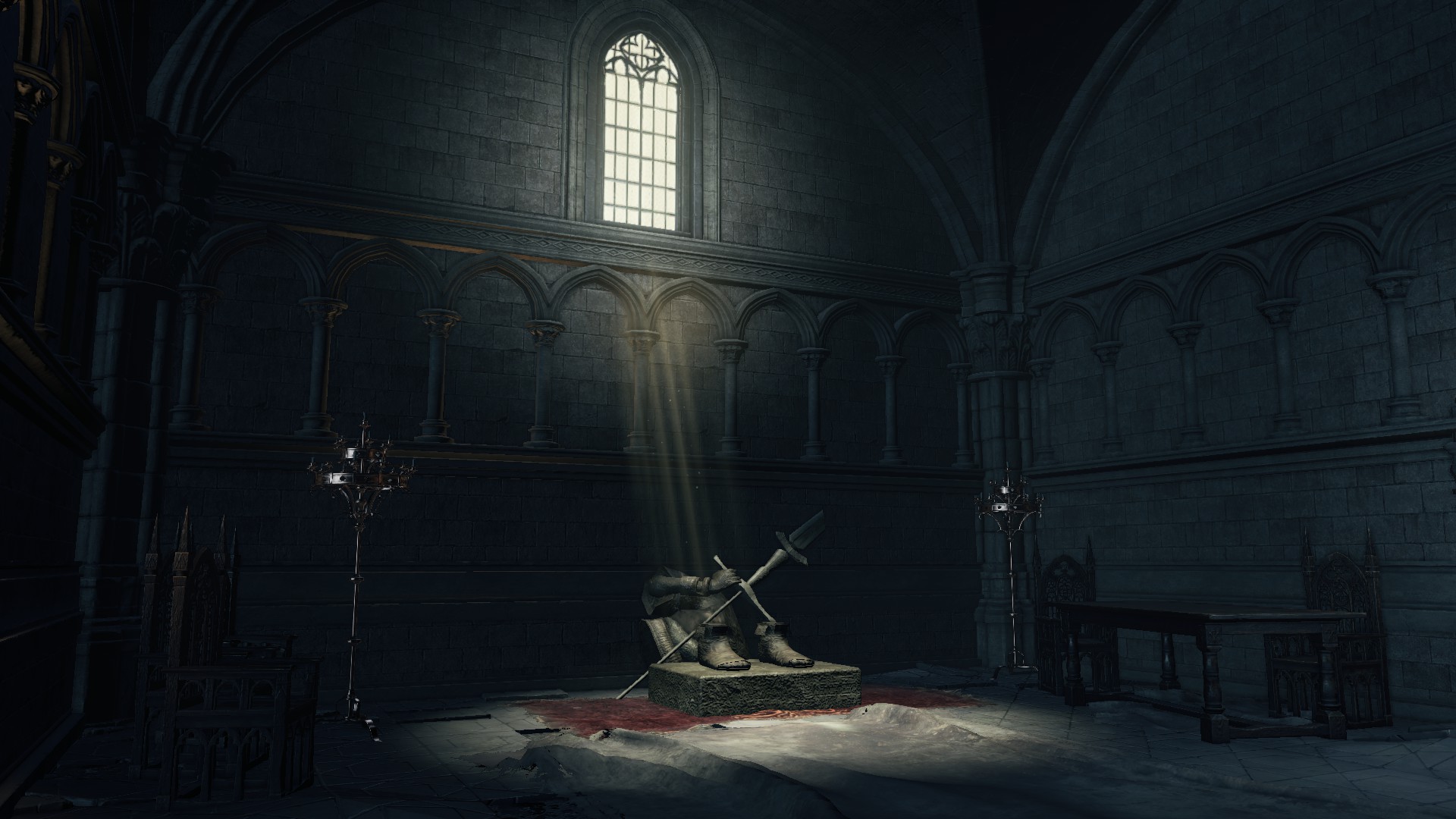 The chief ritualists appear to have blessed all the knights’ weapons, their swords on altars flush with candelabras in the holy women’s chambers and the church tomb. The latter in particular was seemingly collected from its owner as the corpse was prepared for burial. Why ceremonialize such weapons if not to apply, or reapply, a blessing? Since the arms don’t manifest any holy power by default, we can assume that these rituals are what allow the knights to cast Blessed Weapon on them without a miracle catalyst. Indeed, the Lothric War Banner can conjure an illusion of the long-gone flag which knights raised to inspire comrades in the kingdom’s early history, seemingly reconstructing an imprint in time through just innate holiness. These peculiar kinds of blessings make Knight all the more dependent on faith and scripture from the High Priestess, bolstering cooperation between the two Pillars even further.
